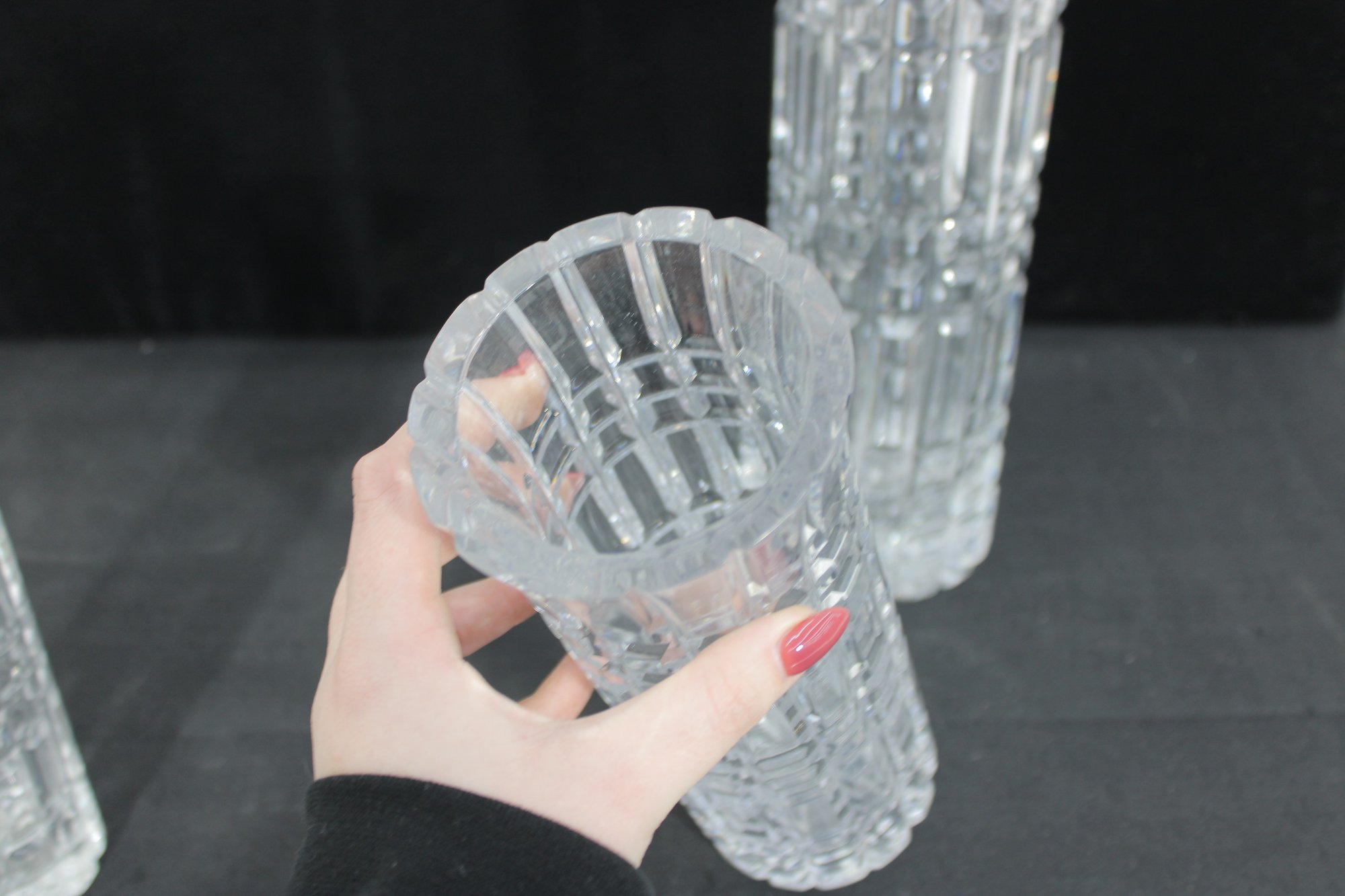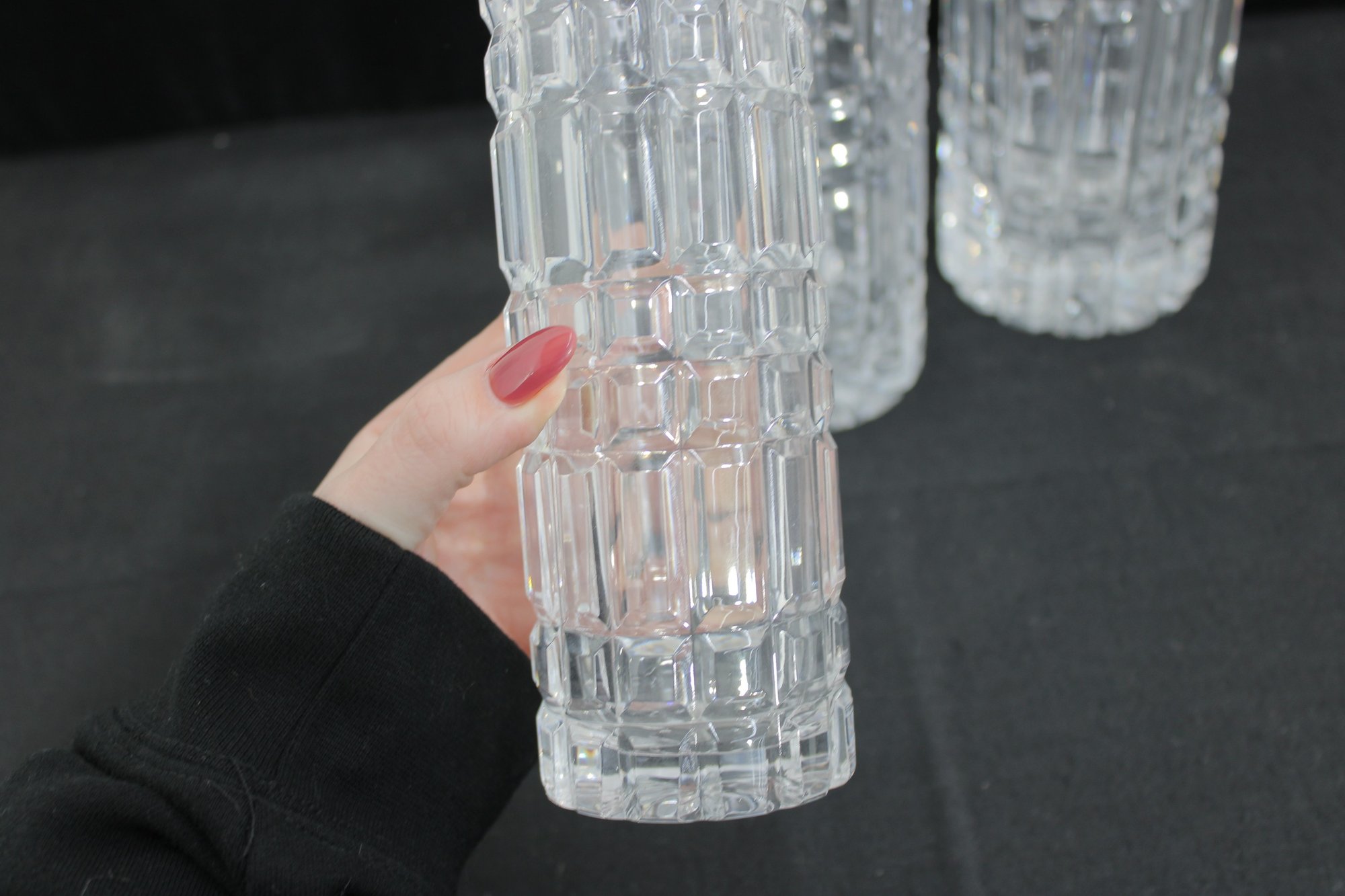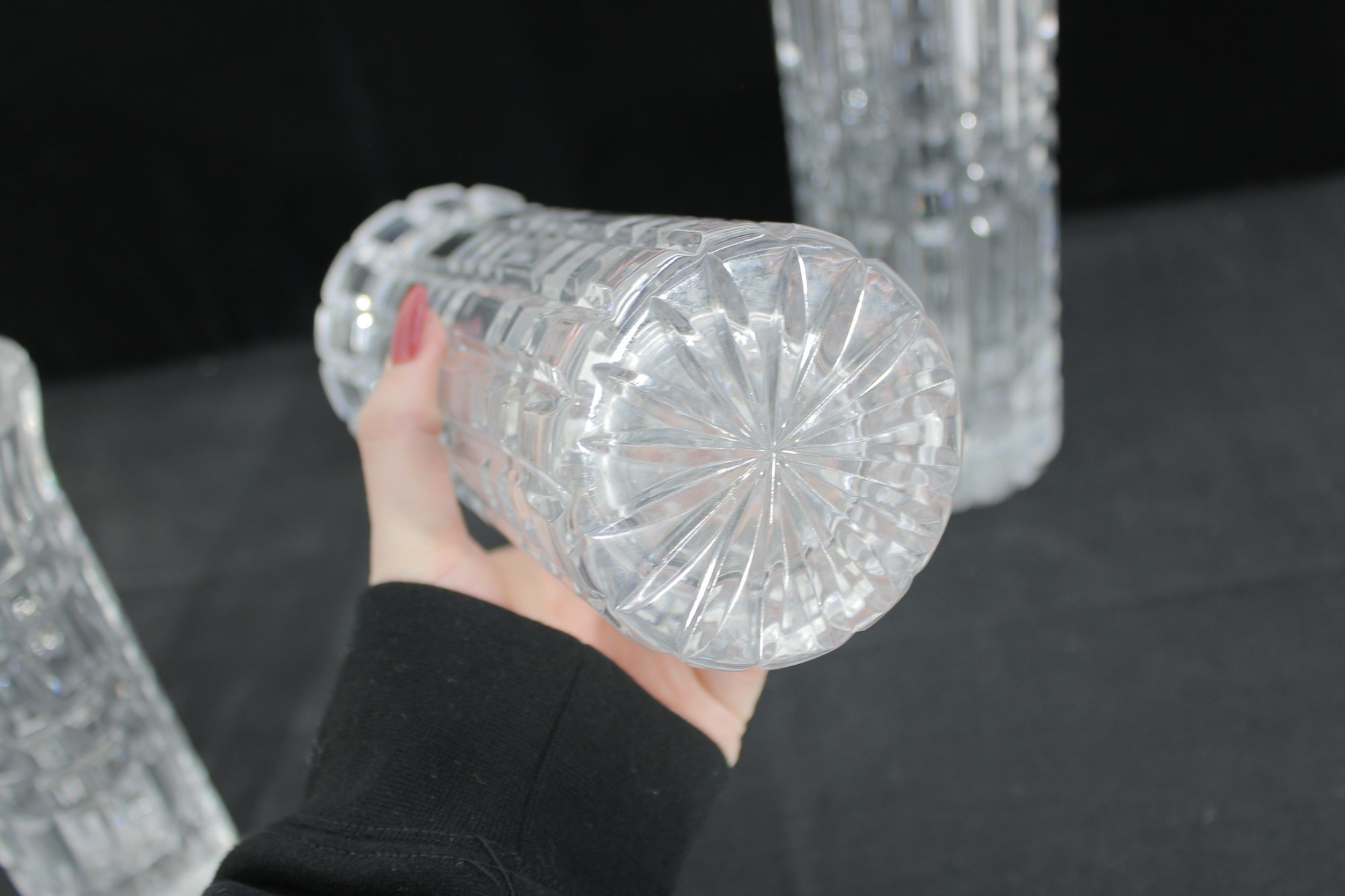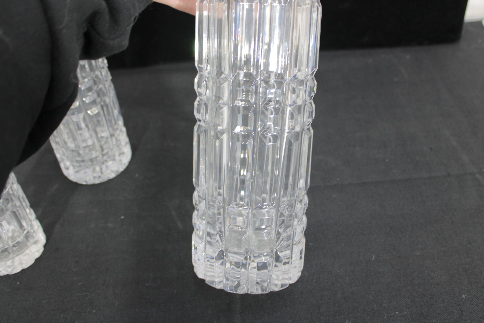 Each vase showcases a striking geometric cut pattern with vertical and horizontal facets that catch and reflect the light beautifully. The flared rims and thick bases give these pieces a substantial, high-quality feel.