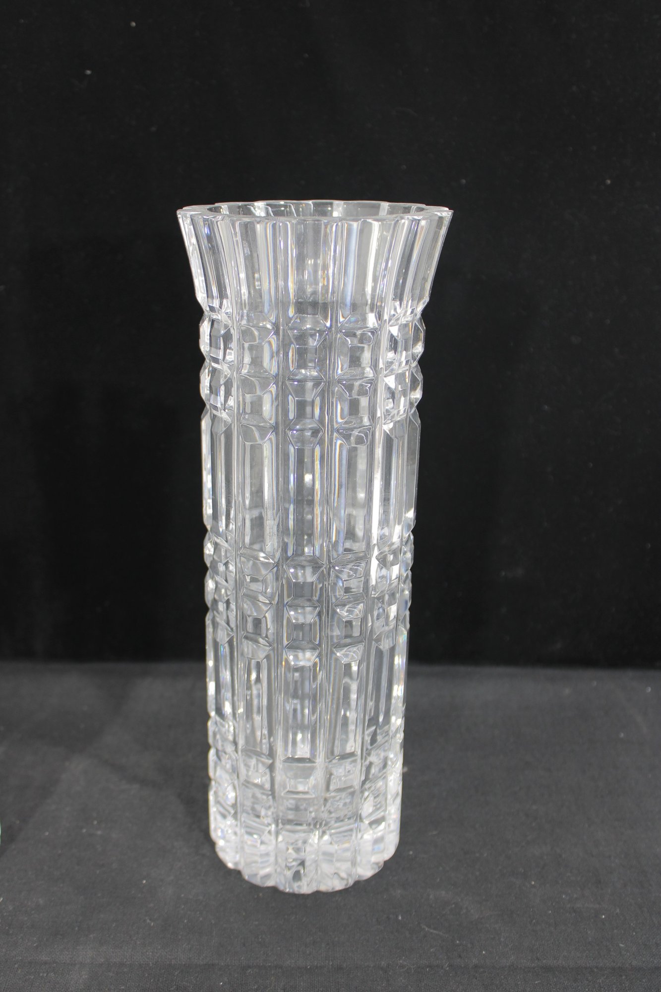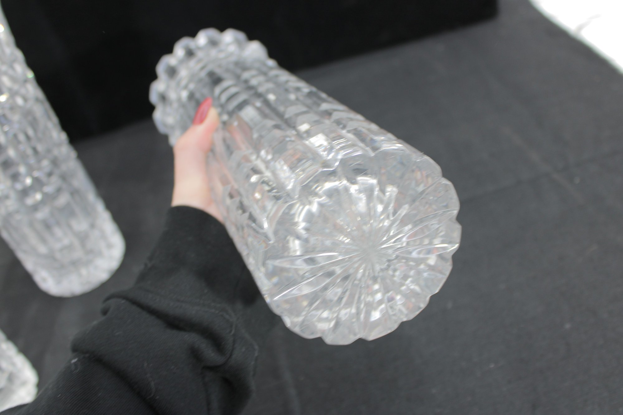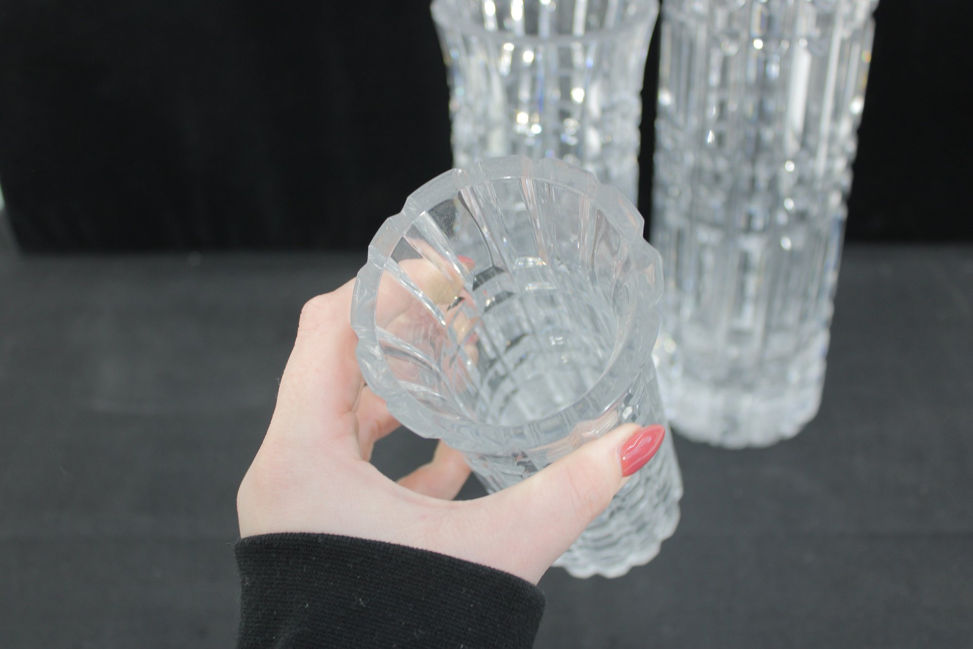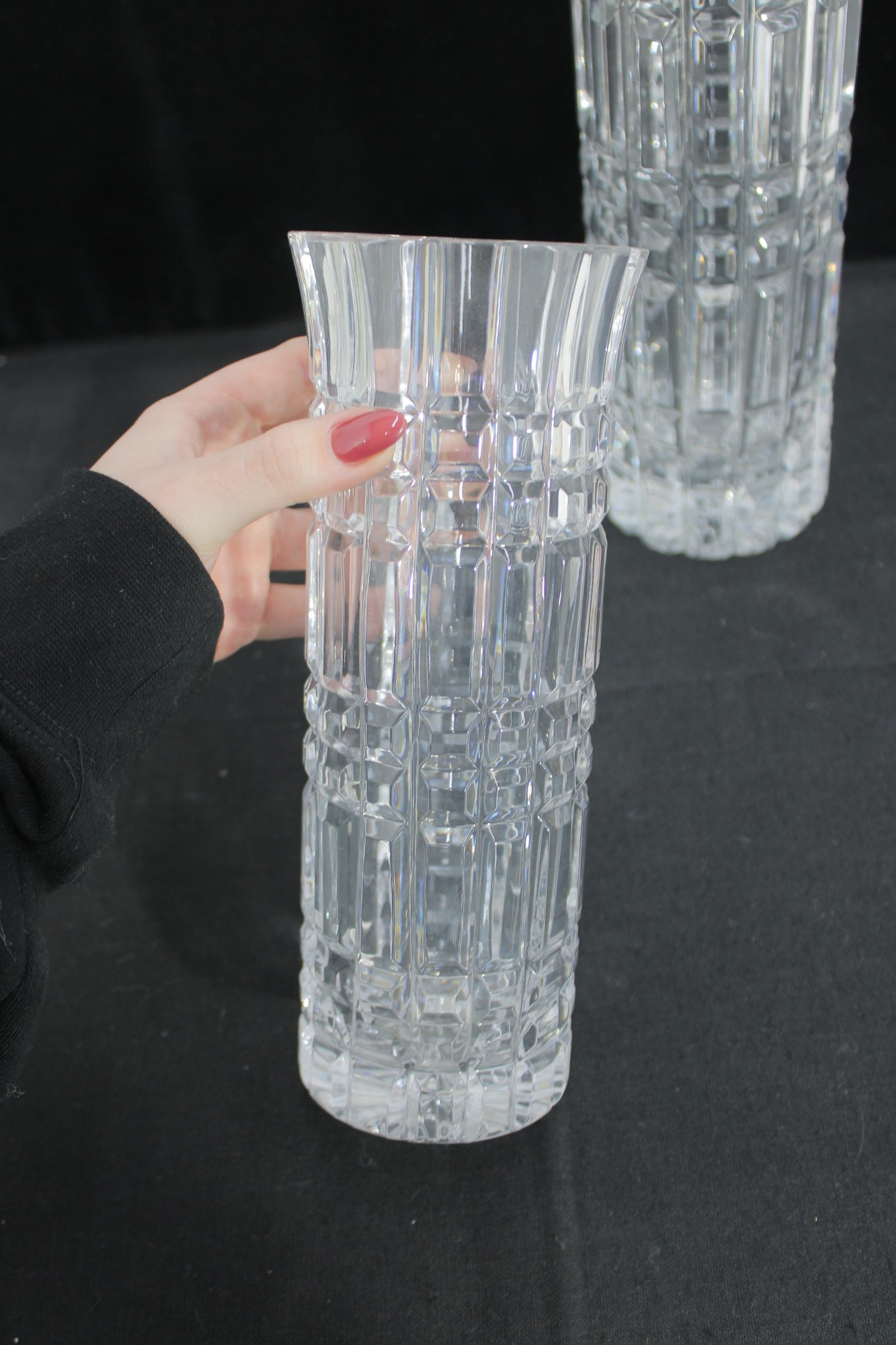 Each vase showcases a striking geometric cut pattern with vertical and horizontal facets that catch and reflect the light beautifully. The flared rims and thick bases give these pieces a substantial, high-quality feel.
