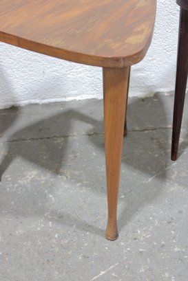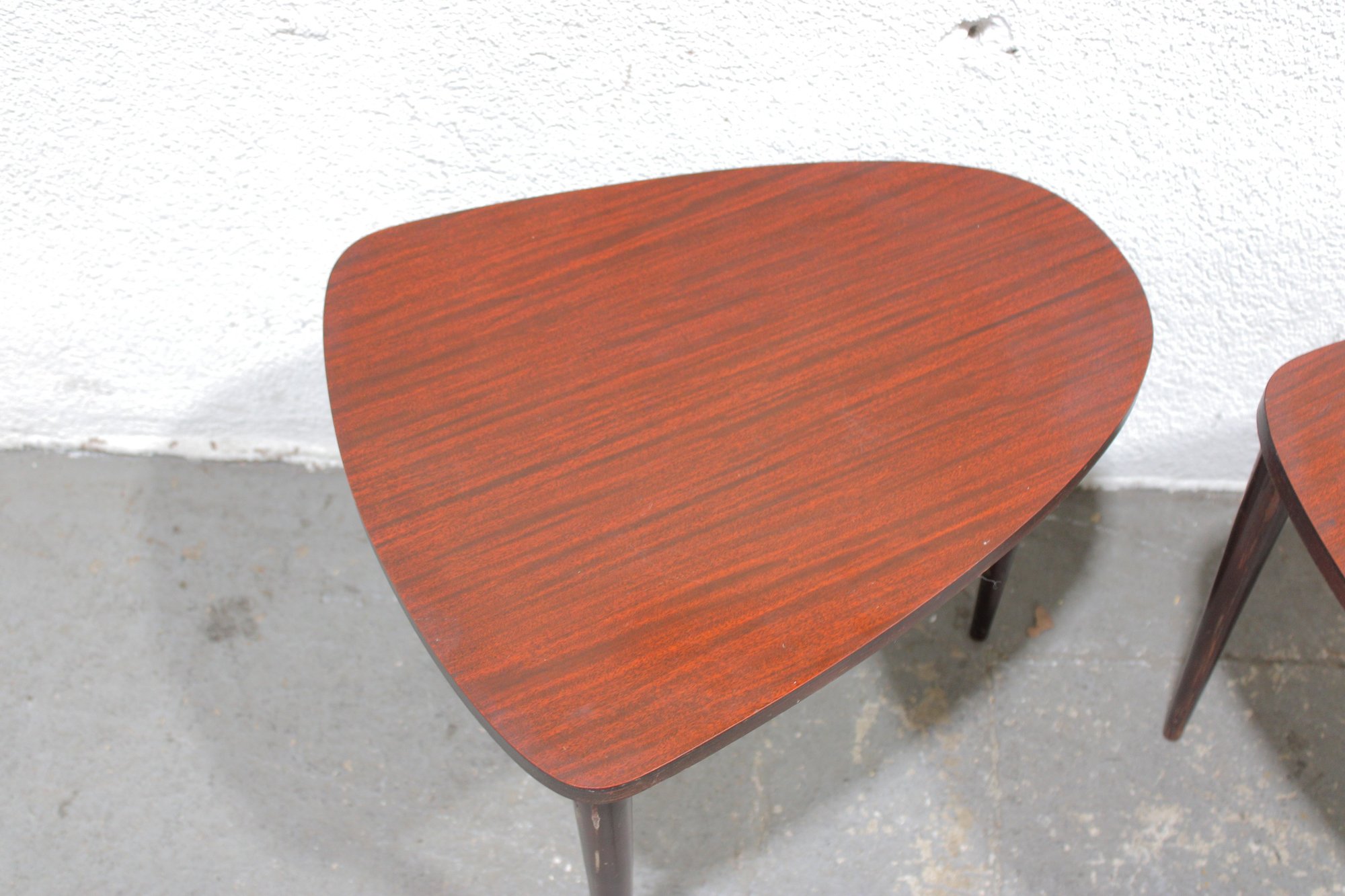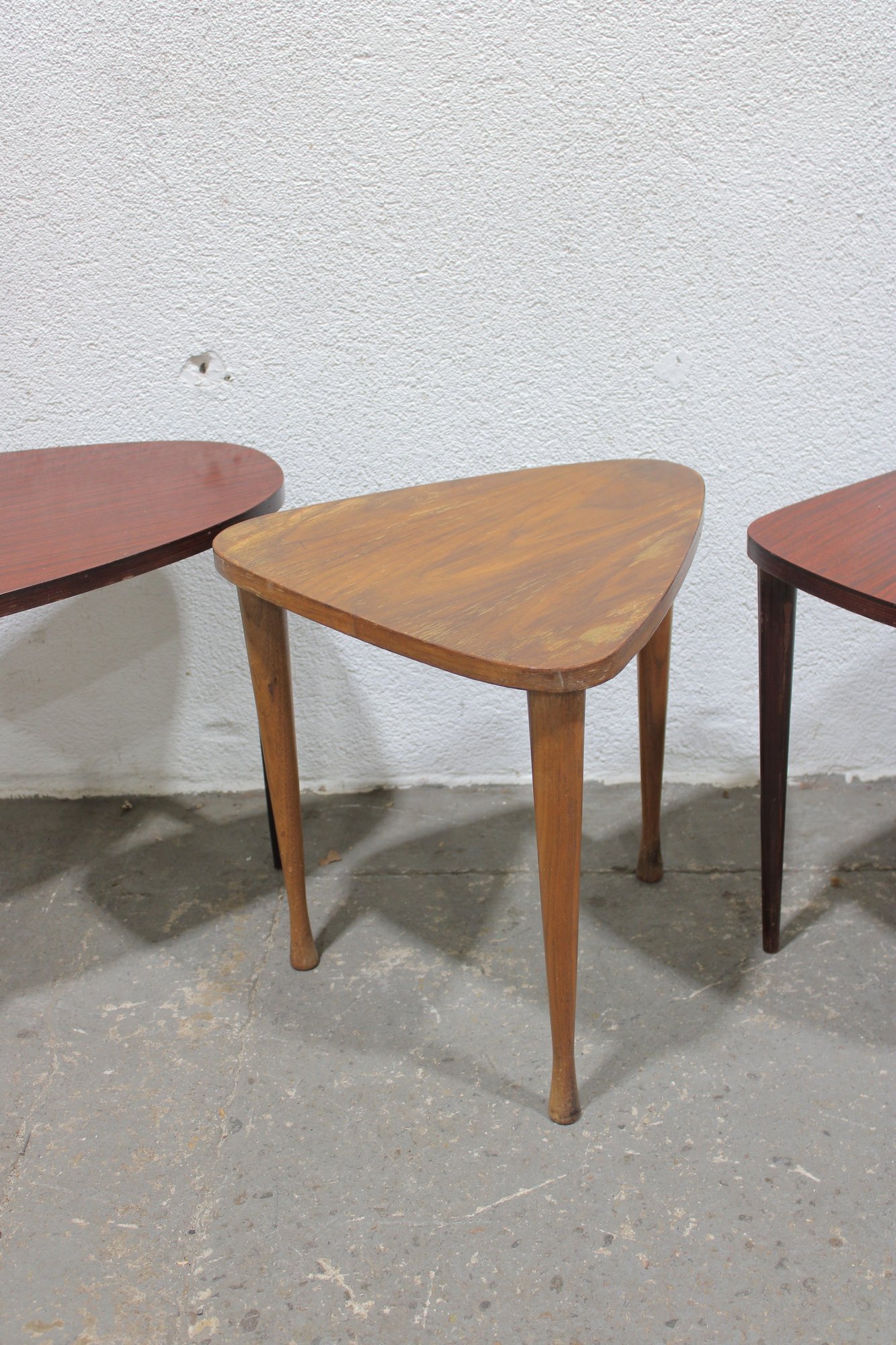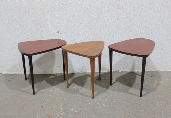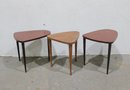 Each table has a unique triangular top with softly rounded edges, showcasing beautiful wood grain variation. The slender tapered legs give them an elegant, lightweight appearance typical of Scandinavian modern design. The set includes three tables that can be used together or separately as side tables, plant stands, or accent pieces.