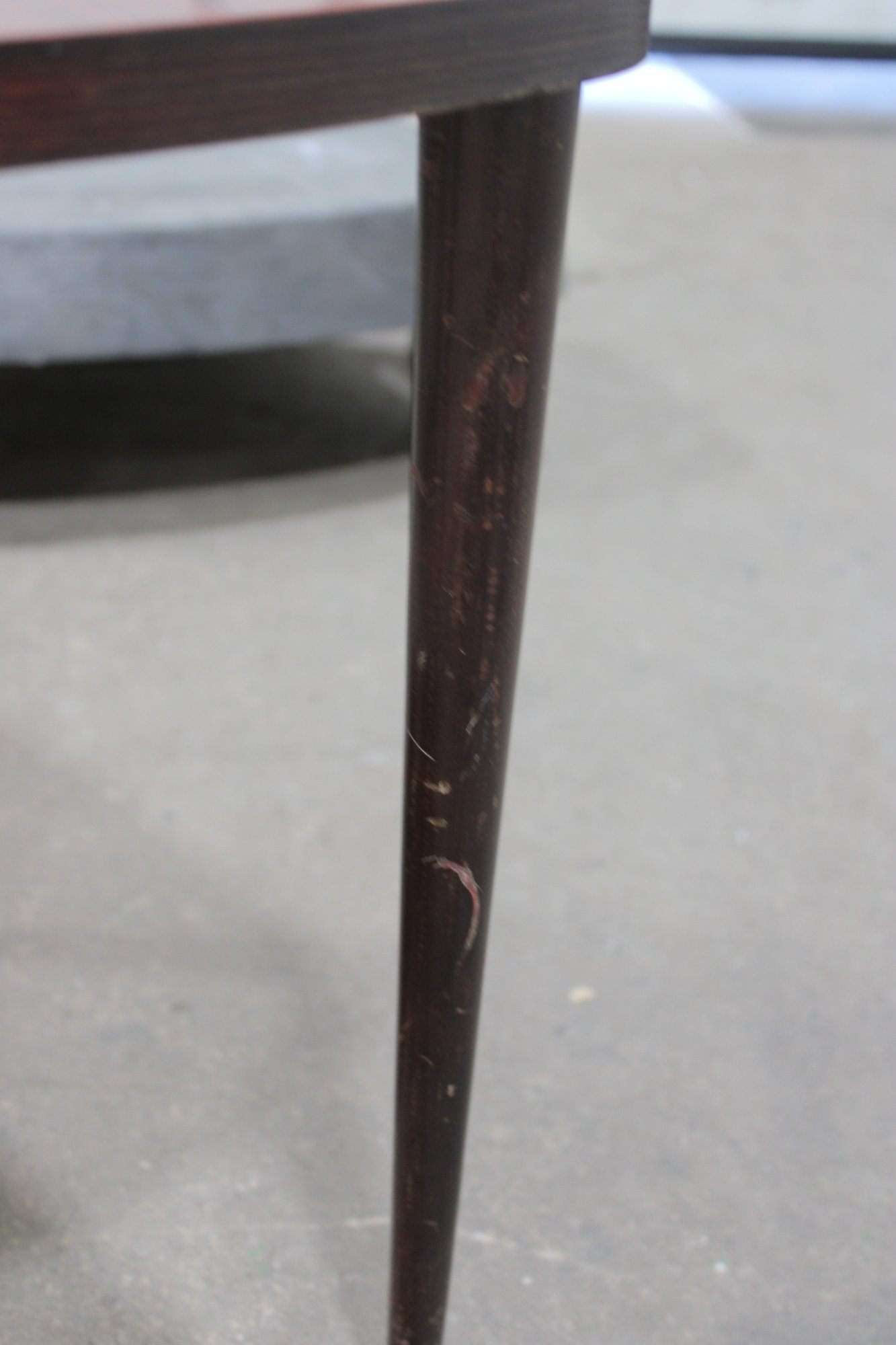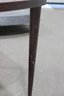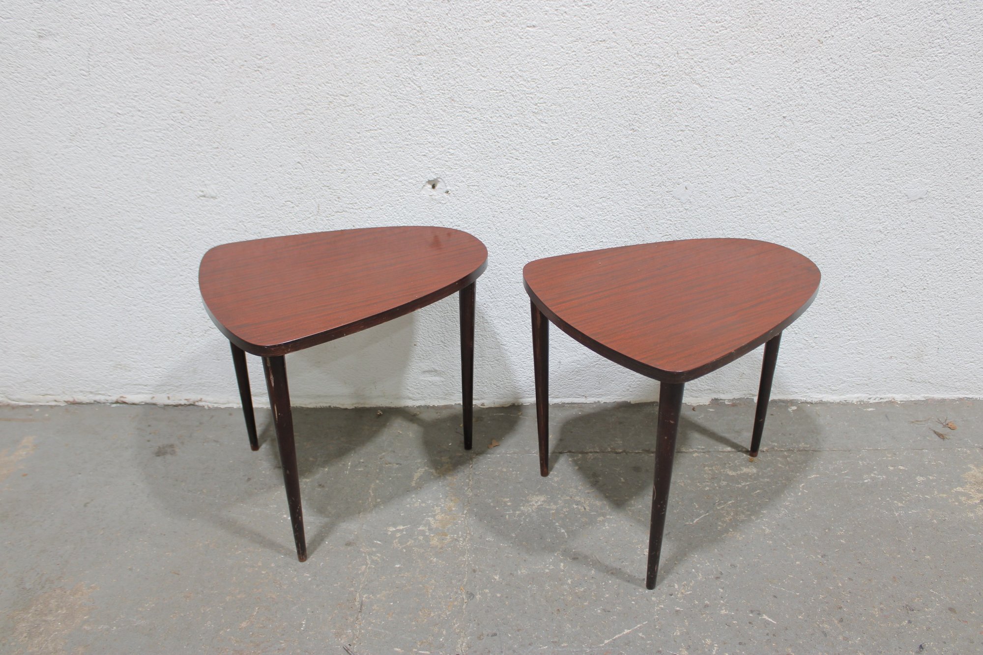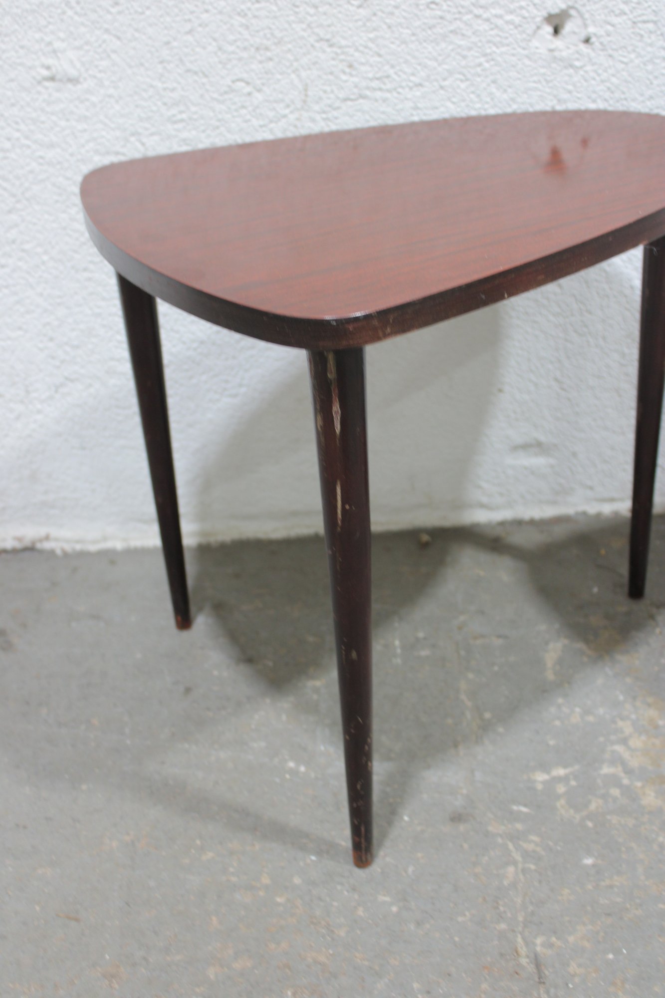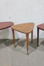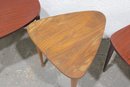 set of three Danish Modern style triangular side tables, attributed to the design style of Johannes Aasbjerg. These mid-century inspired pieces feature classic organic shapes, tapered legs, and warm teak wood tones.