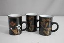 "Set Of 3 Hand-Painted Ceramic Mugs - 4 H - Black With Floral Designs"