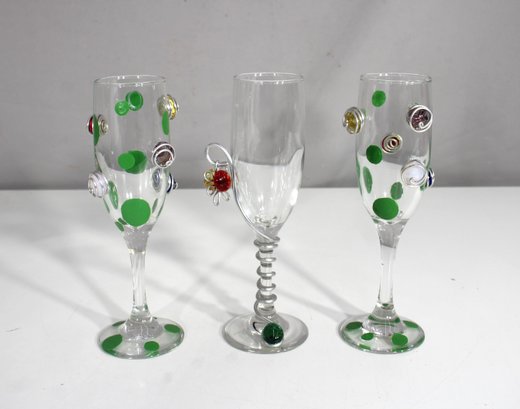 Two flutes are decorated with bright green polka dots and adorned with colorful swirl wire accents and gem-like embellishments. The third glass features a sculptural spiral stem and a charming flower motif made from wire and a vivid red and yellow glass bead.