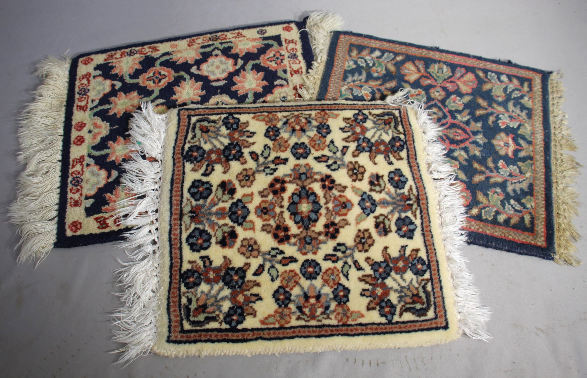Each rug measures approximately 12" x 13" and features intricate floral patterns in rich, vibrant colors. These small mats are perfect for adding a touch of elegance to any space, whether used as table mats, wall hangings, or accents on furniture.