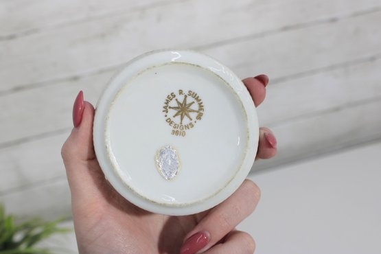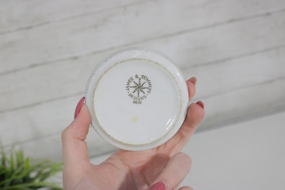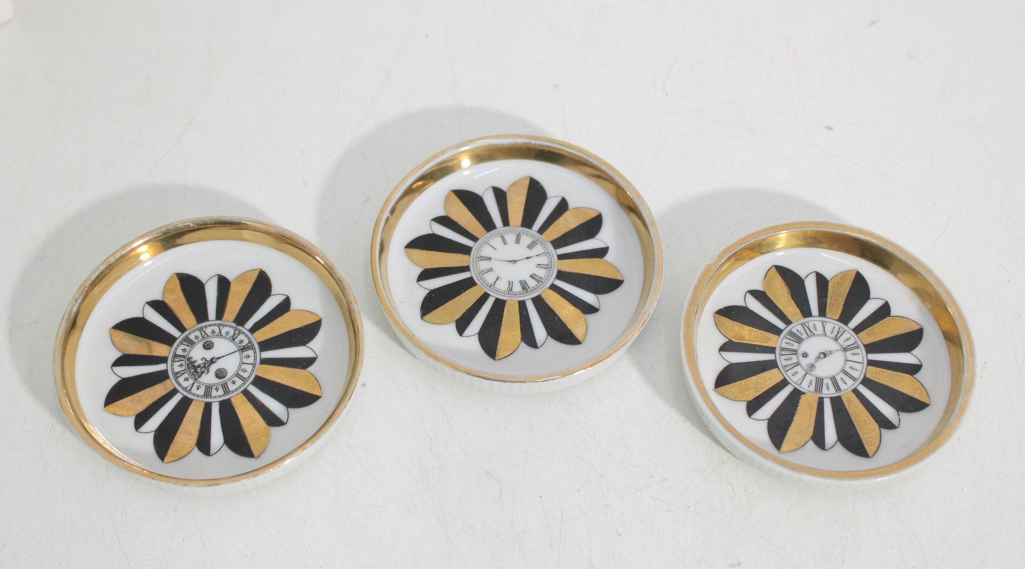 Stylish set of three ceramic coasters designed by James R. Summers, featuring a bold mid-century modern sunburst clock motif. The design combines black, white, and gold tones with a classic atomic-era aesthetic, making these both functional and decorative.