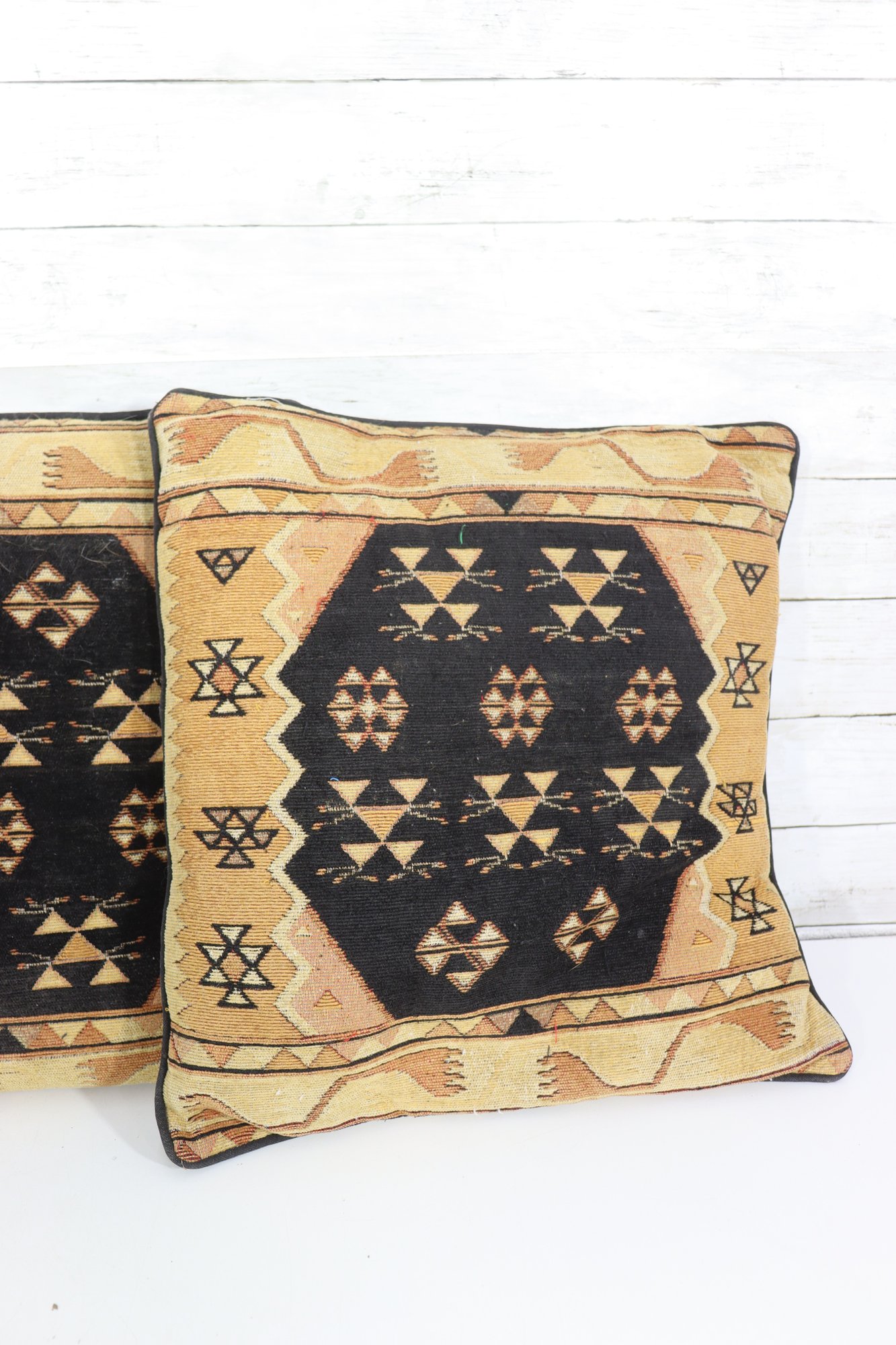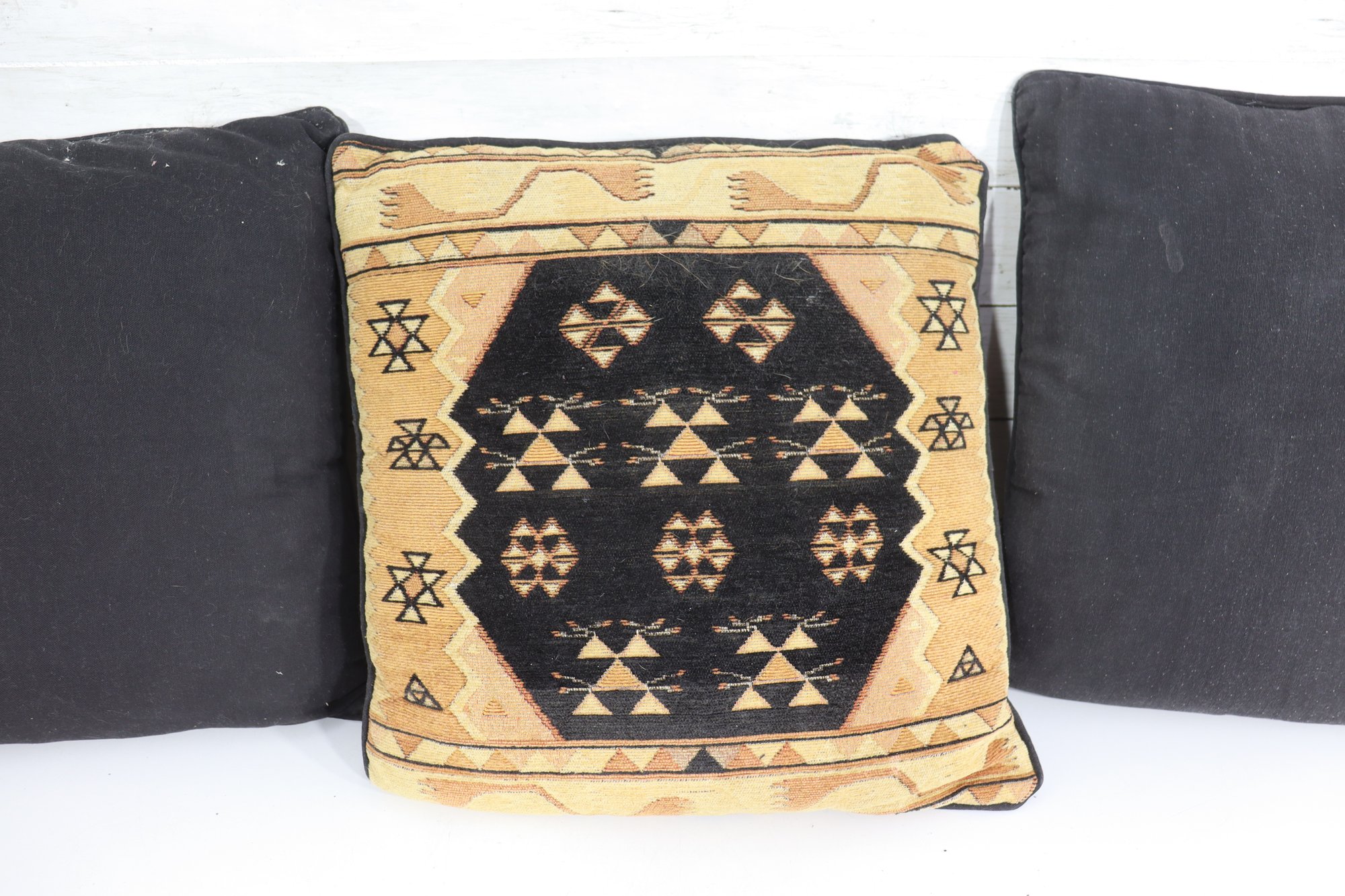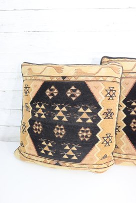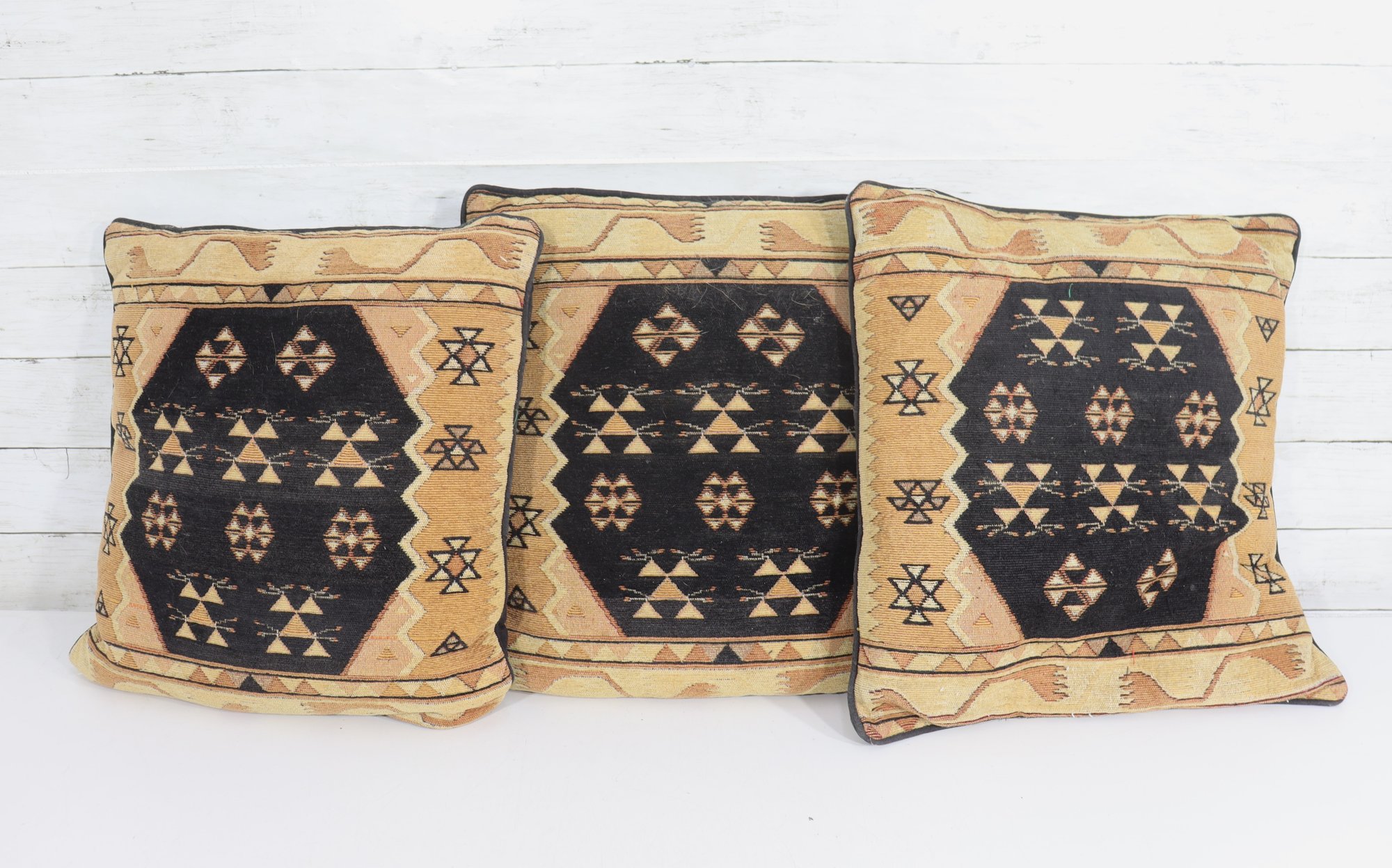 a striking set of three kilim-style decorative throw pillows, featuring bold tribal geometric patterns in neutral earth tones. These pillows add texture and global-inspired style to any space and work beautifully in bohemian, rustic, Southwestern, or eclectic décor.