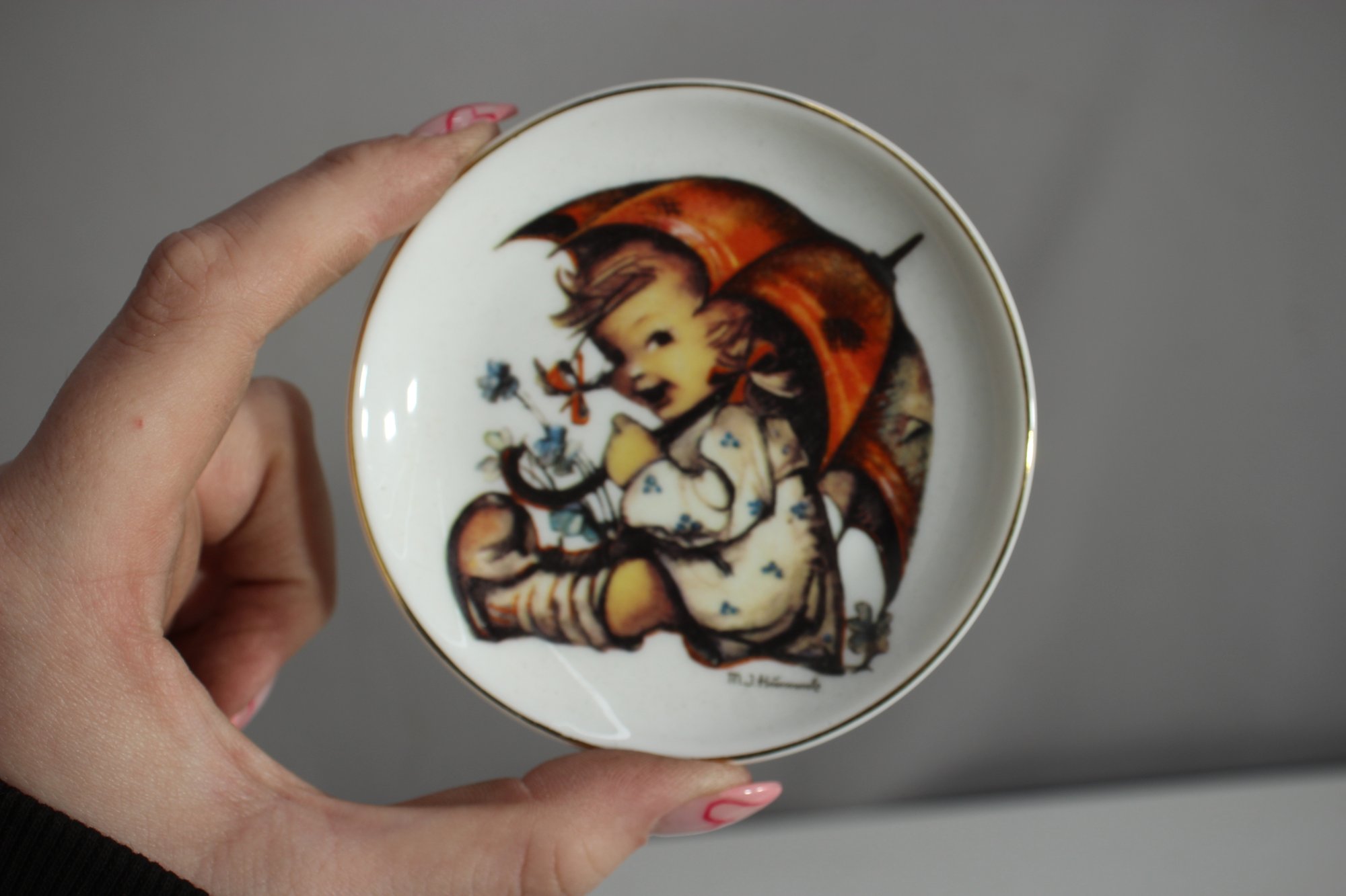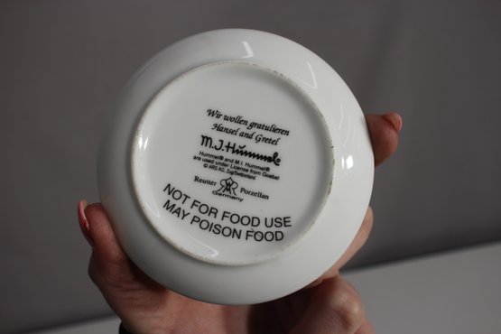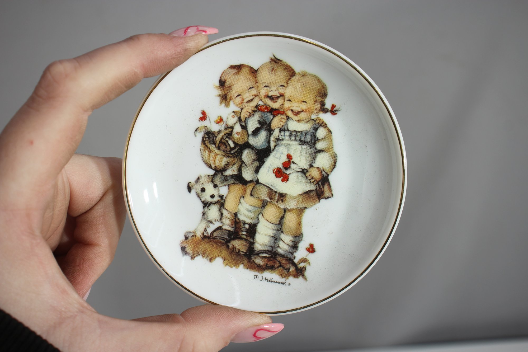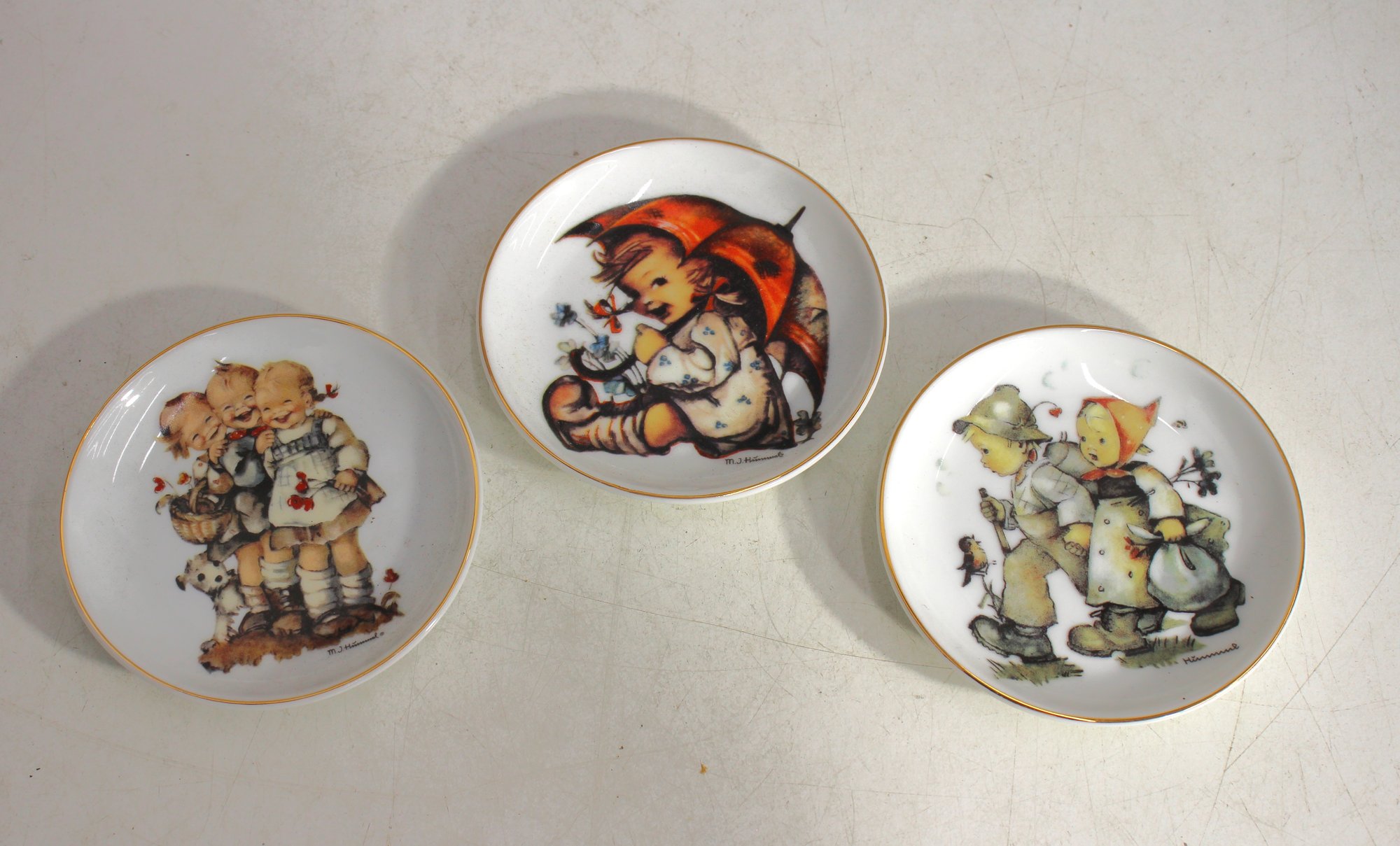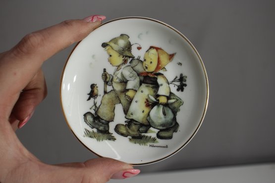 This beautiful set of three M.J. Hummel collector plates features charming vintage-style illustrations of children in heartwarming scenes. Produced by Reutter Porzellan, these decorative plates measure 3.5 inches in diameter and are adorned with gold trim around the edges.