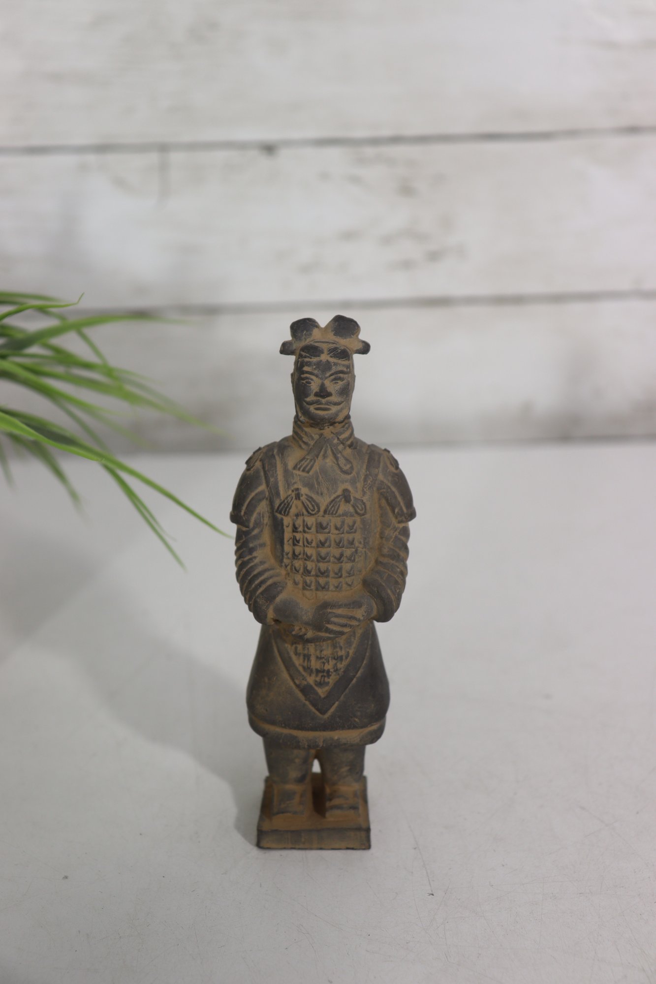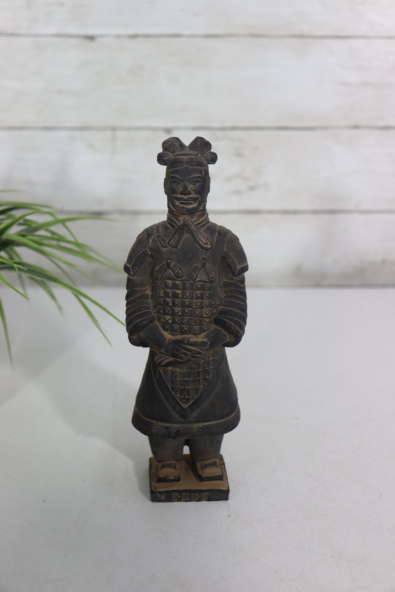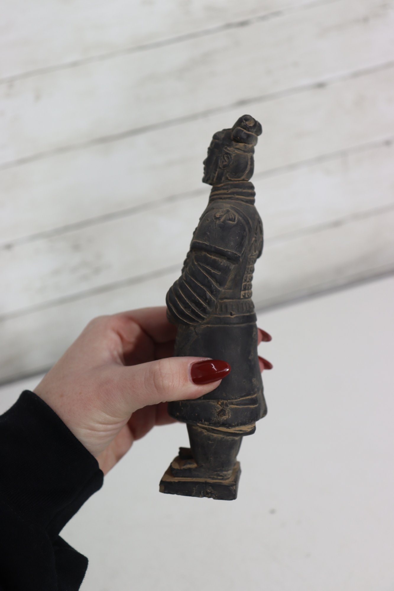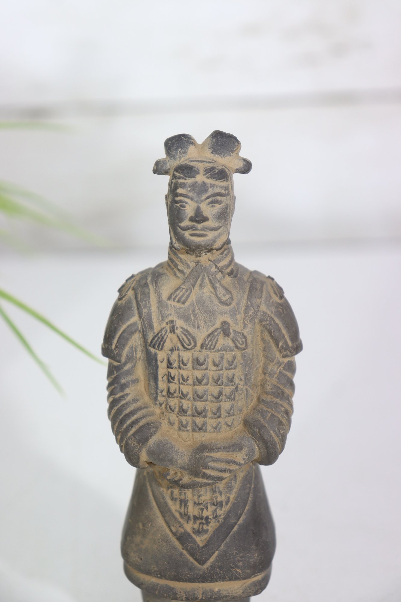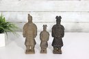 set of three terracotta warrior replica figurines, modeled after the famous Qin Dynasty Terracotta Army discovered in Xi’an, China. Each warrior is uniquely sculpted with traditional armor, hairstyles, and stance details that reflect the historic life-size originals.