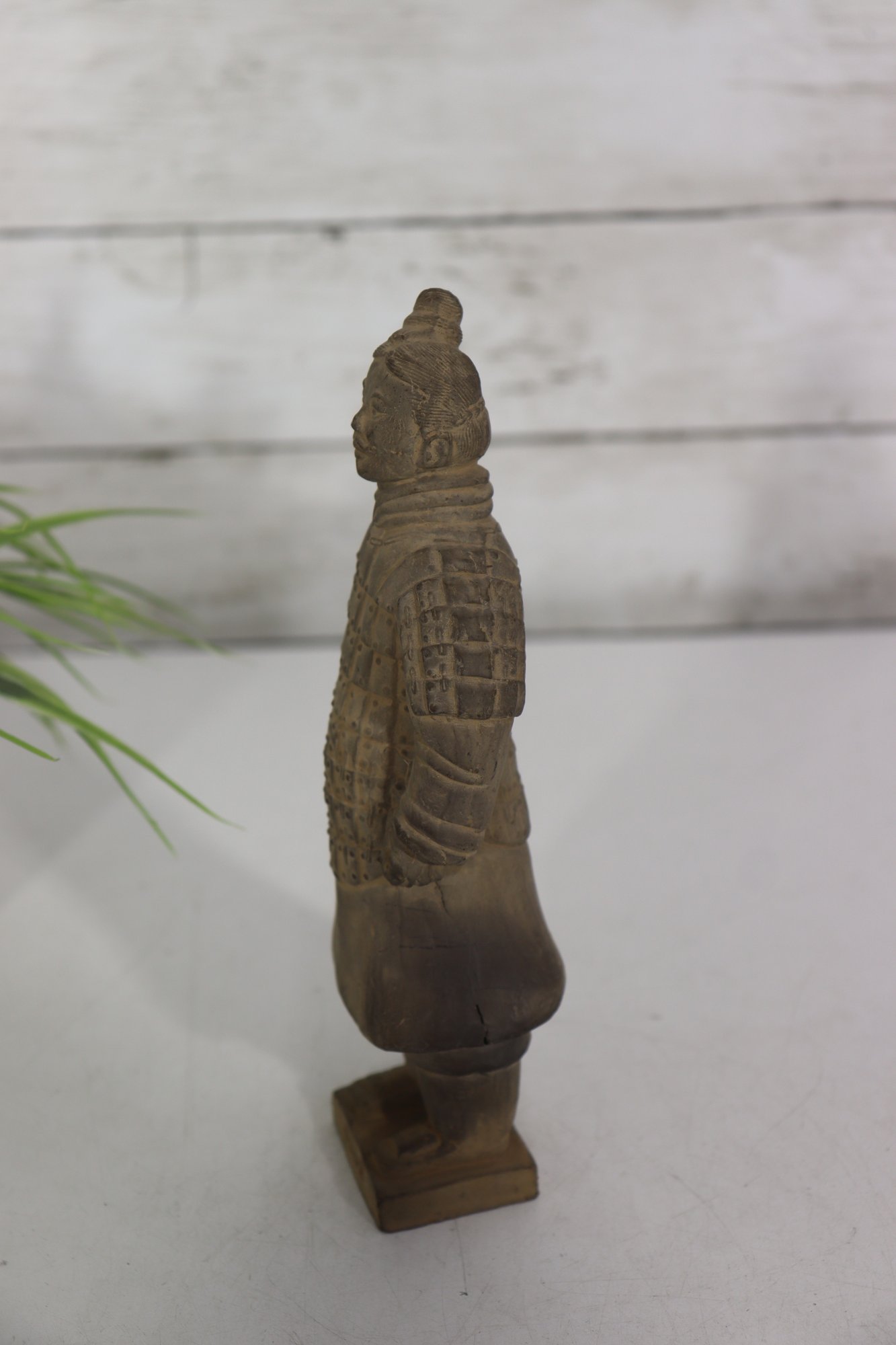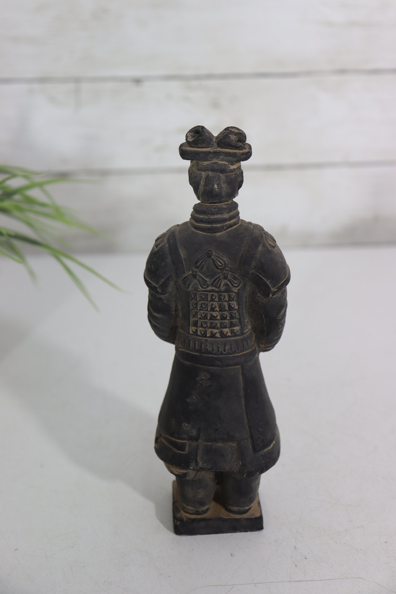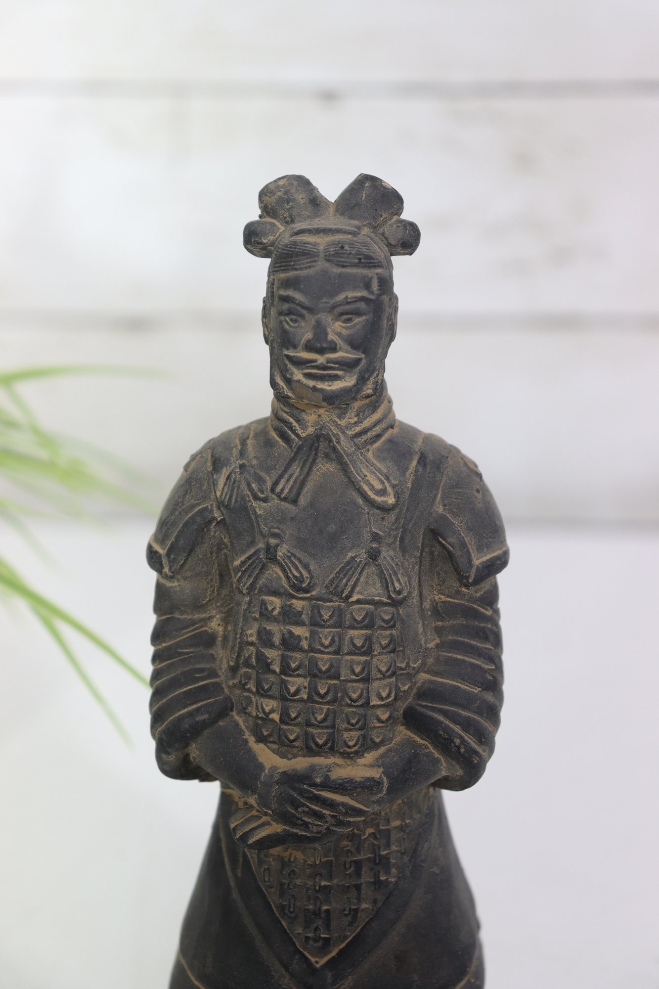 set of three terracotta warrior replica figurines, modeled after the famous Qin Dynasty Terracotta Army discovered in Xi’an, China. Each warrior is uniquely sculpted with traditional armor, hairstyles, and stance details that reflect the historic life-size originals.