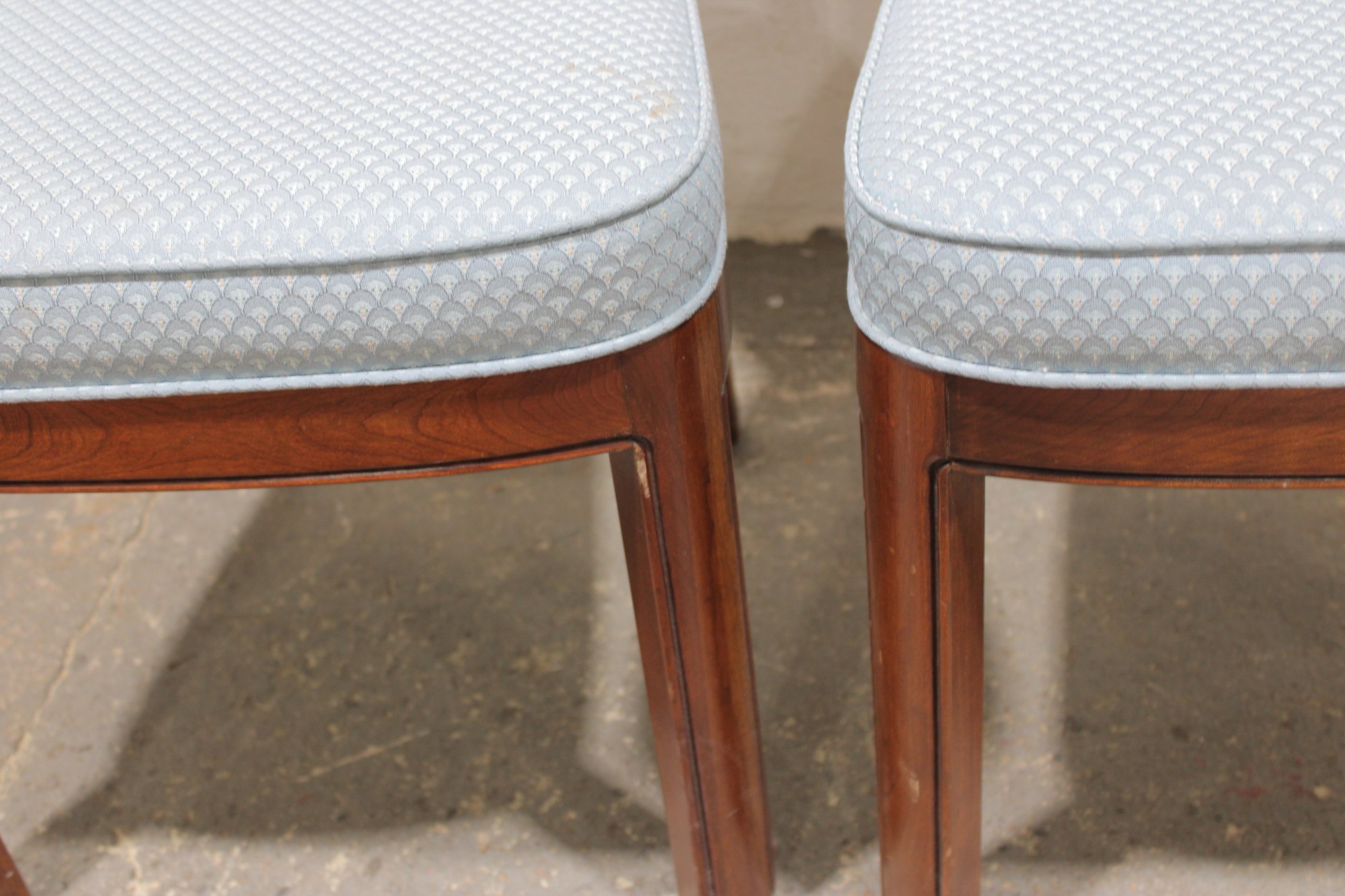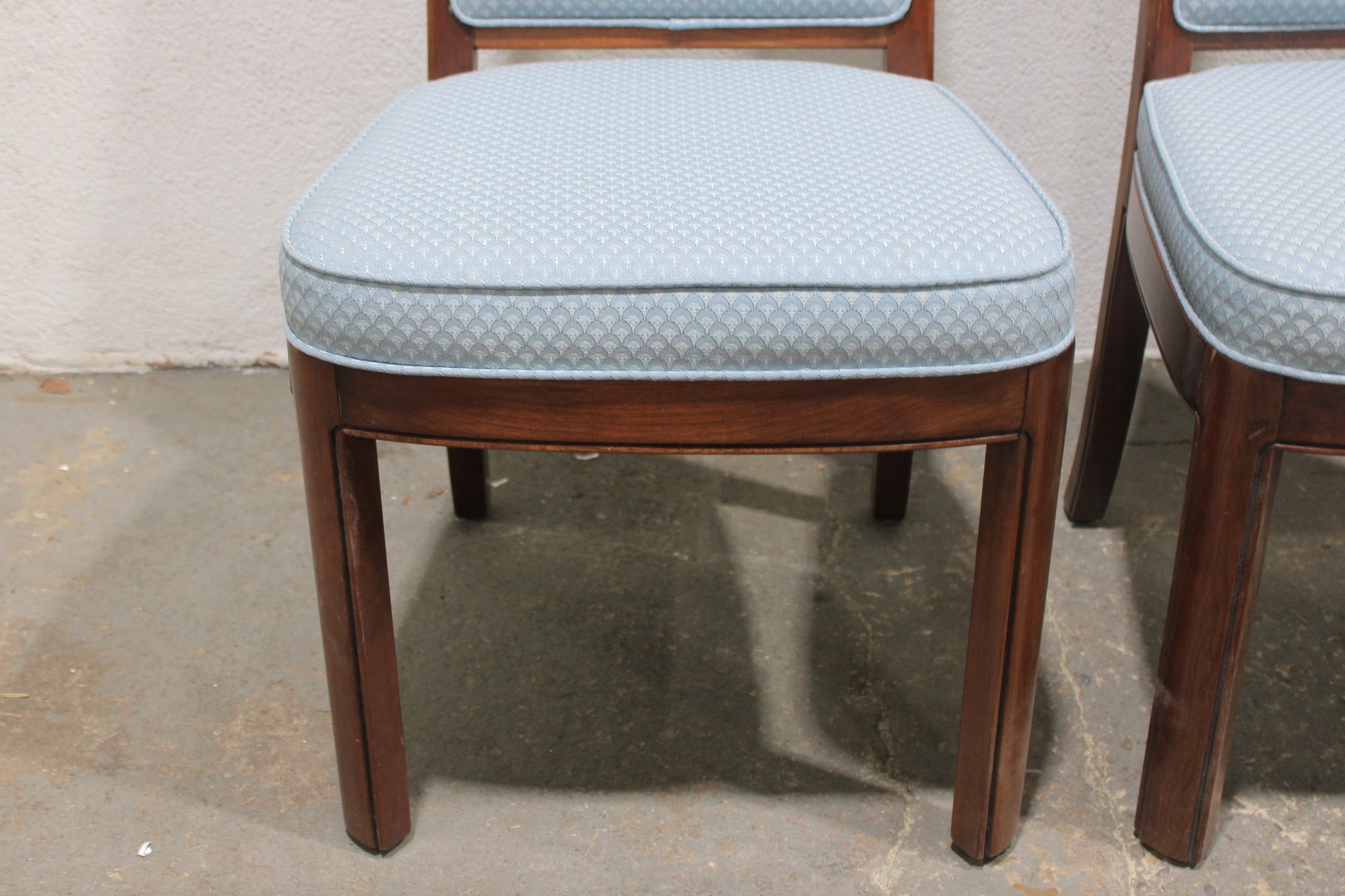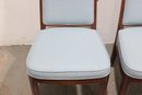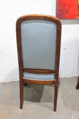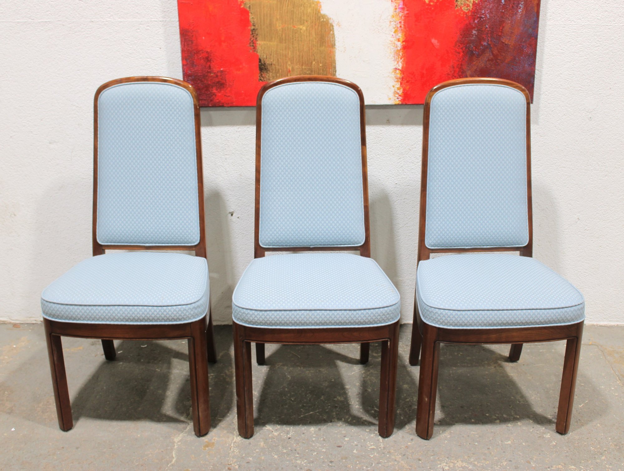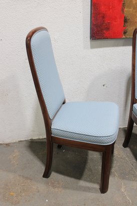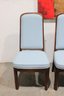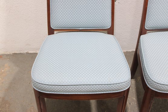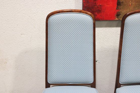 The comfortable padded seats and high backs provide excellent support, making them ideal for dining use or as accent chairs in a variety of spaces. The warm wood frames contrast nicely with the light blue upholstery, creating a refined and inviting look.