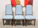 Set of three elegant dining chairs featuring solid wood frames and upholstered seats and backs in a soft light blue patterned fabric. These chairs offer a clean, classic design with gently rounded backrests and simple tapered legs that complement both traditional and contemporary interiors.