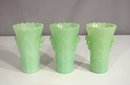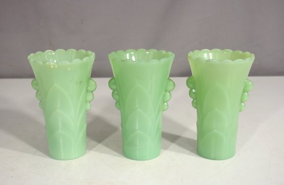 classic elegance to your collection with this set of three (3) vintage Fire King Jadeite green bud vases! These Art Deco-inspired vases feature a stunning scalloped rim, raised leaf pattern, and beaded side accents, making them a truly eye-catching addition to any vintage decor.