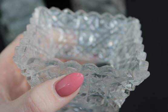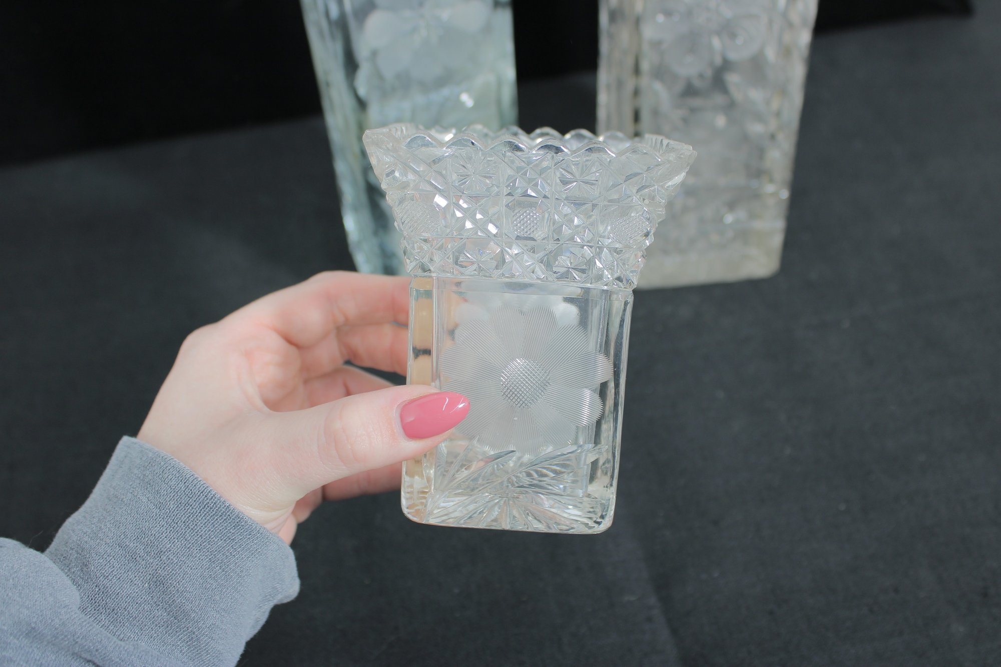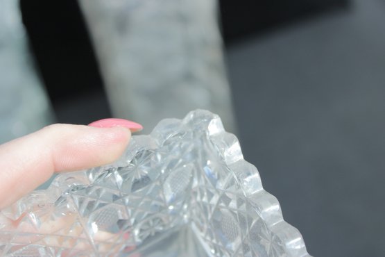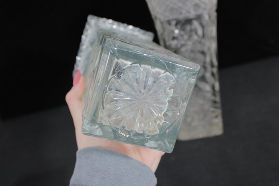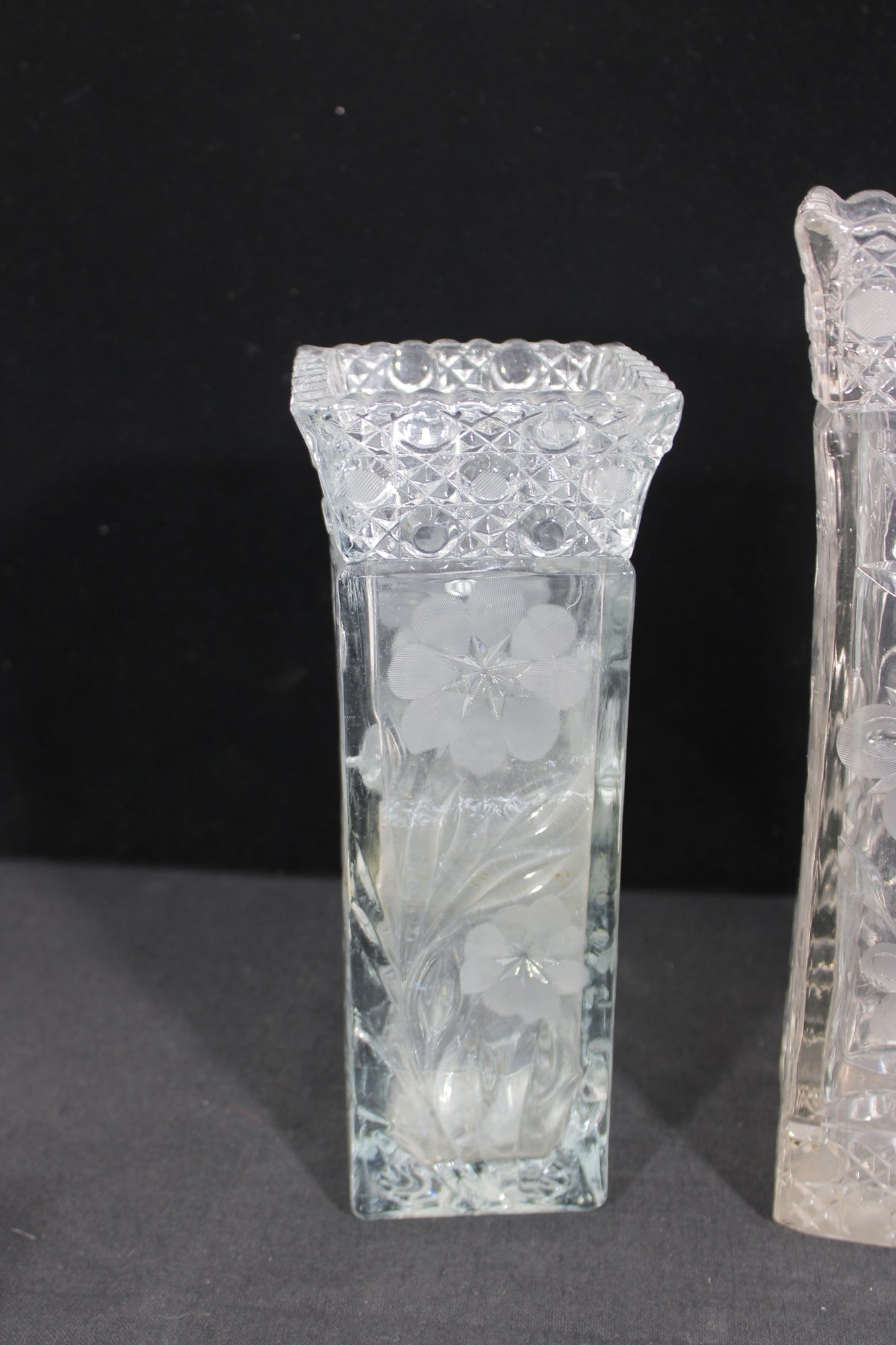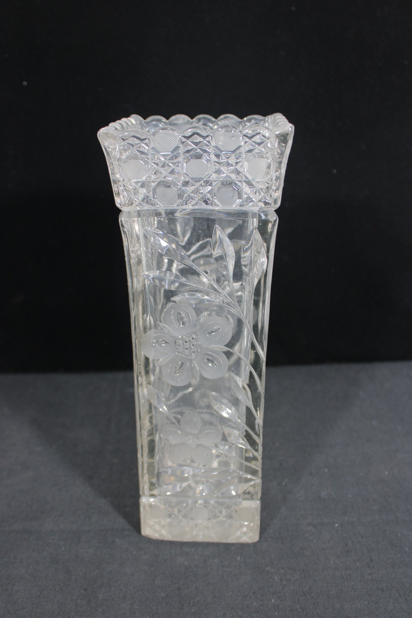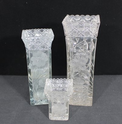 Elegant set of three vintage pressed/cut glass vases featuring beautiful etched floral and geometric patterns. Each vase is finished with a decorative scalloped rim, adding a refined and timeless look perfect for display or use.