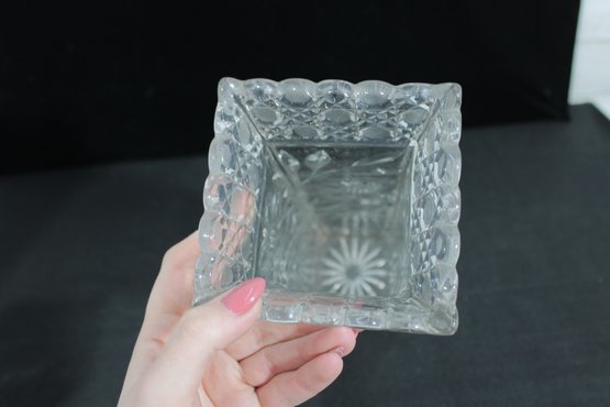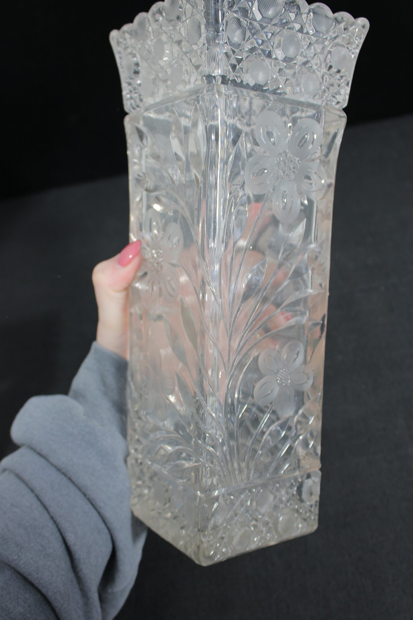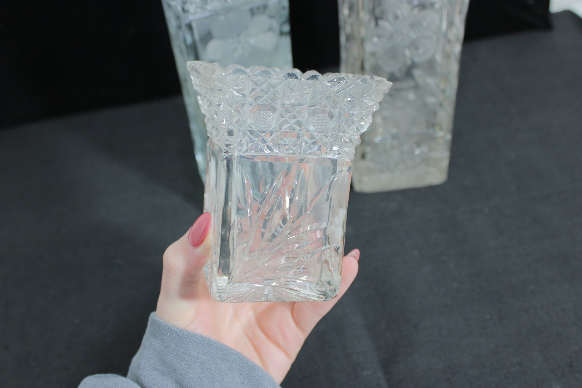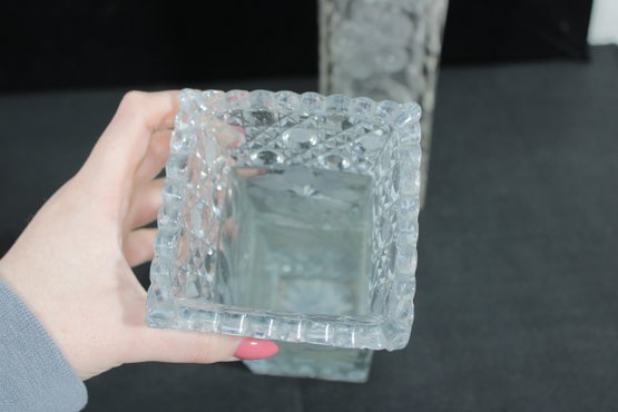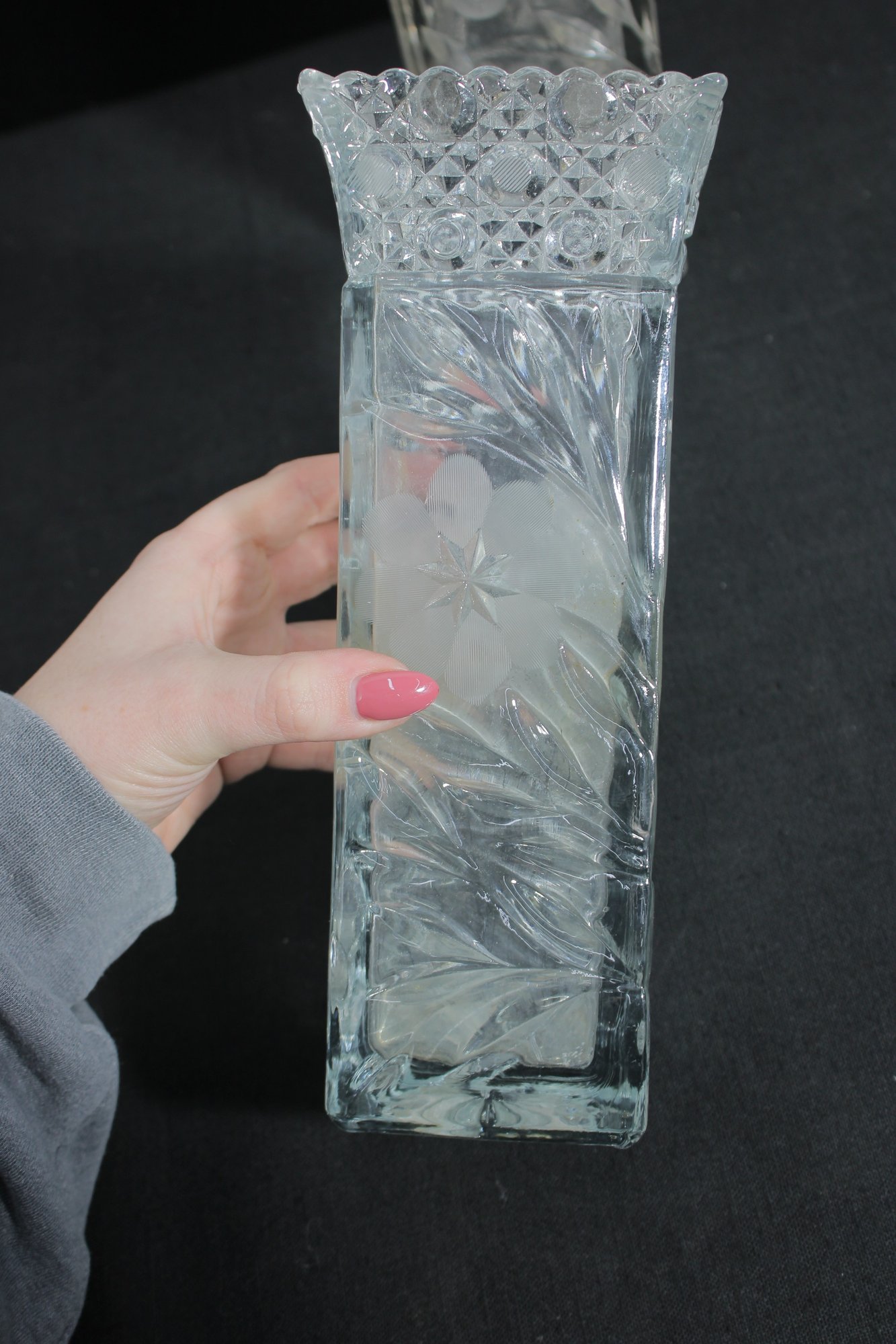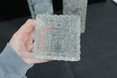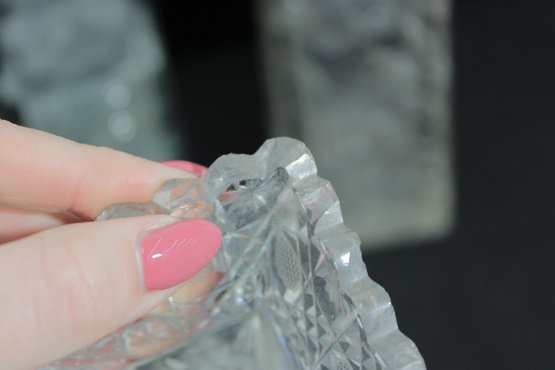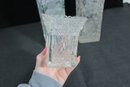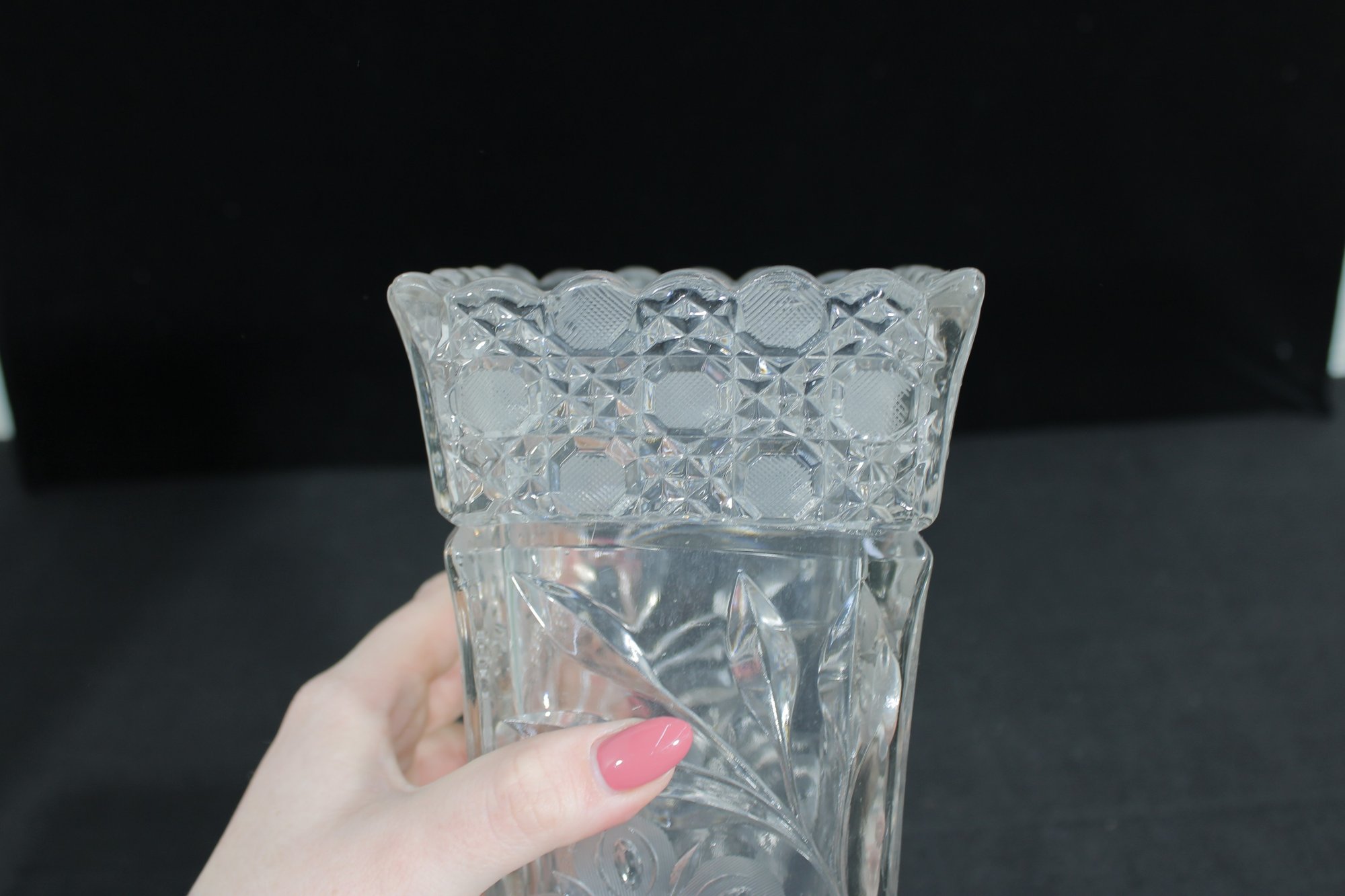 Elegant set of three vintage pressed/cut glass vases featuring beautiful etched floral and geometric patterns. Each vase is finished with a decorative scalloped rim, adding a refined and timeless look perfect for display or use.