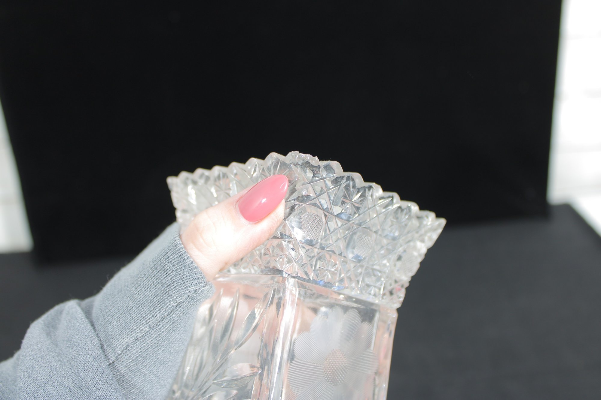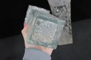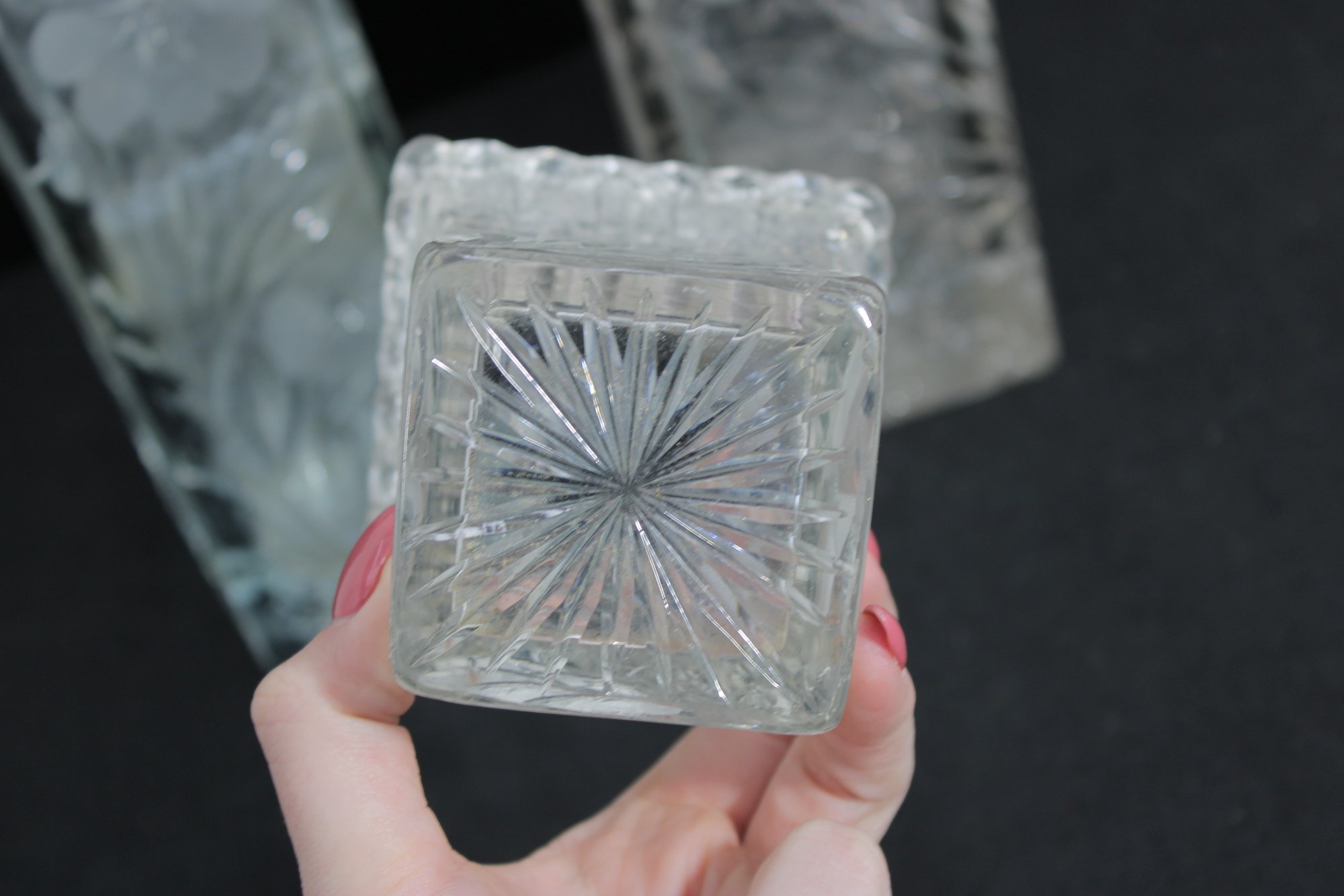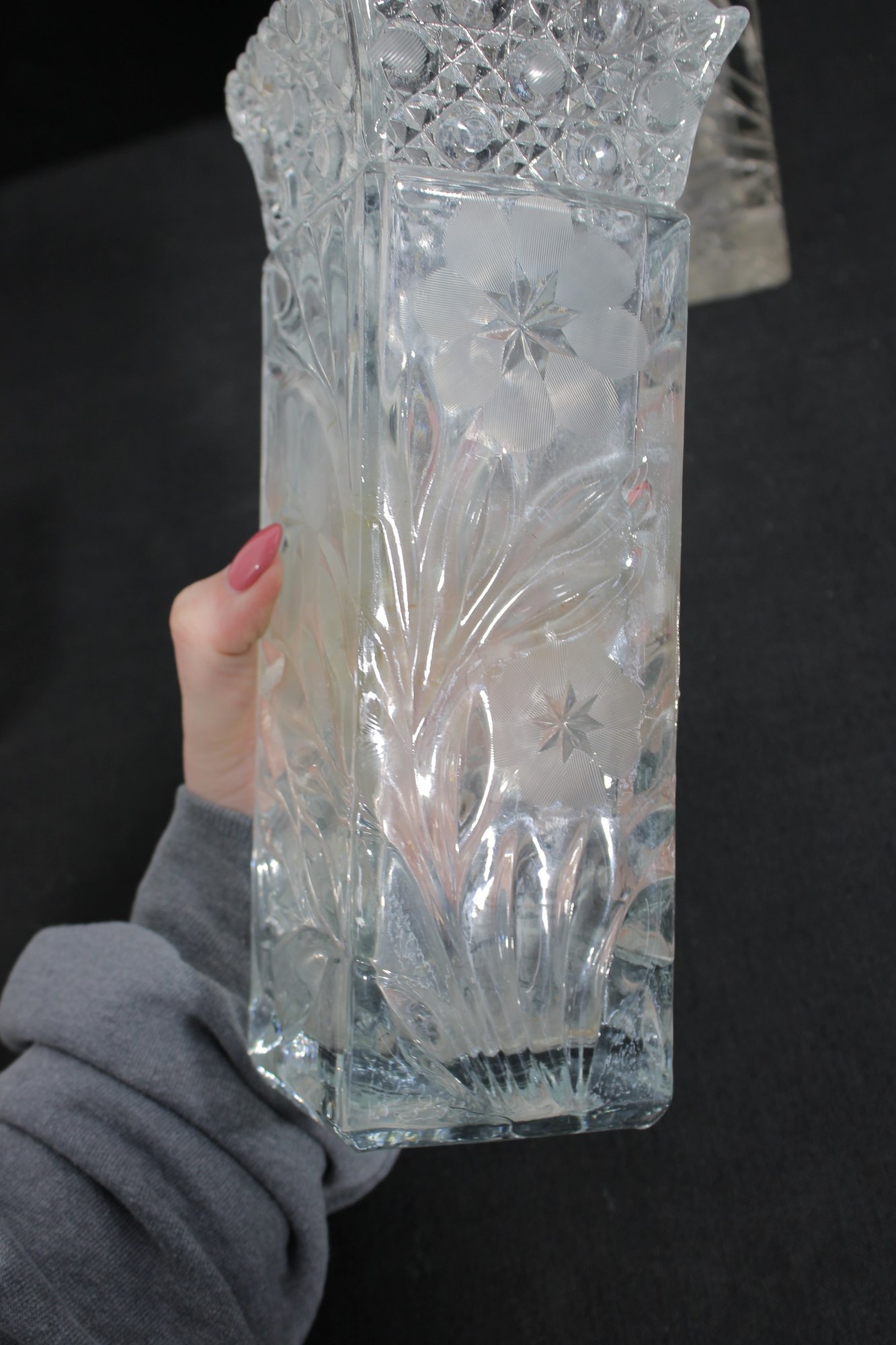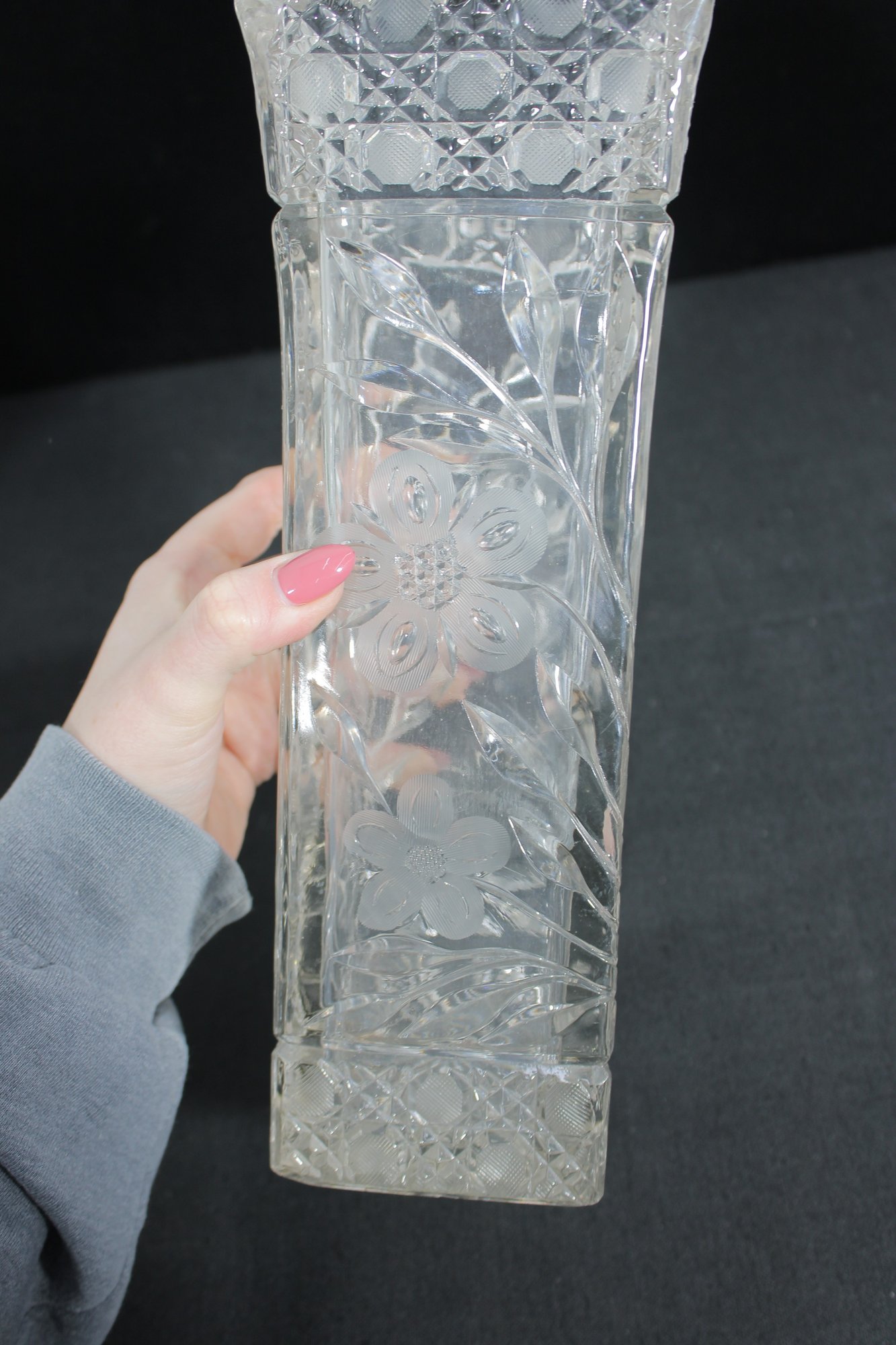 Elegant set of three vintage pressed/cut glass vases featuring beautiful etched floral and geometric patterns. Each vase is finished with a decorative scalloped rim, adding a refined and timeless look perfect for display or use.