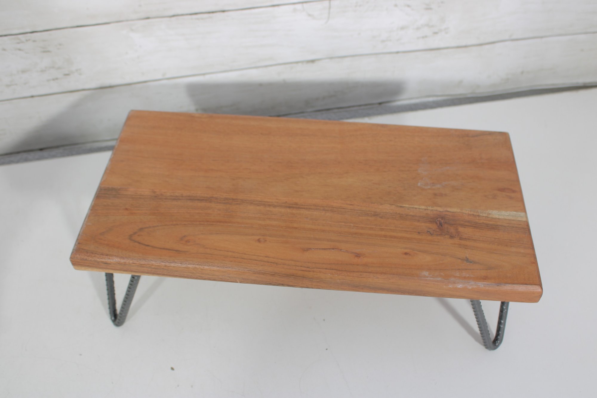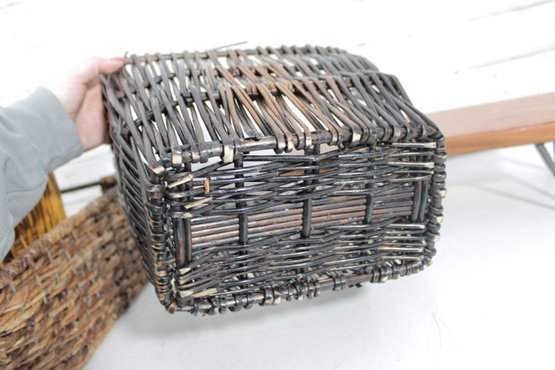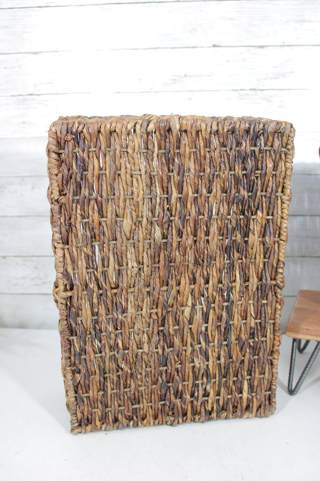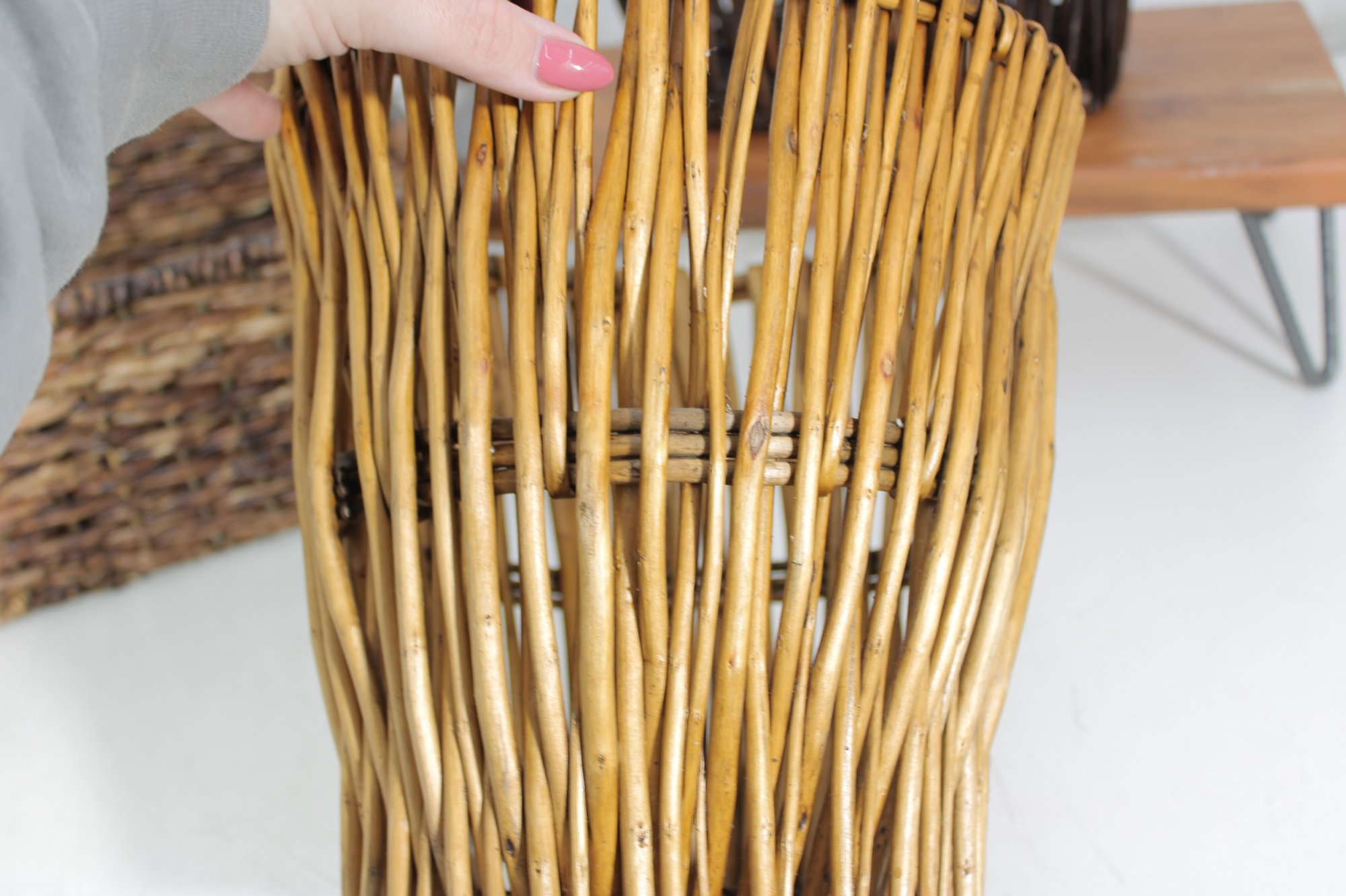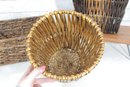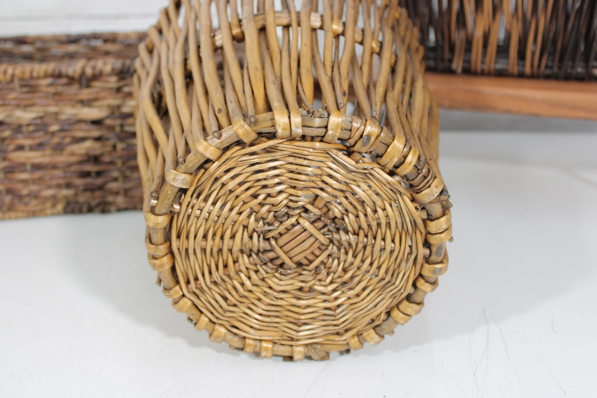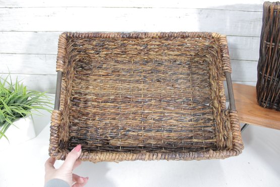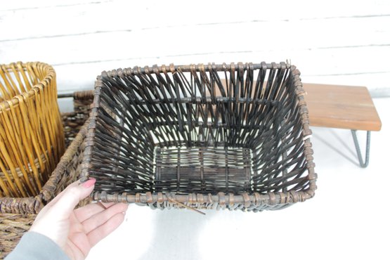 Decorative set featuring three woven baskets in varied shapes and tones, along with a small wooden display riser or stand with metal hairpin-style legs. This grouping offers a warm rustic and bohemian look, perfect for home organization, shelf styling, retail display, or decorative storage.