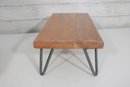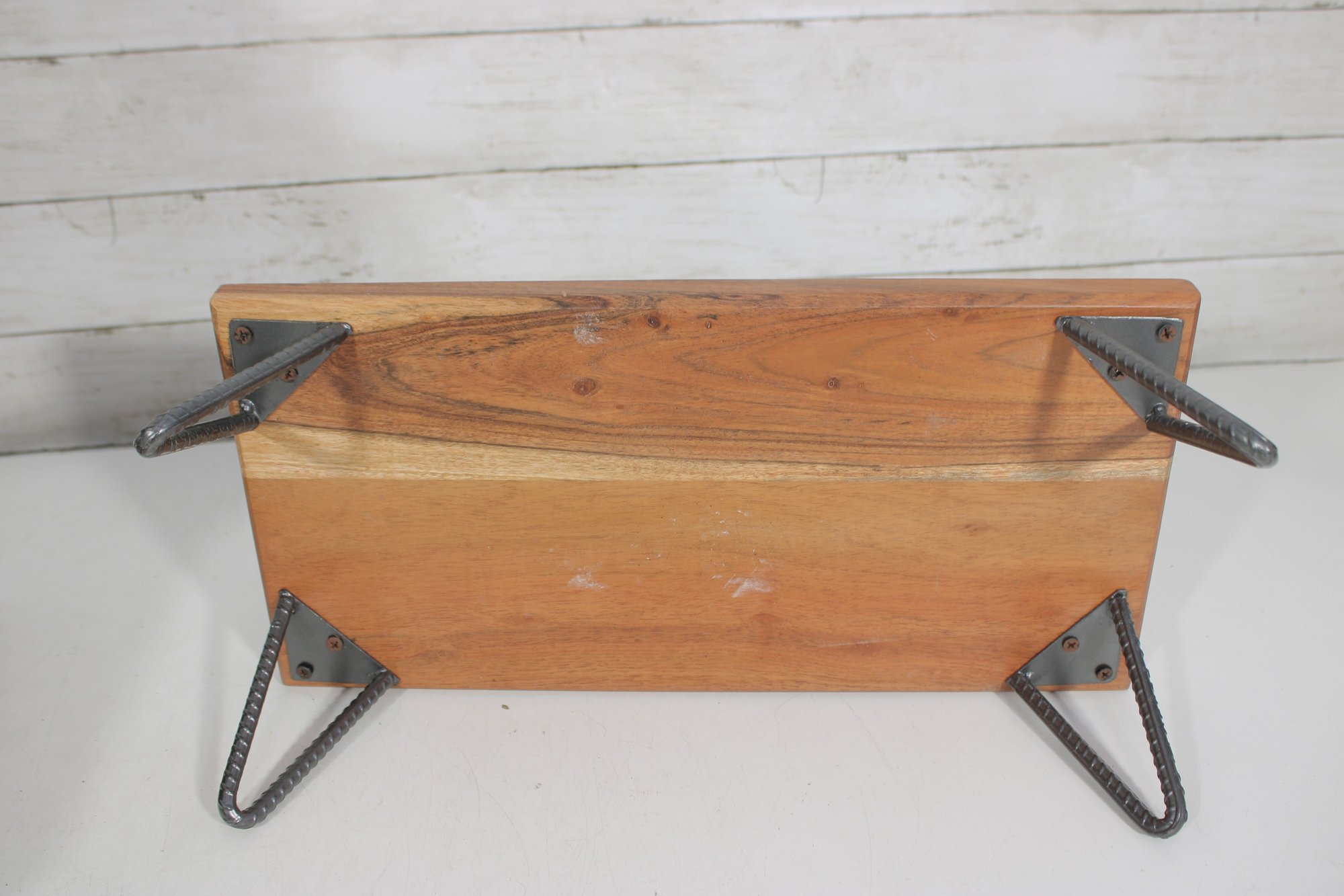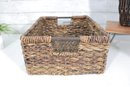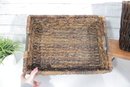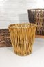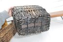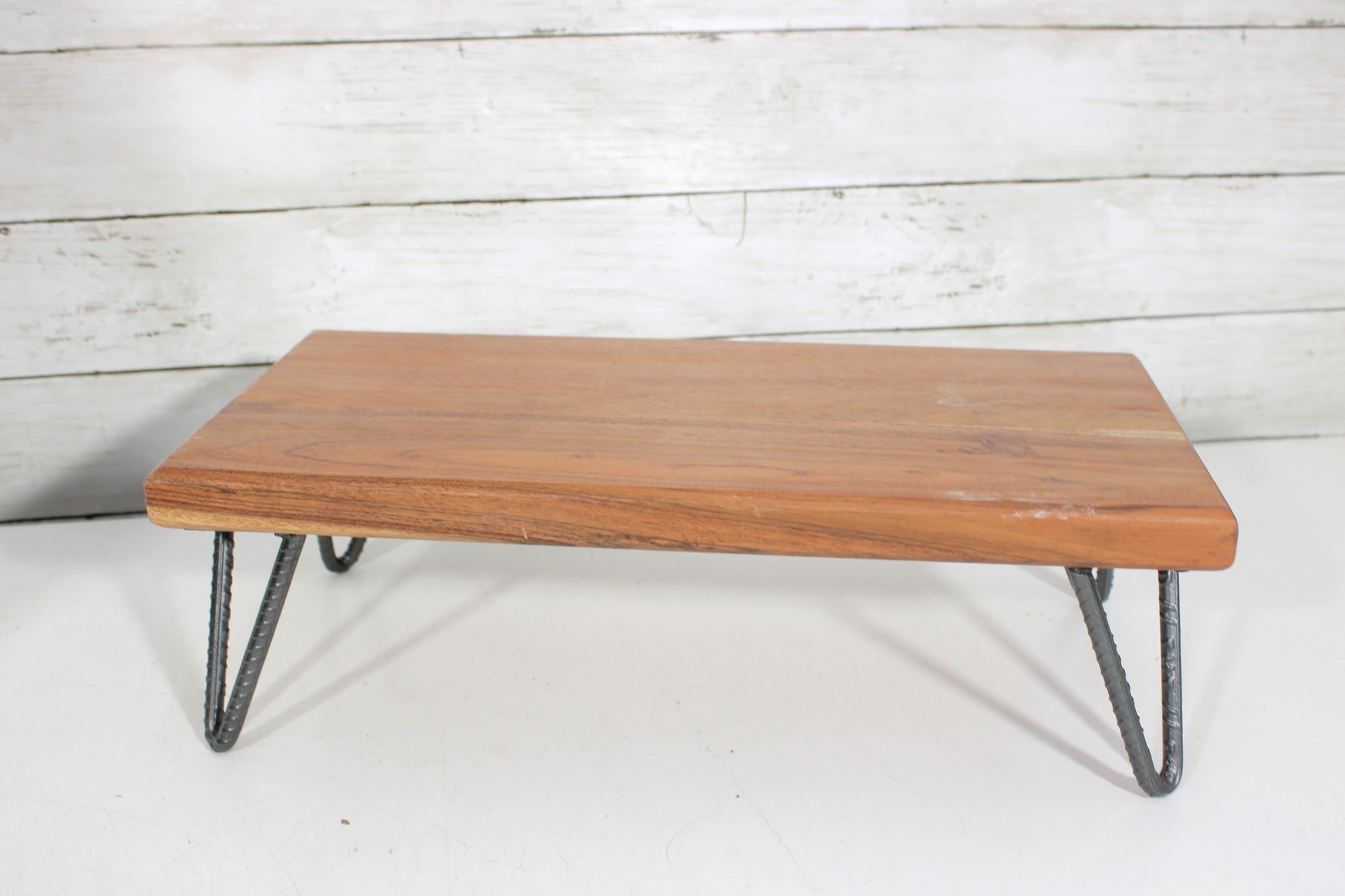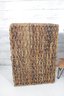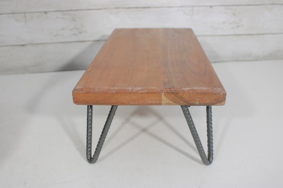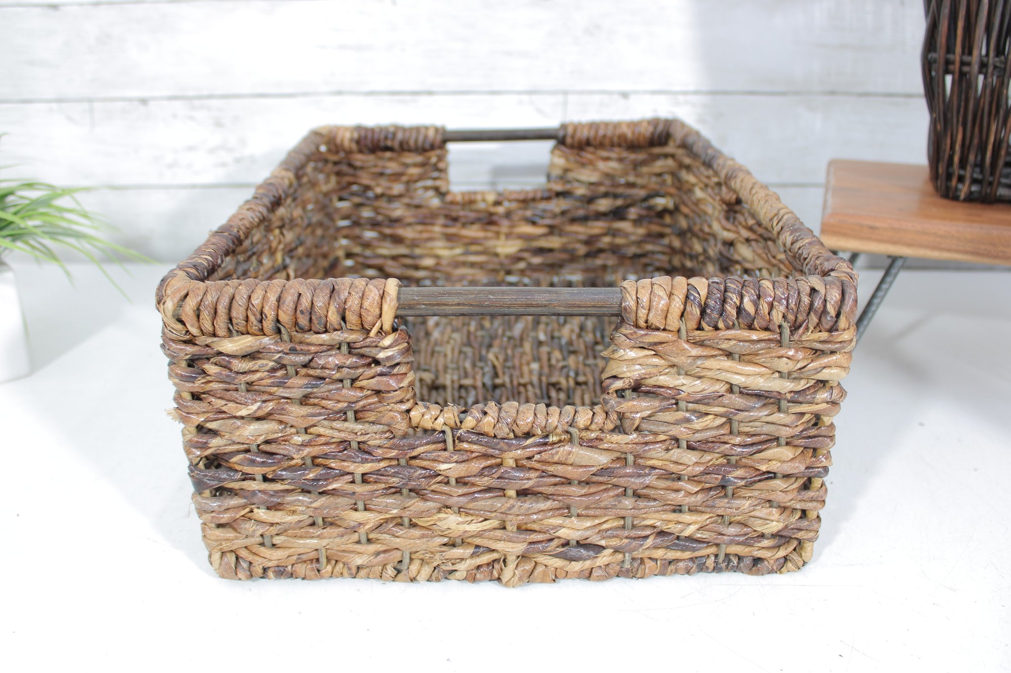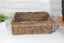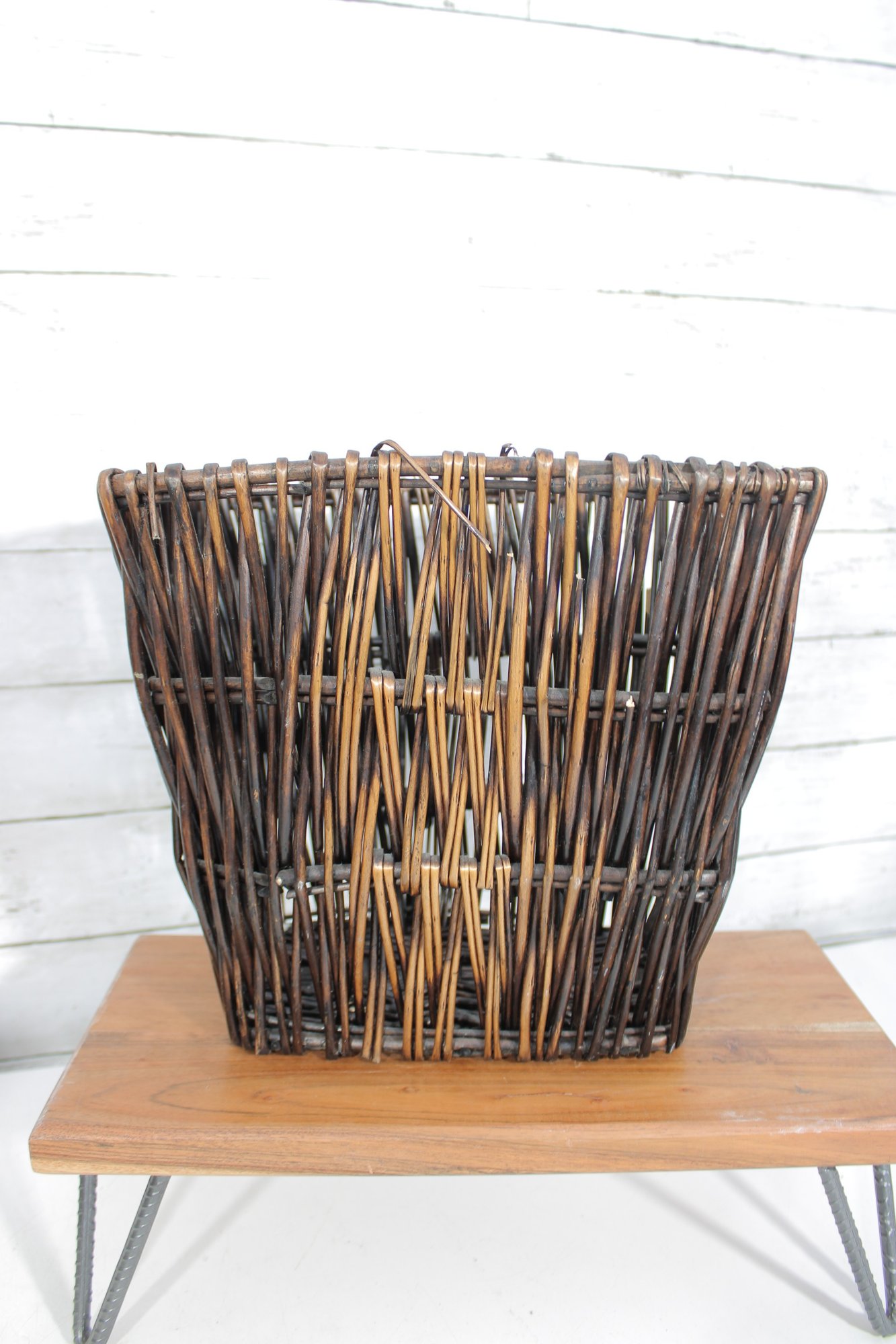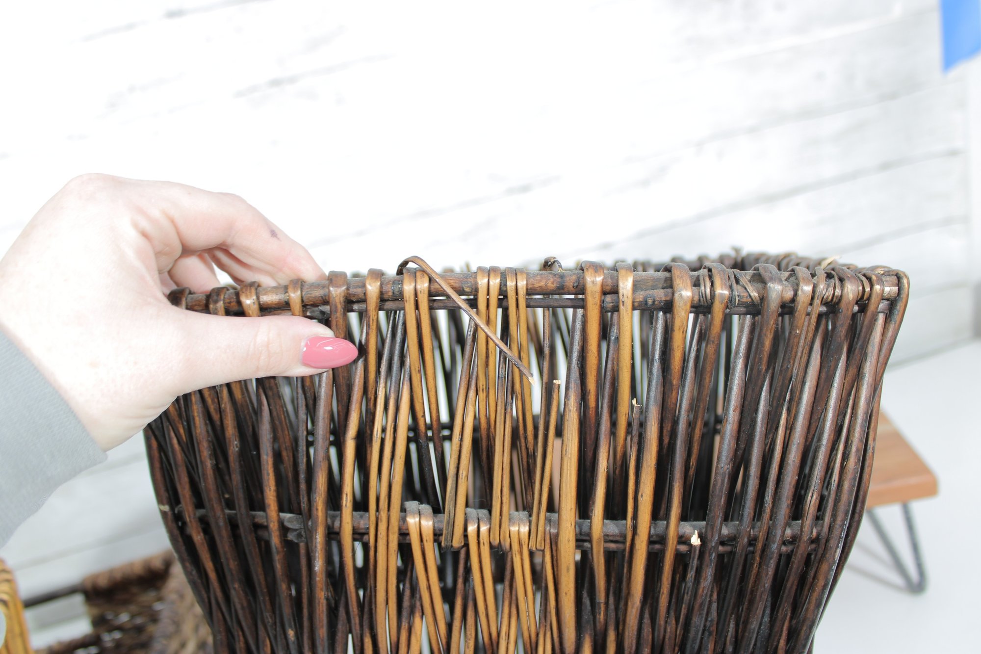 Decorative set featuring three woven baskets in varied shapes and tones, along with a small wooden display riser or stand with metal hairpin-style legs. This grouping offers a warm rustic and bohemian look, perfect for home organization, shelf styling, retail display, or decorative storage.