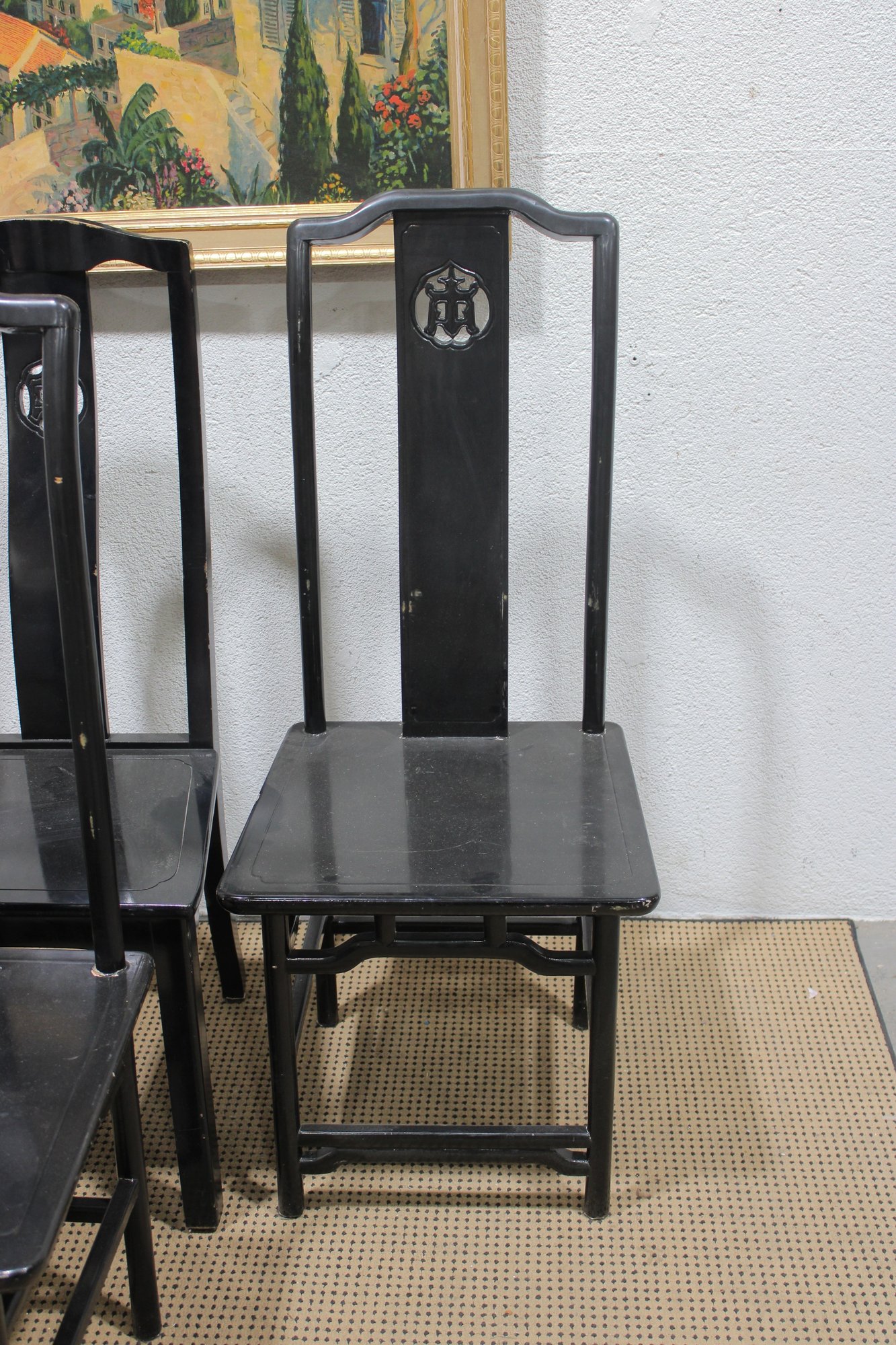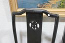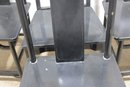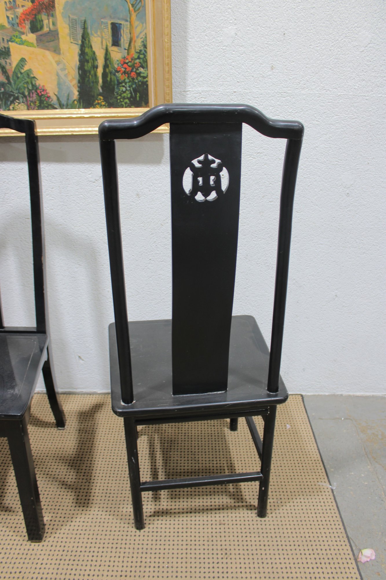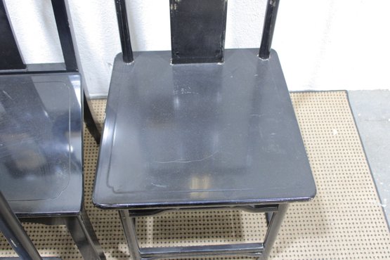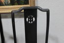 set of four Asian-inspired dining chairs featuring a sleek black lacquer-style finish and tall backs with decorative pierced medallion details. The clean lines and classic silhouette make these chairs a versatile addition to both traditional and modern interiors.