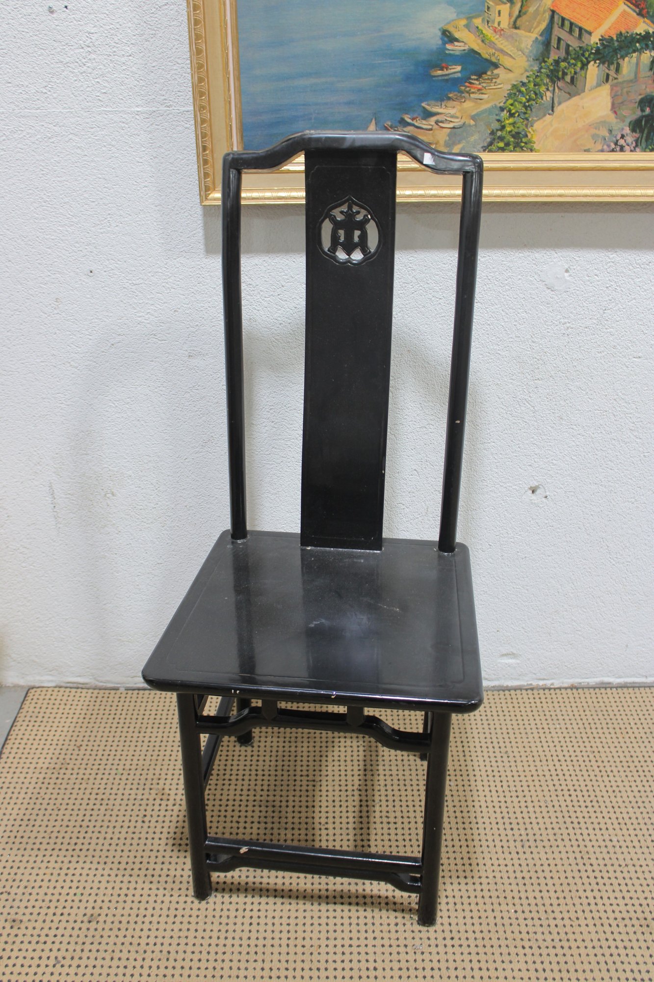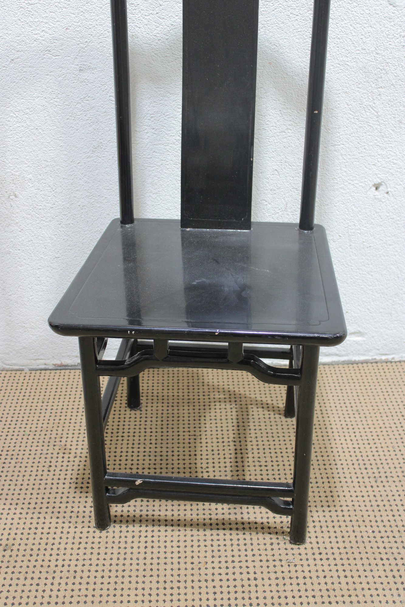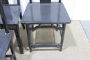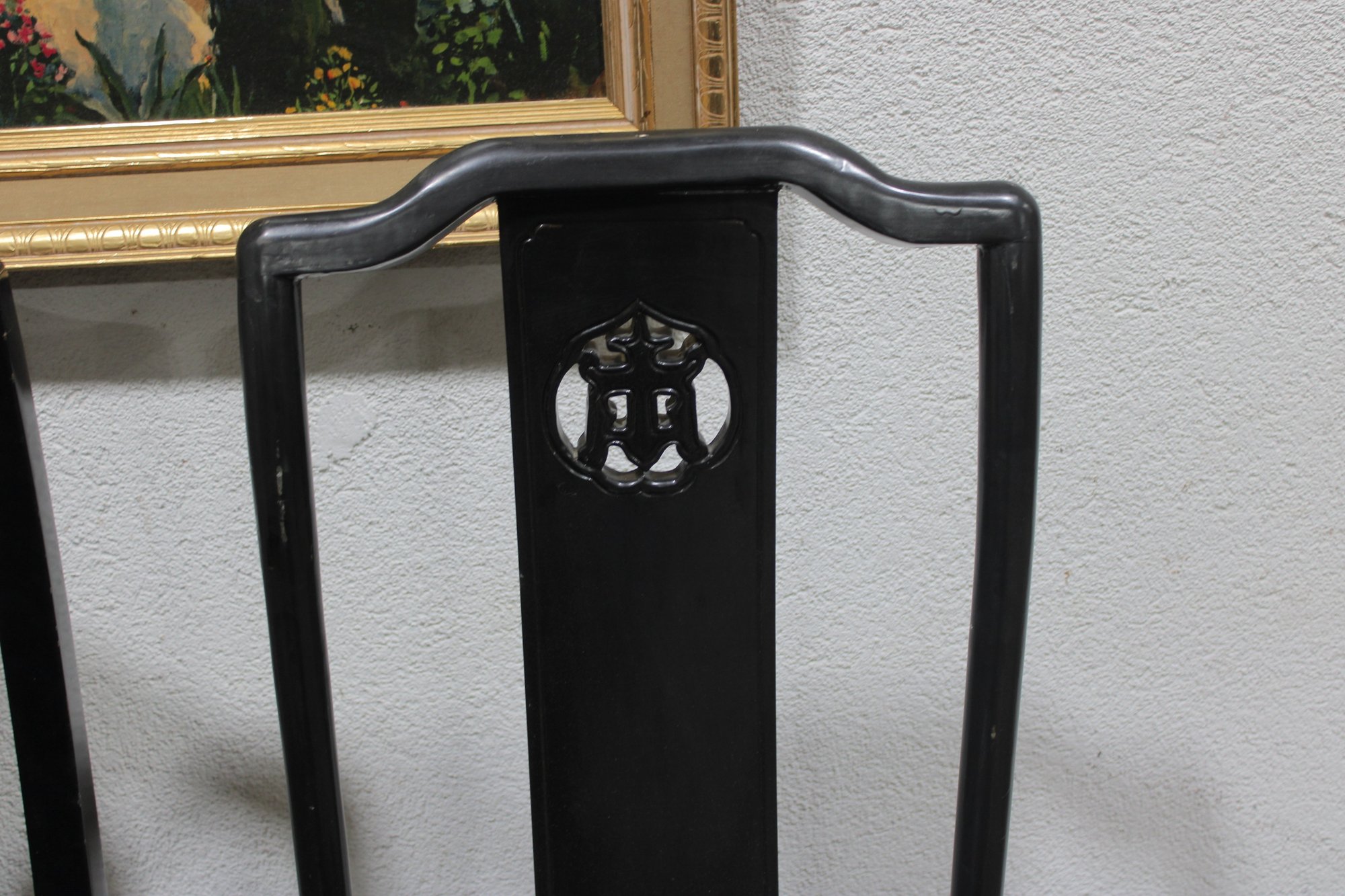 set of four Asian-inspired dining chairs featuring a sleek black lacquer-style finish and tall backs with decorative pierced medallion details. The clean lines and classic silhouette make these chairs a versatile addition to both traditional and modern interiors.
