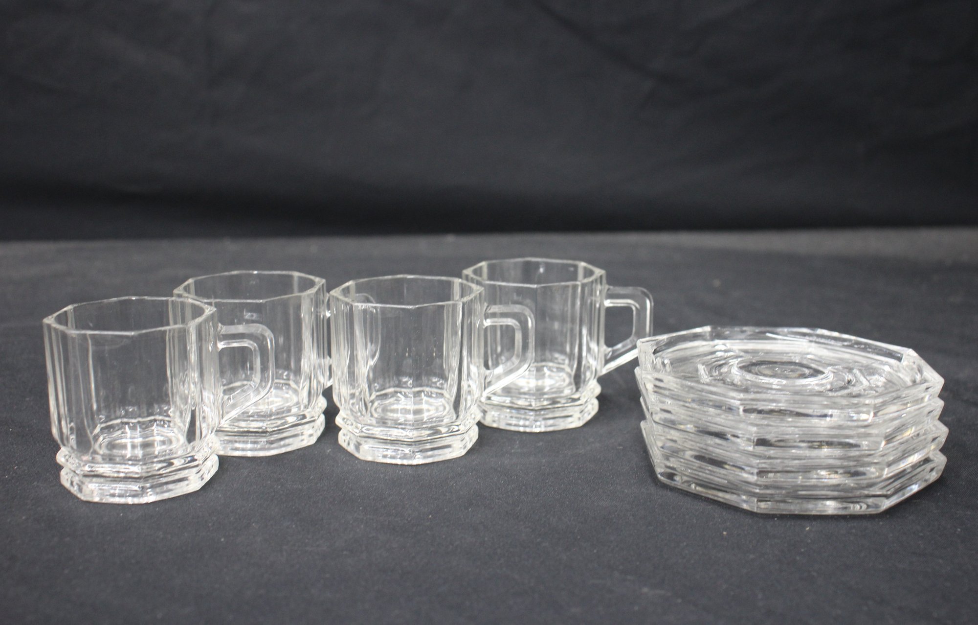 A charming set of four clear glass cups with matching octagonal saucers. Each piece features a geometric design with clean, faceted lines that catch the light beautifully. Perfect for serving tea, espresso, or other beverages in style, these pieces add a touch of vintage elegance to any table setting. The cups and saucers are in excellent condition, showcasing minimal signs of wear. A delightful set for collectors or those looking to elevate their drinkware collection!