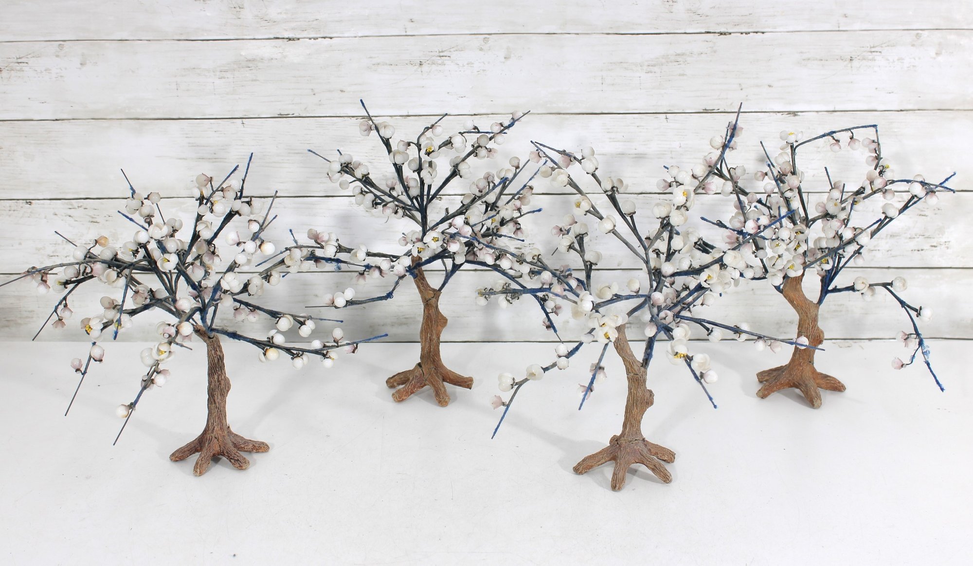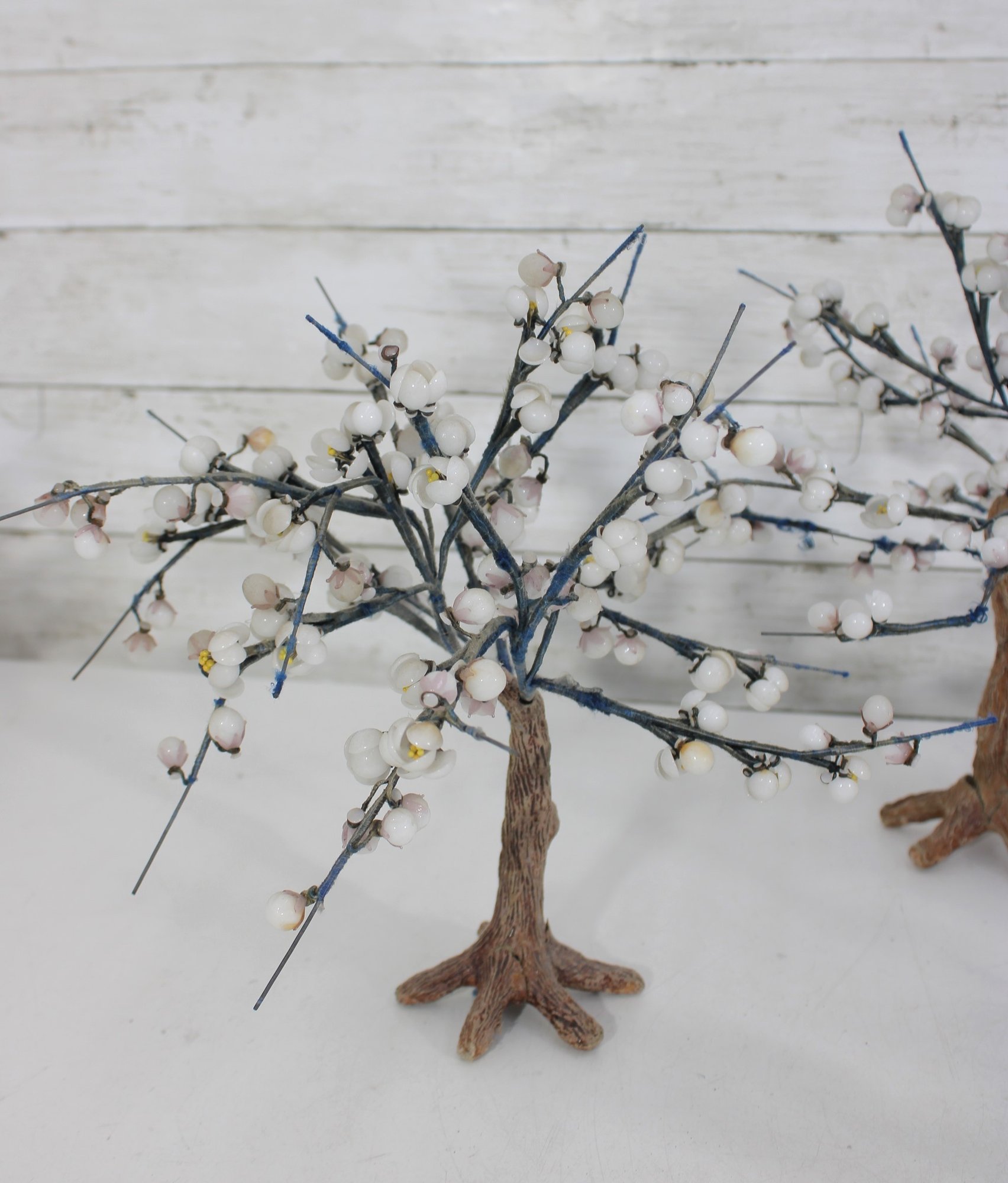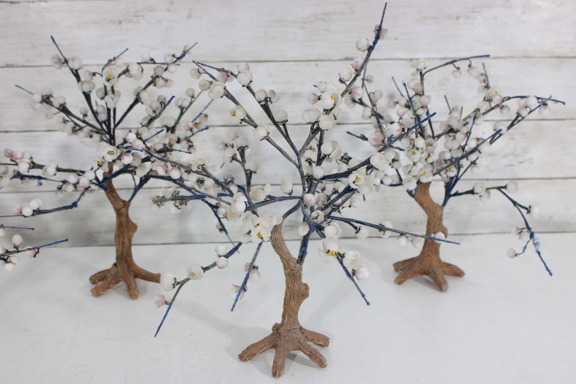 Each tree stands independently on its sculpted base and has a nicely balanced, spreading branch design that gives them an airy, realistic appearance. They look lovely displayed together as a grouping or spaced throughout a room for a cohesive decorative theme.