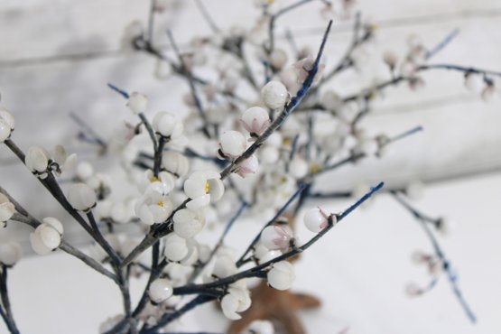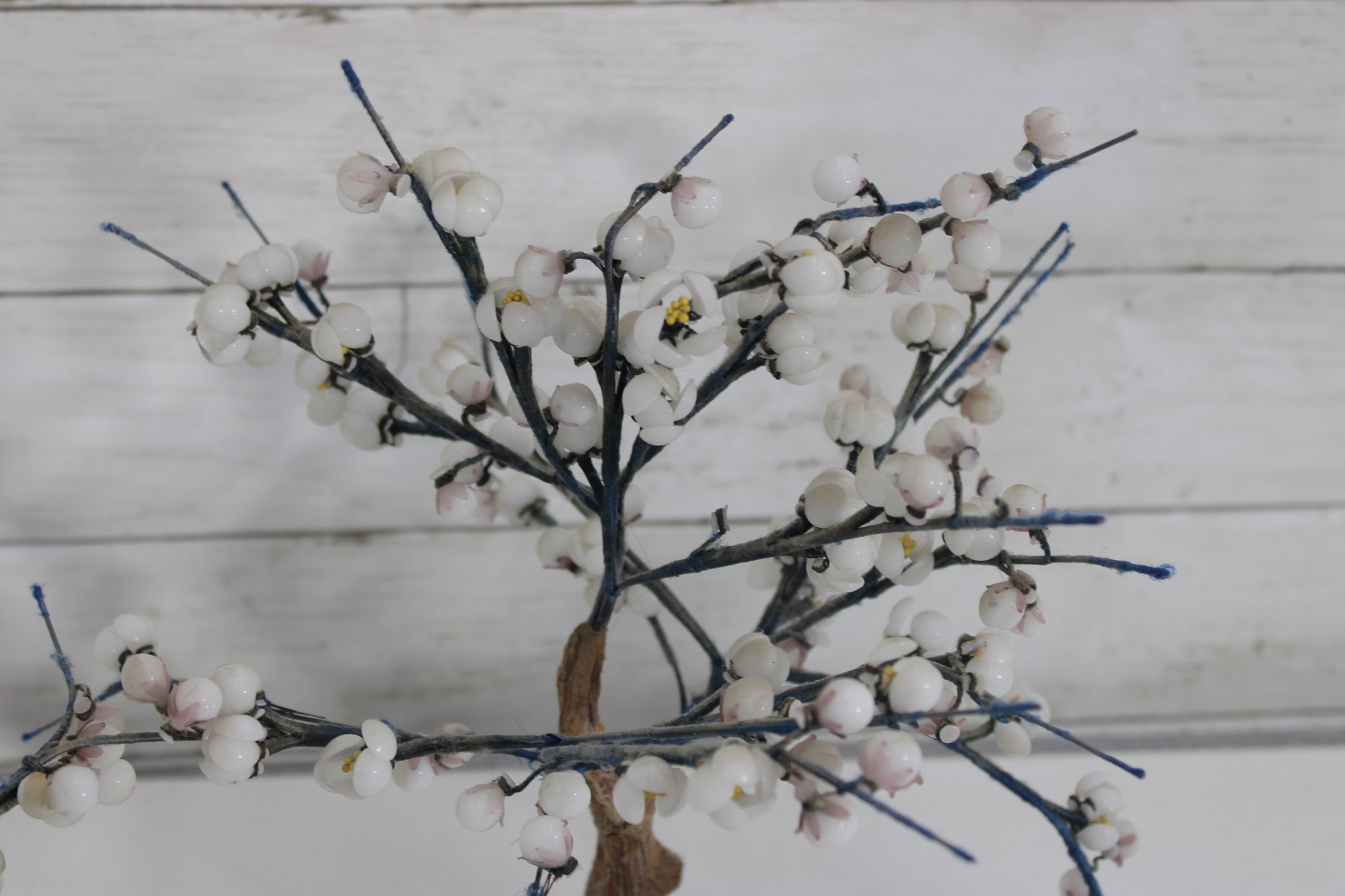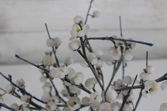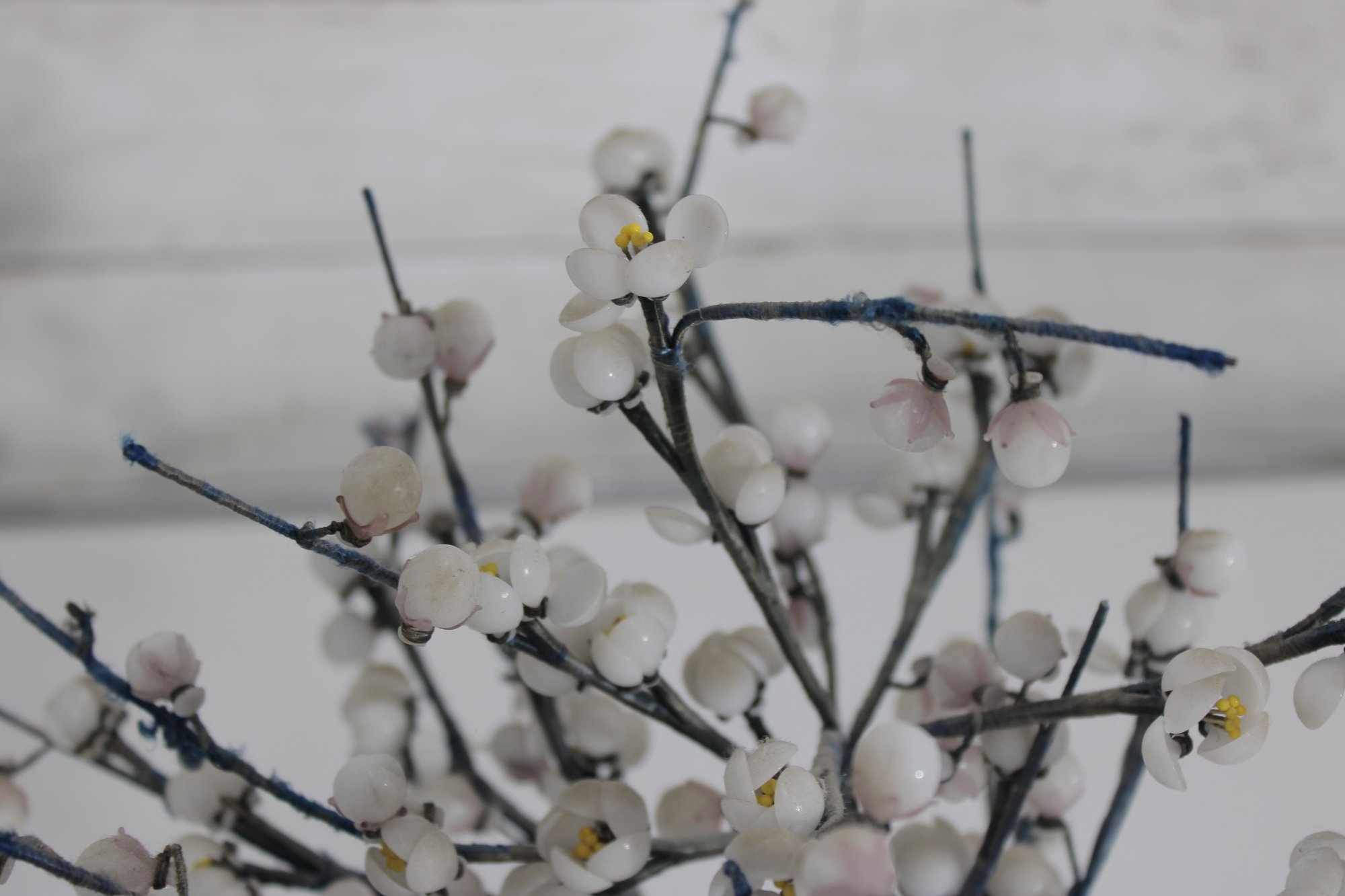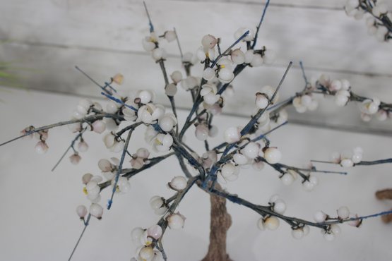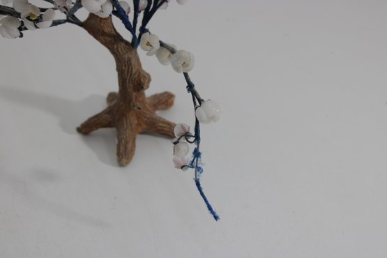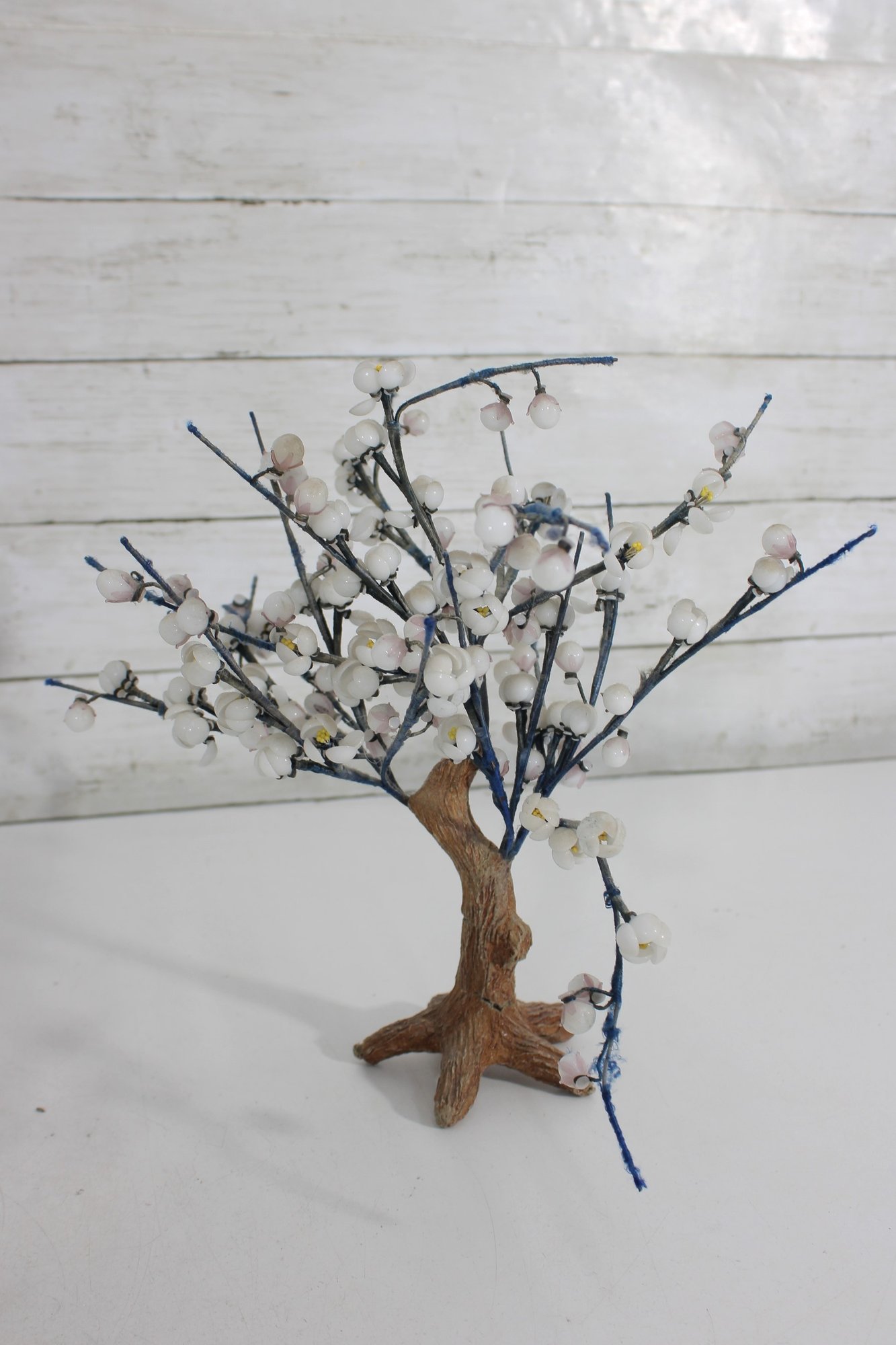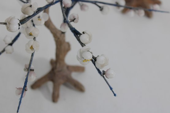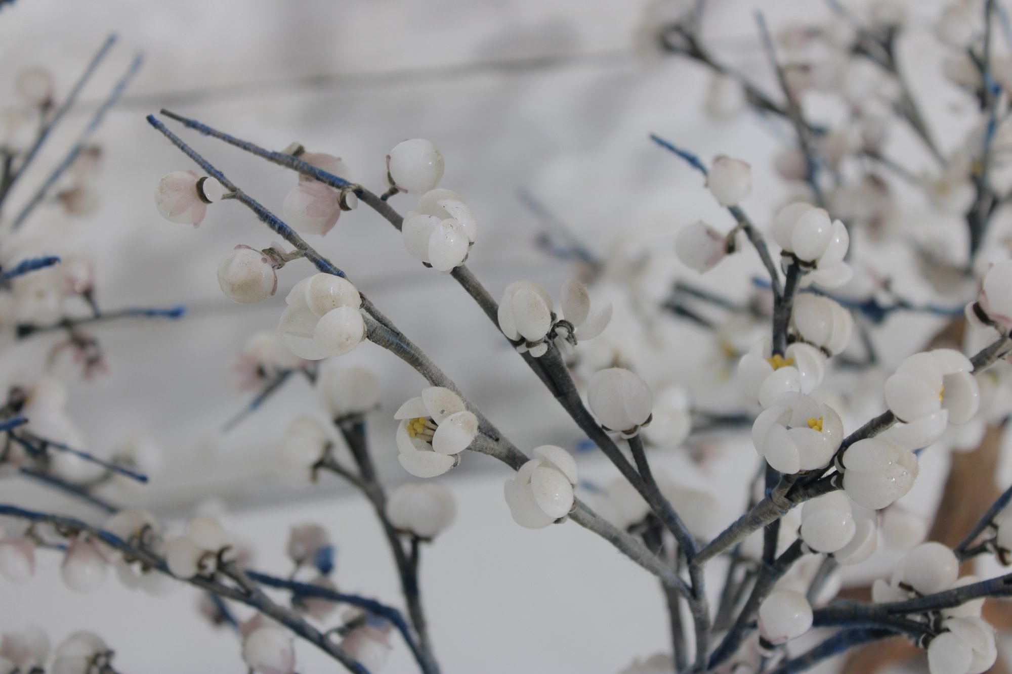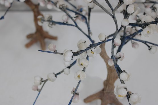 These elegant tabletop trees feature detailed brown trunks with branching limbs adorned in delicate white blossoms. The blossoms resemble cherry or plum flowers, creating a soft, natural look that works beautifully in spring décor, wedding displays, or year-round accent styling.