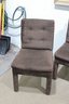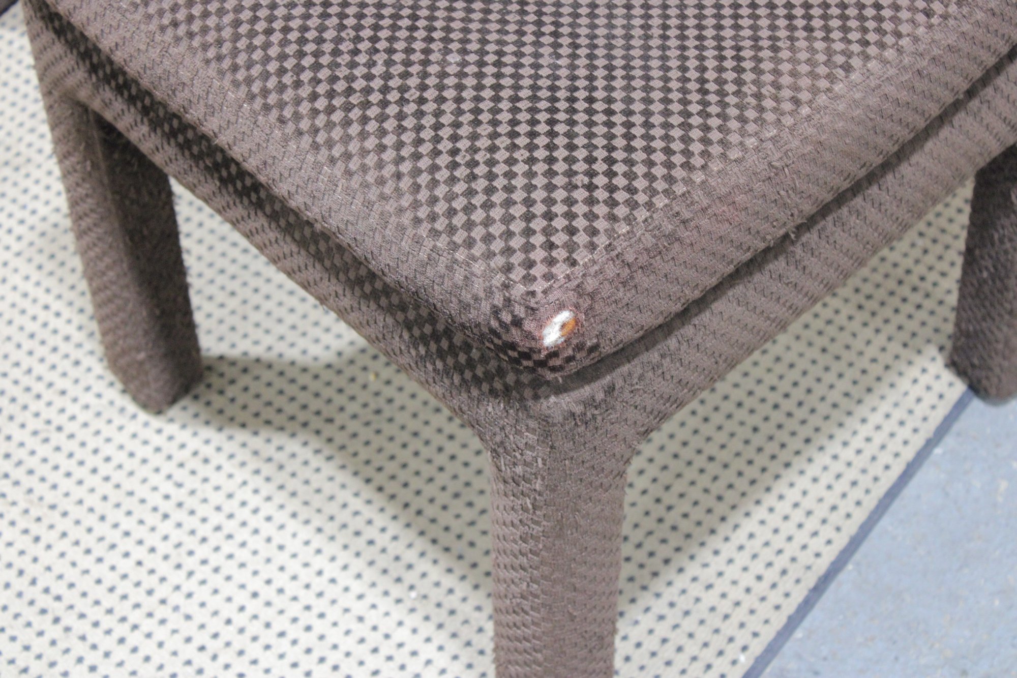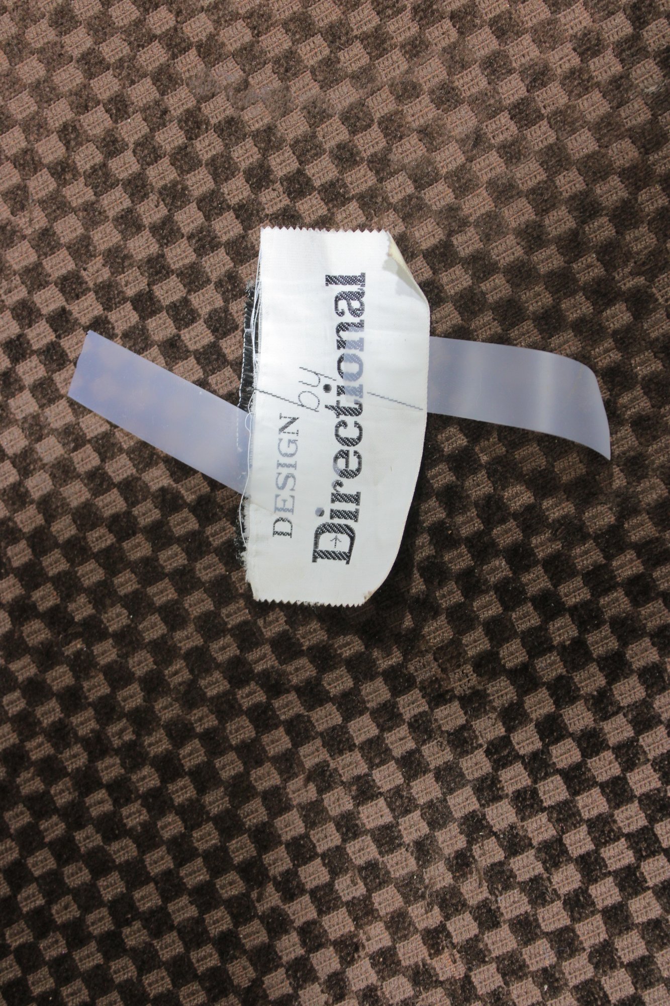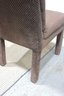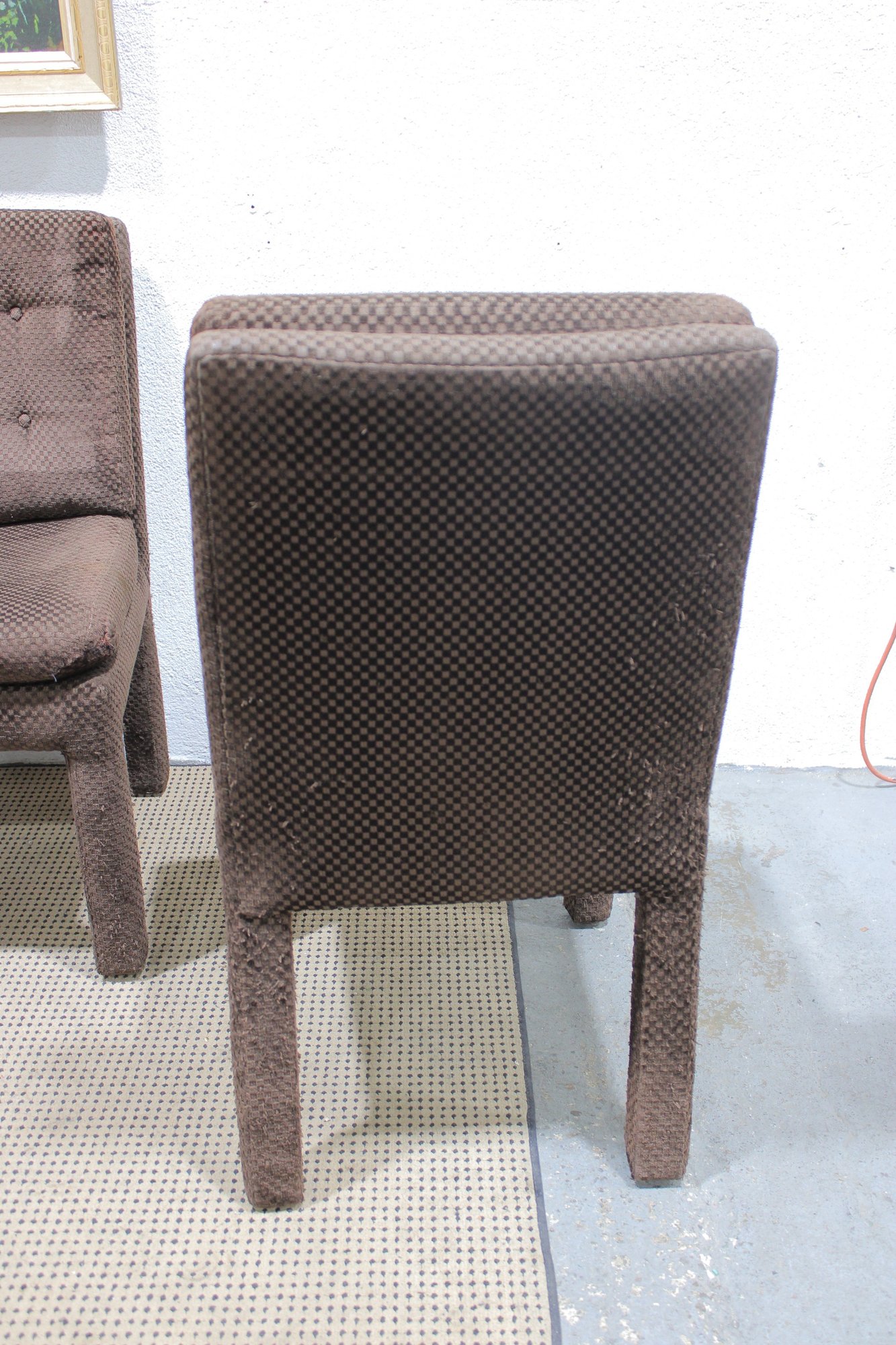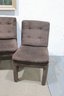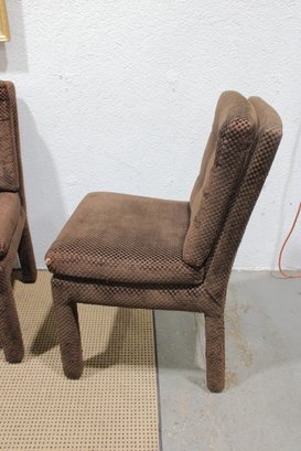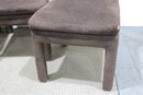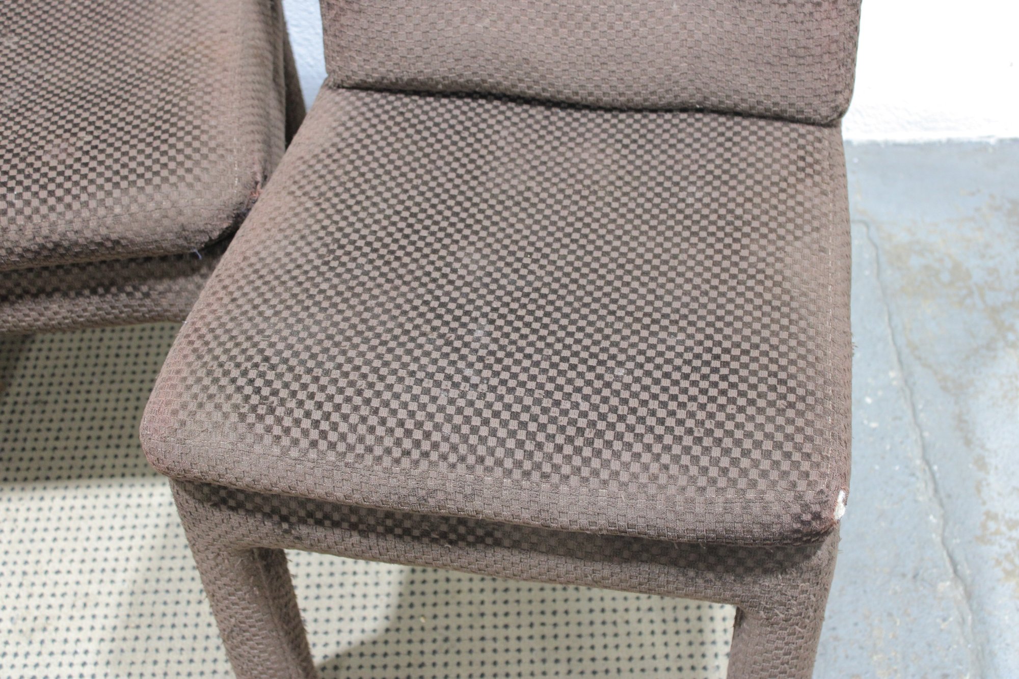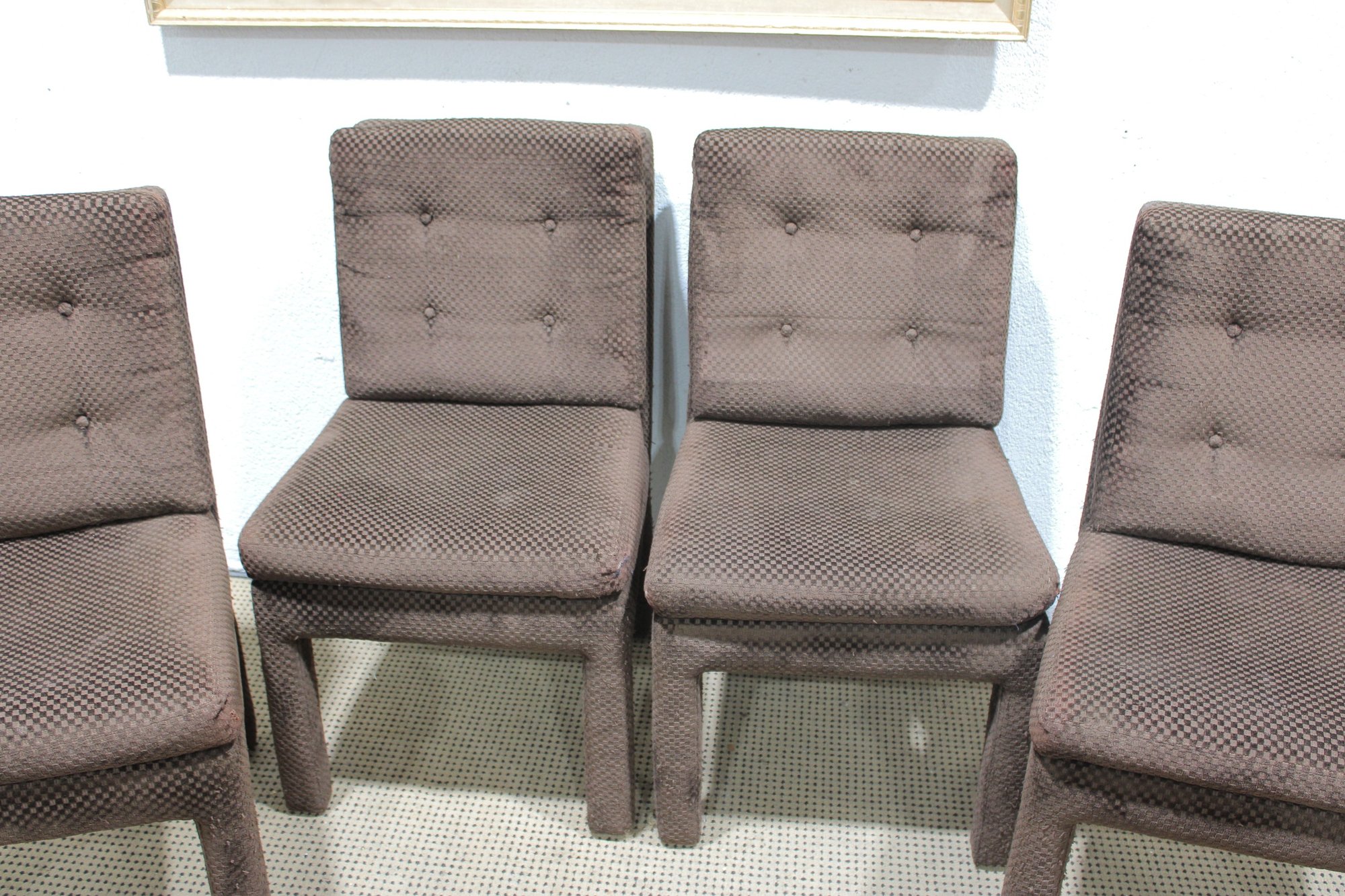 set of four upholstered dining chairs by Directional, known for their high-quality modern furnishings. These chairs feature a clean, tailored silhouette with button-tufted backs and fully upholstered frames in a textured brown patterned fabric.