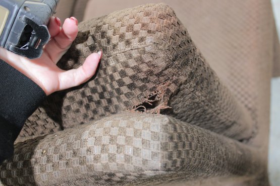 **Fabric shows light wear, with some minor fraying/pulls and small spots visible (see photos for details). Frames are sturdy and structurally sound.