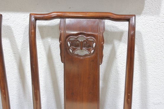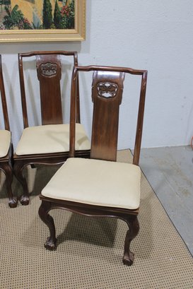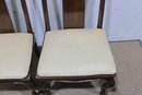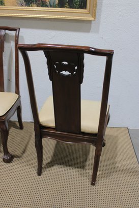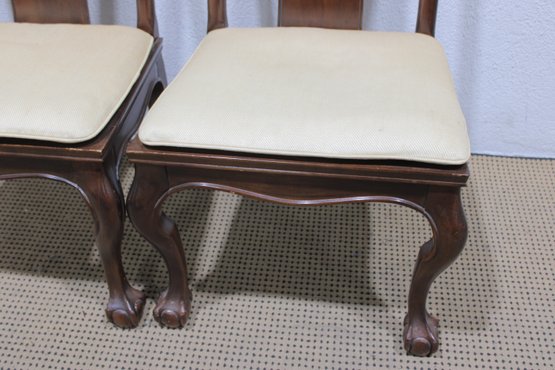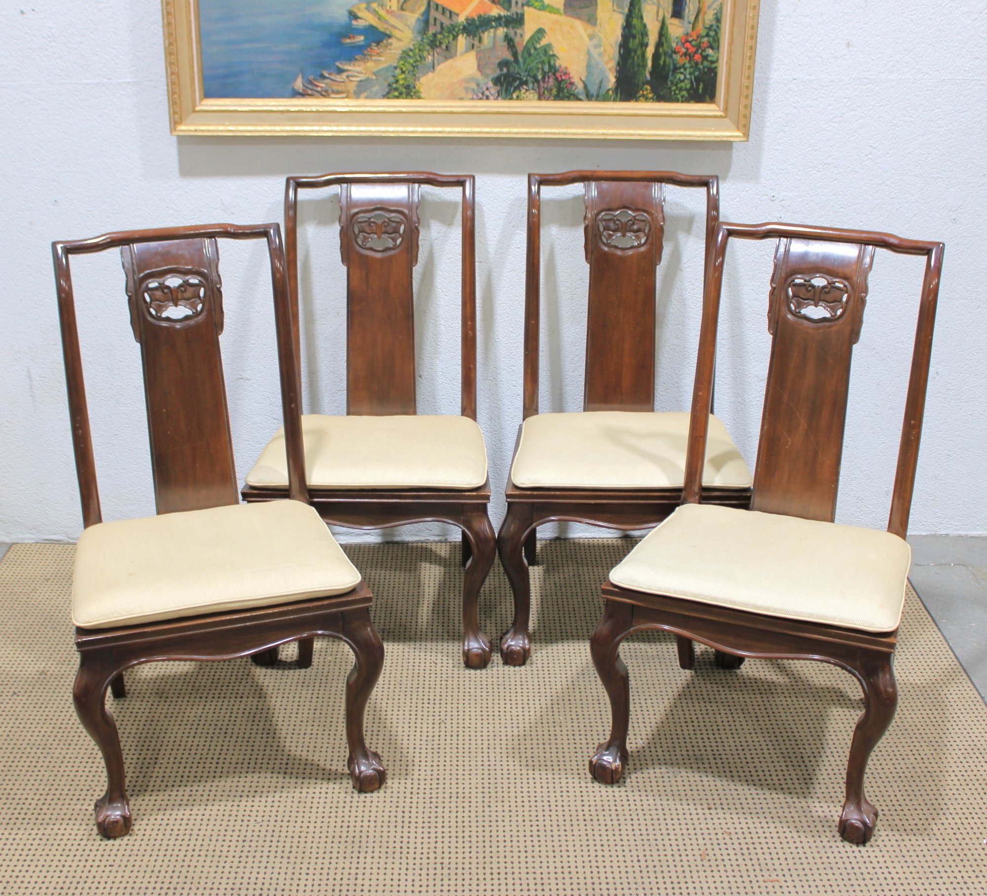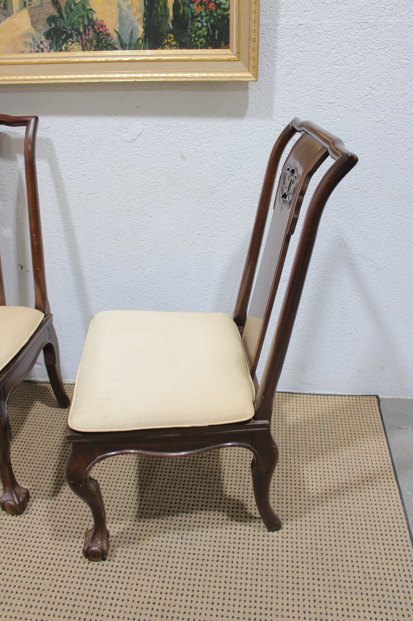 set of four Drexel Heritage “Shirley Sacket” dining chairs crafted in rich mahogany. These refined chairs feature a classic Chippendale-inspired design with carved back splats, gracefully curved crest rails, and cabriole legs ending in ball-and-claw style feet.