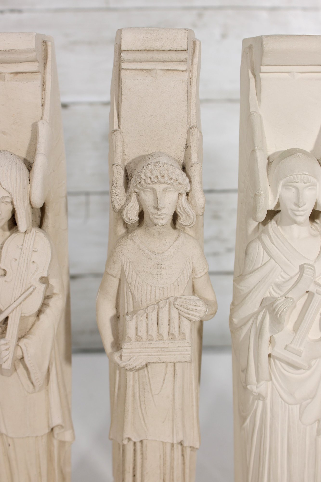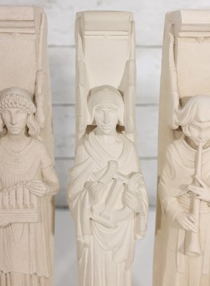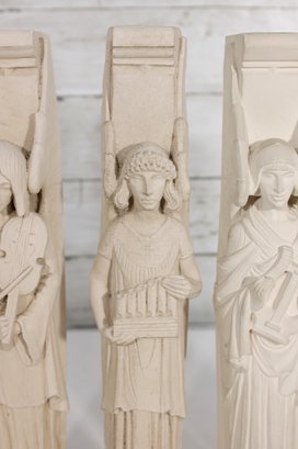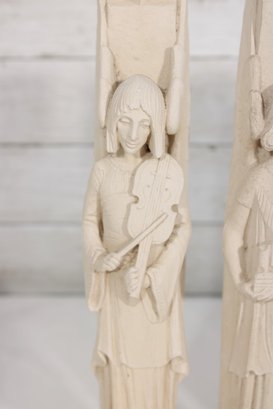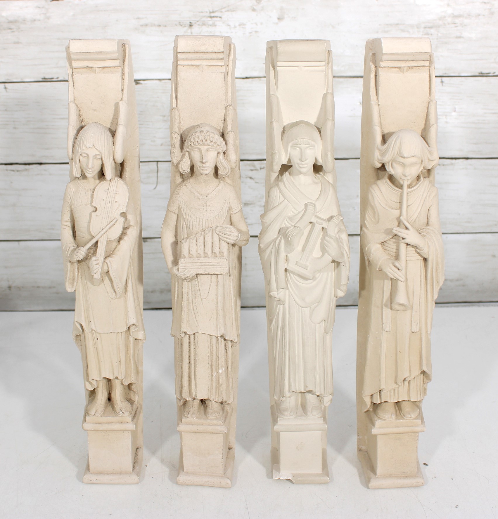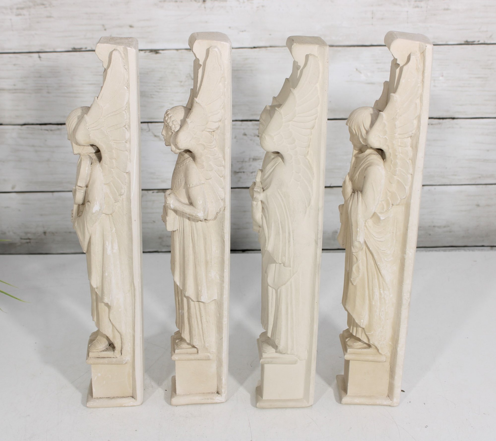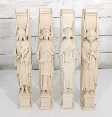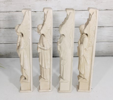 Beautiful set of four Facsimilies Ltd. angel wall plaques, featuring elegant, elongated figures in a classic angelic theme. Each panel depicts a serene figure holding symbolic objects such as musical instruments and scrolls, rendered in soft, monochromatic chalkware.