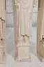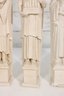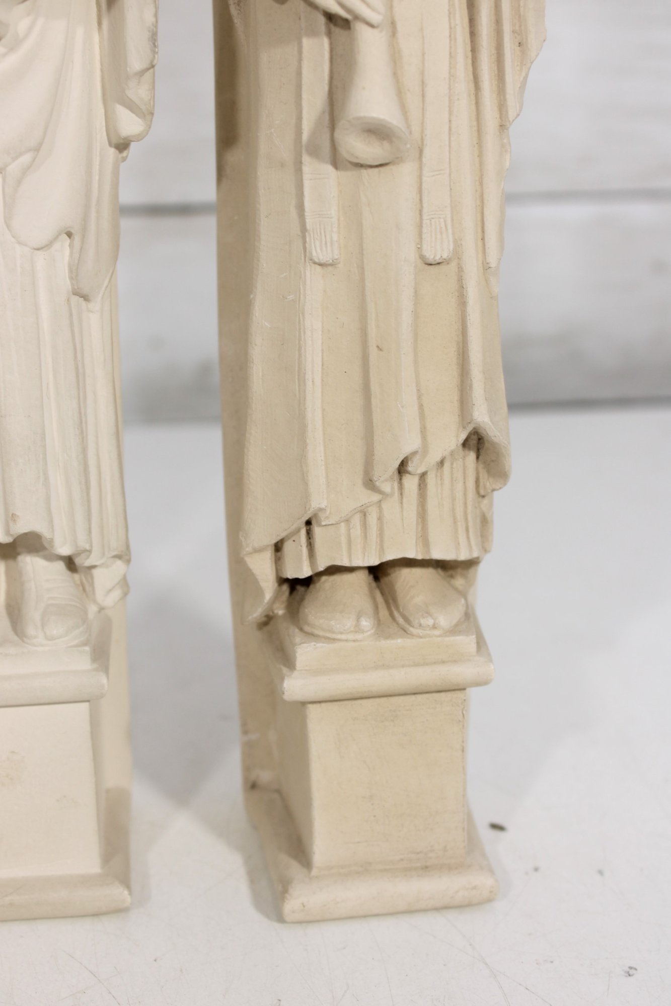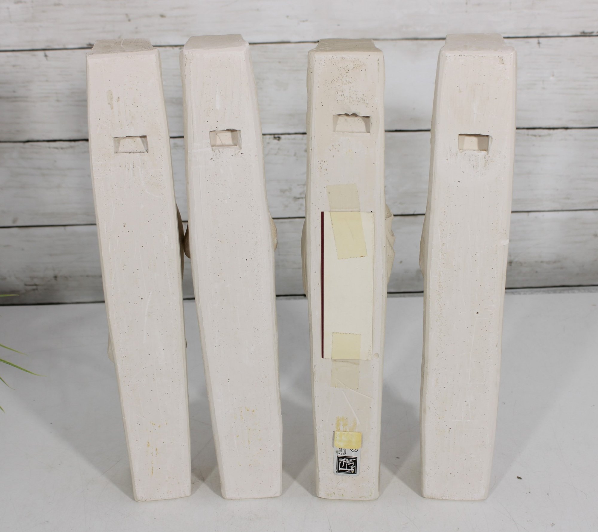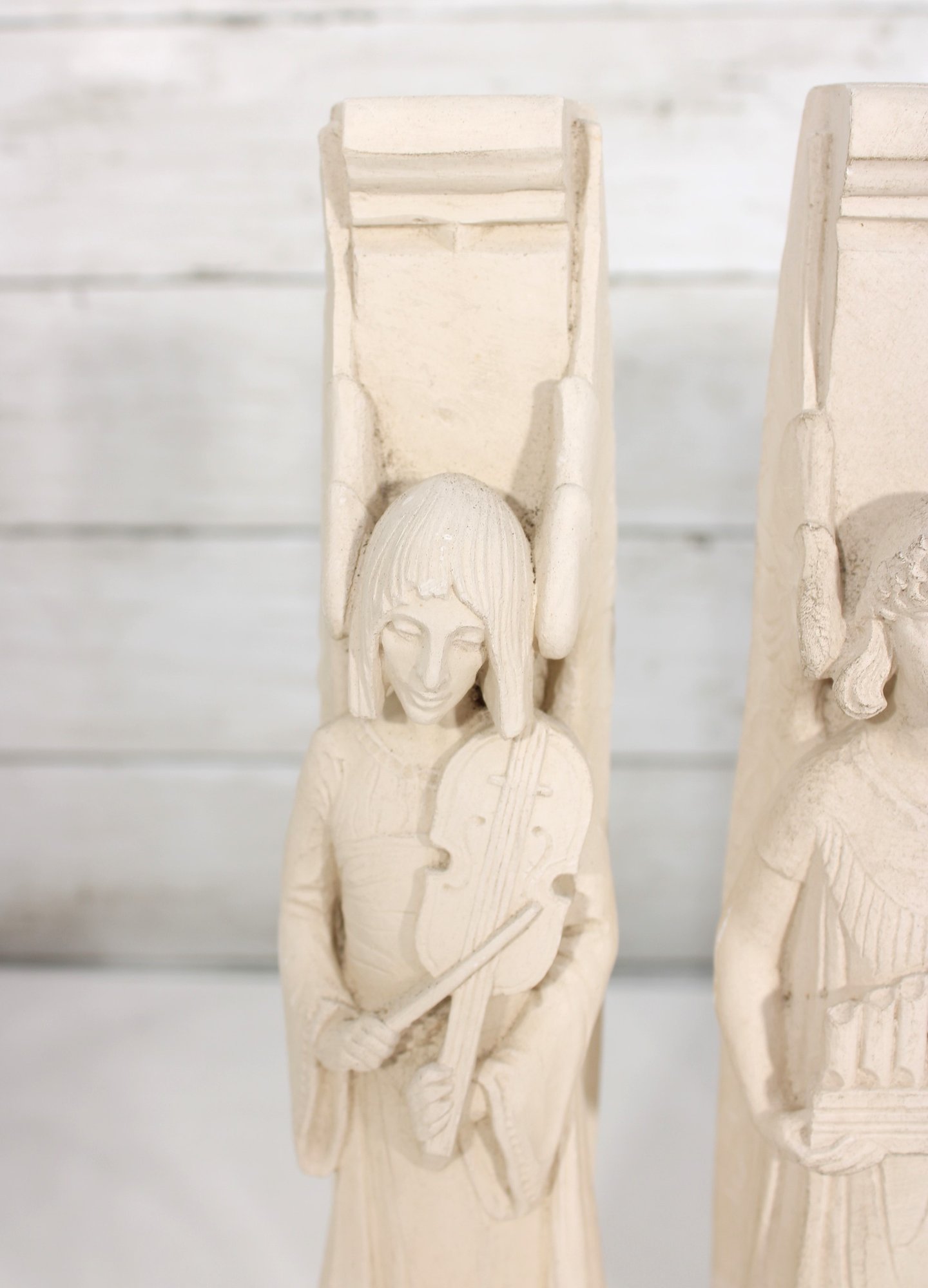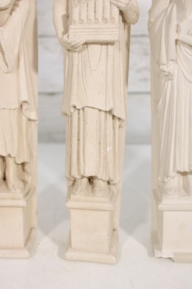 Beautiful set of four Facsimilies Ltd. angel wall plaques, featuring elegant, elongated figures in a classic angelic theme. Each panel depicts a serene figure holding symbolic objects such as musical instruments and scrolls, rendered in soft, monochromatic chalkware.