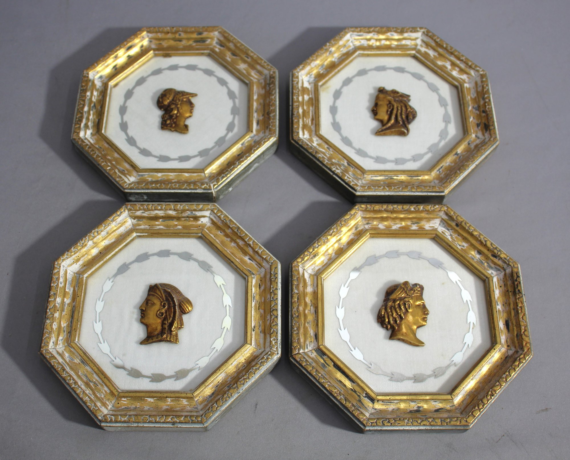 Each plaque presents a high-relief cameo, reminiscent of ancient Greek and Roman artistry, celebrating the profile of distinguished figures in a regal composition.