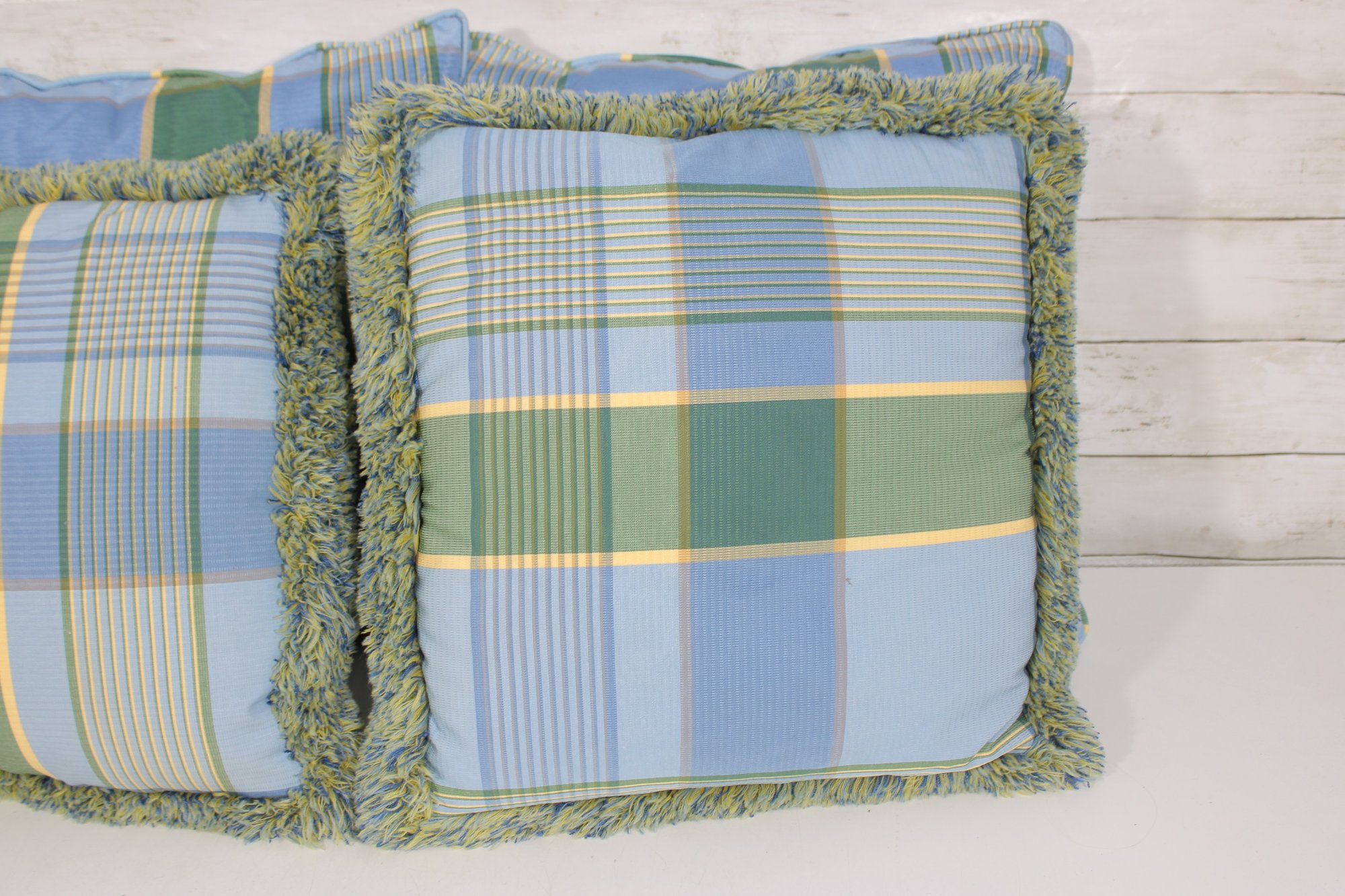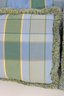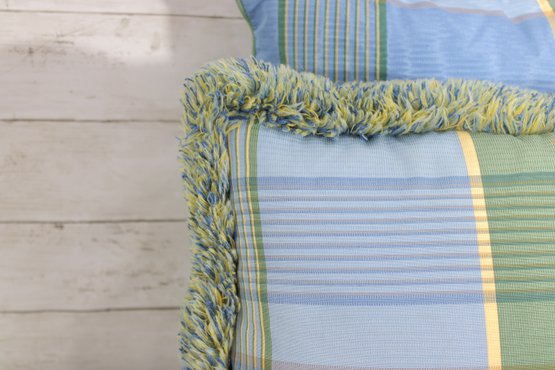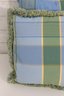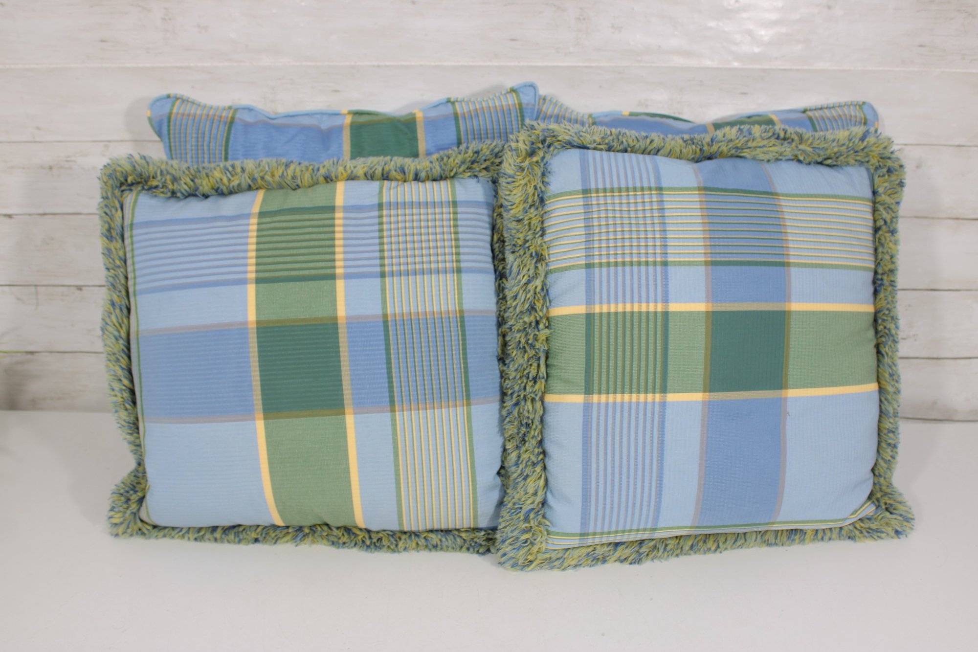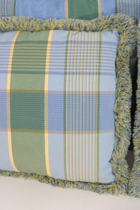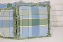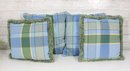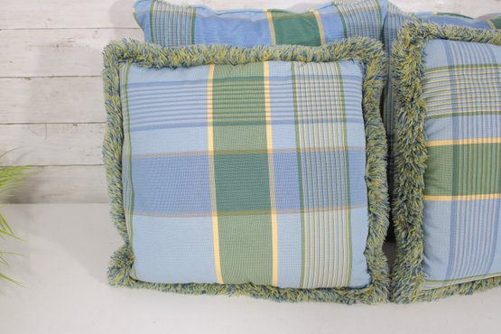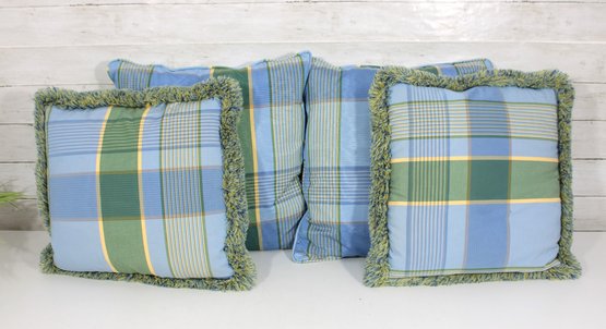set of four decorative throw pillows featuring a stylish blue and green plaid pattern. Two pillows include a textured fringe trim for added visual interest, while the coordinating pair features a matching plaid design without fringe.