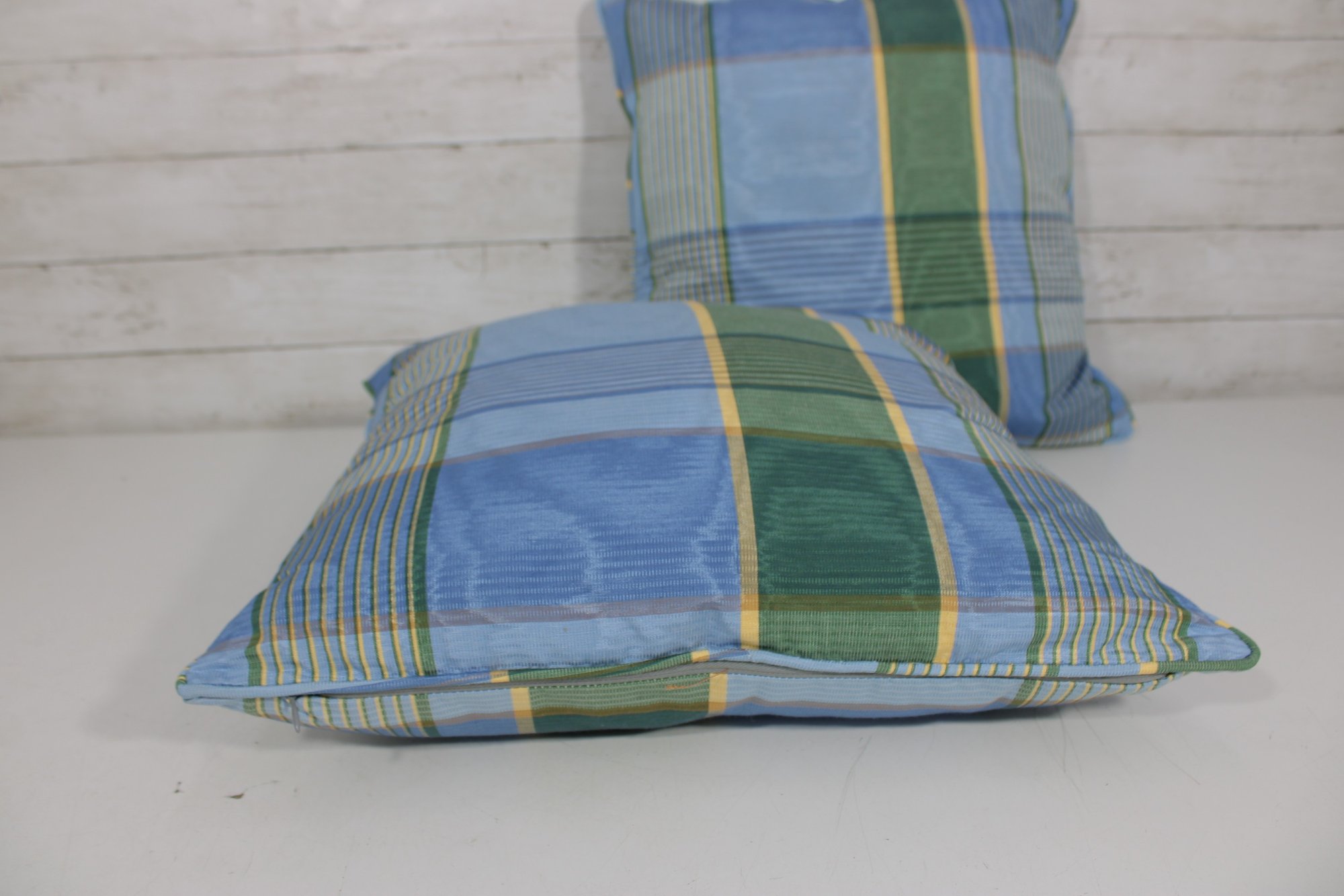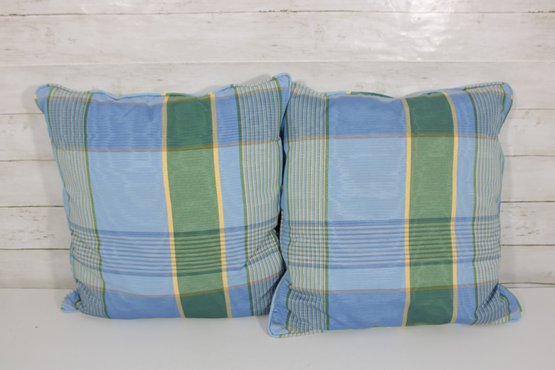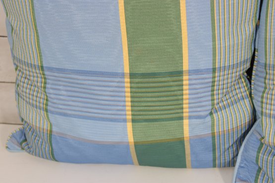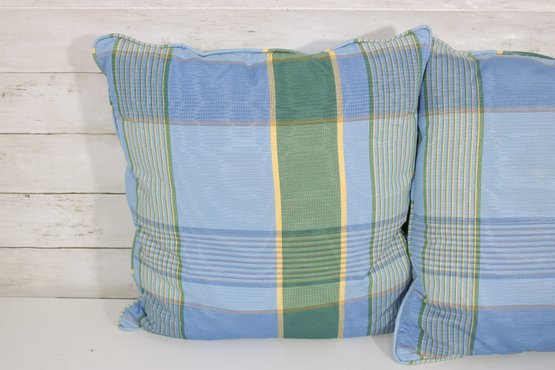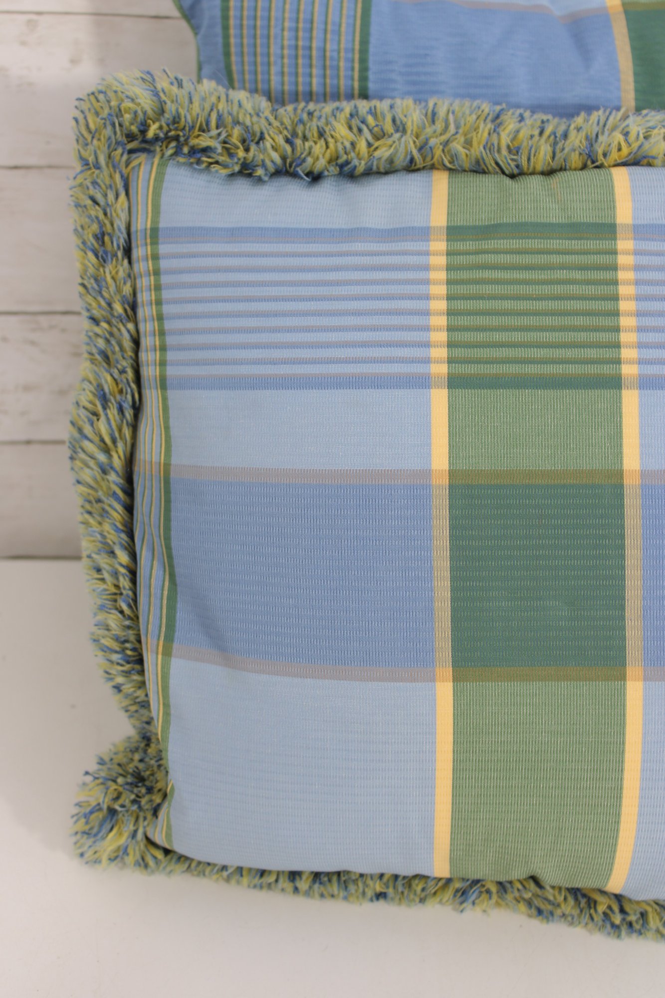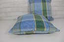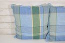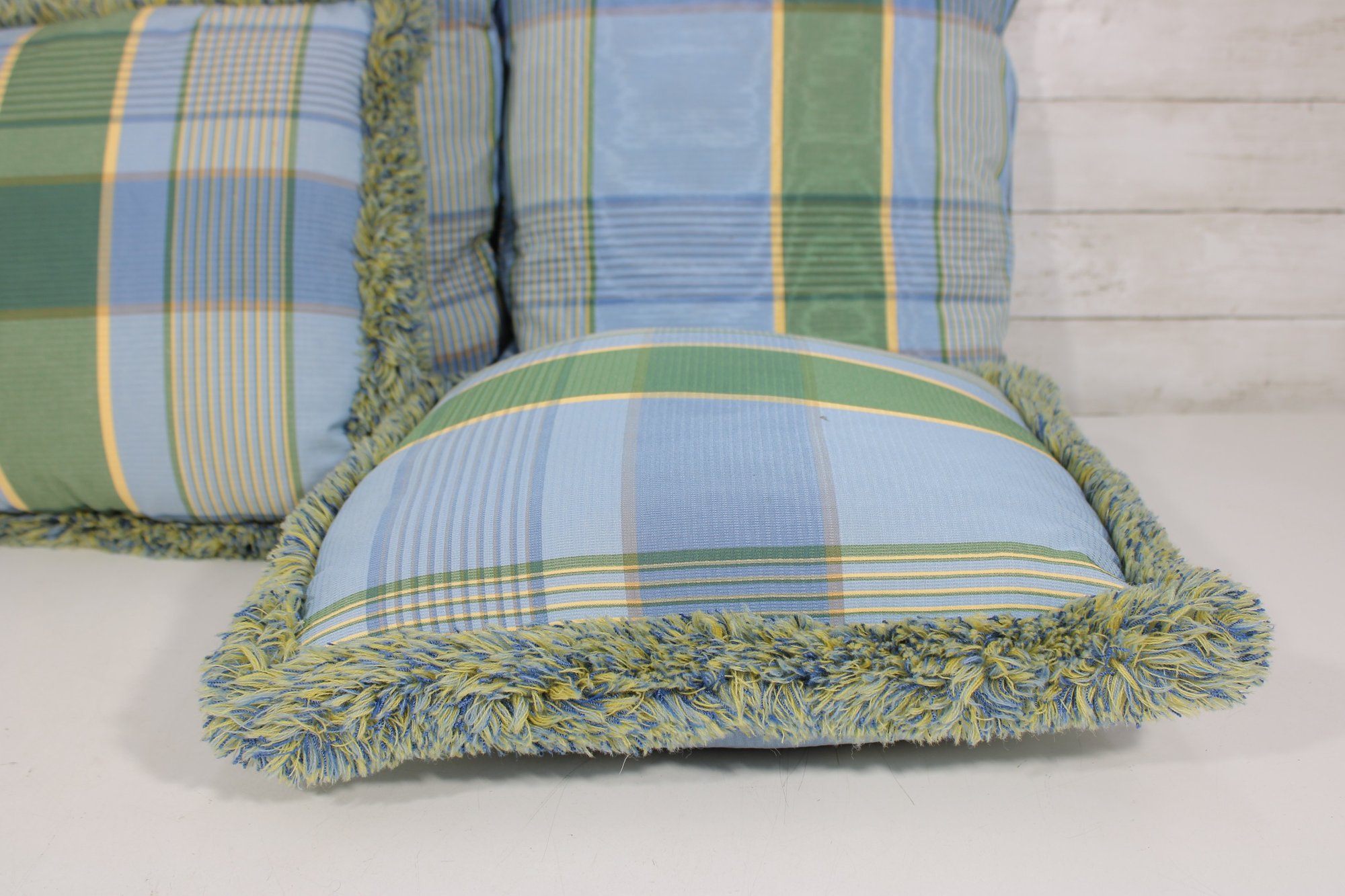 set of four decorative throw pillows featuring a stylish blue and green plaid pattern. Two pillows include a textured fringe trim for added visual interest, while the coordinating pair features a matching plaid design without fringe.