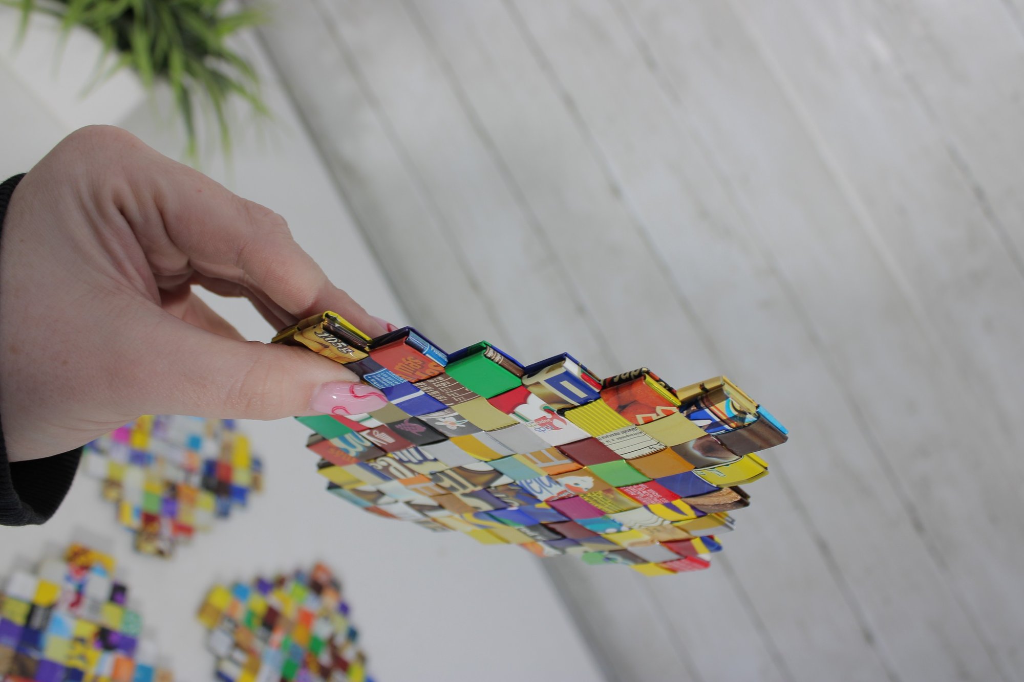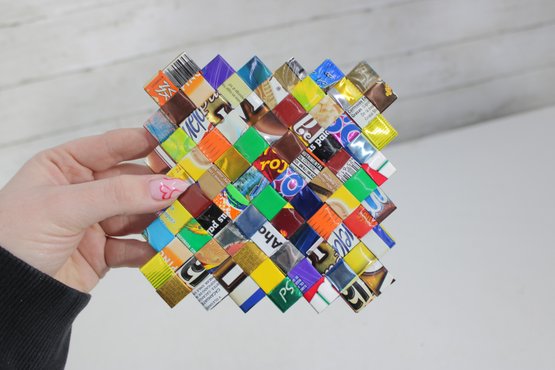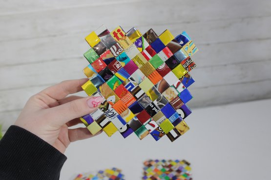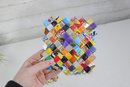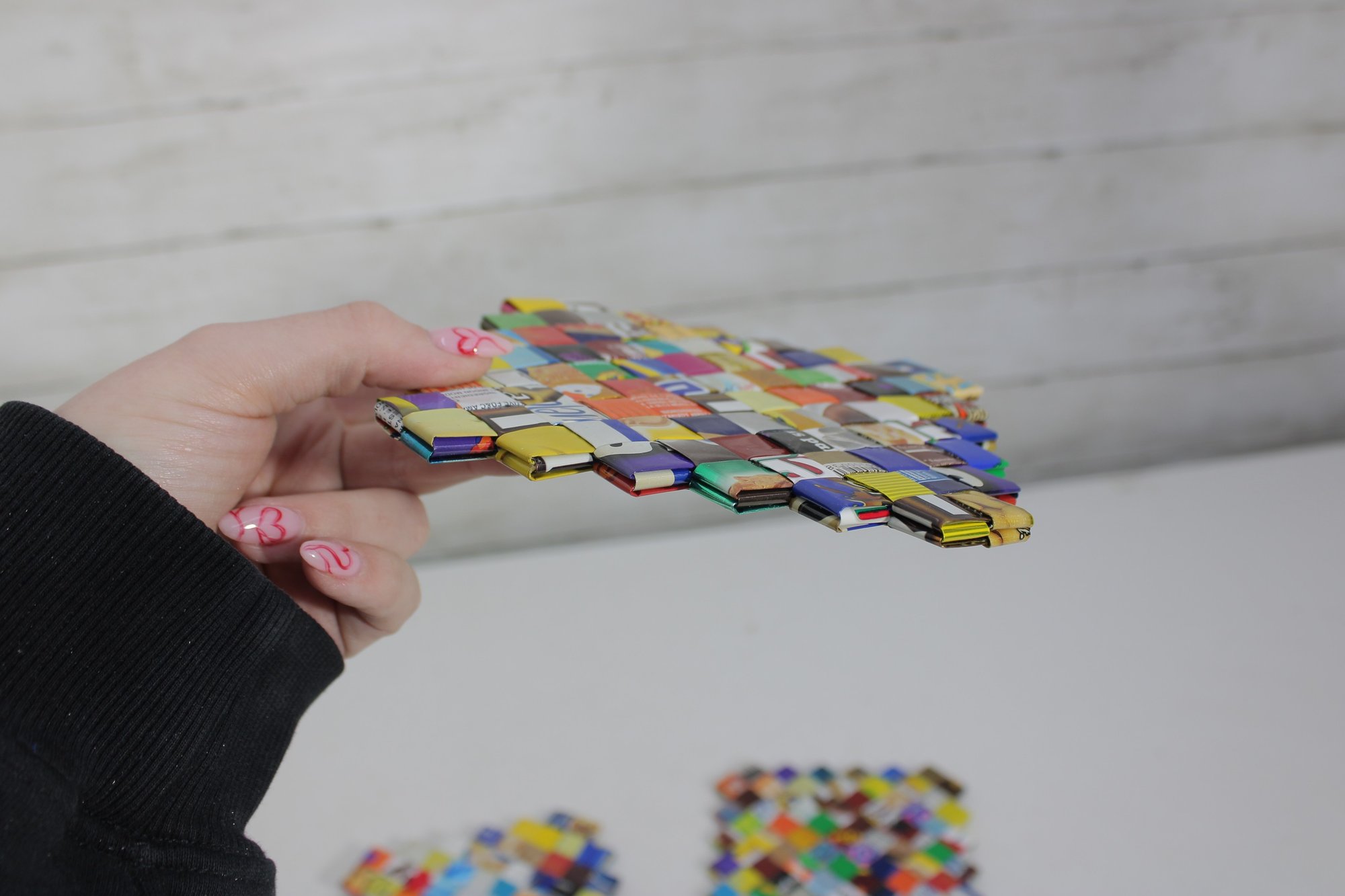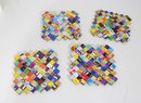set of 4 handmade mosaic coasters crafted from colorful recycled magazine pages. Each piece features a tightly woven patchwork of tiny paper squares, creating a vibrant, abstract design full of texture and visual interest.