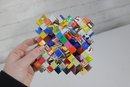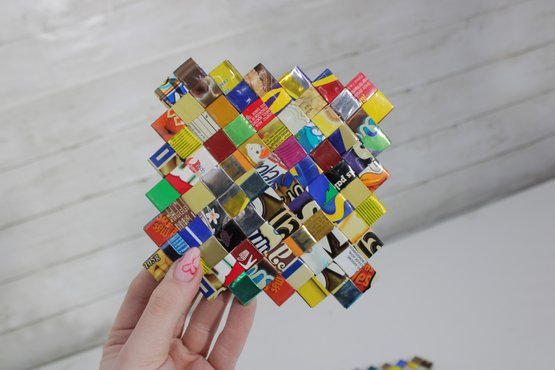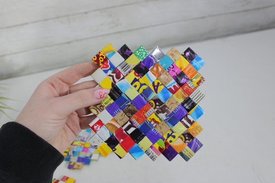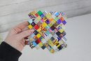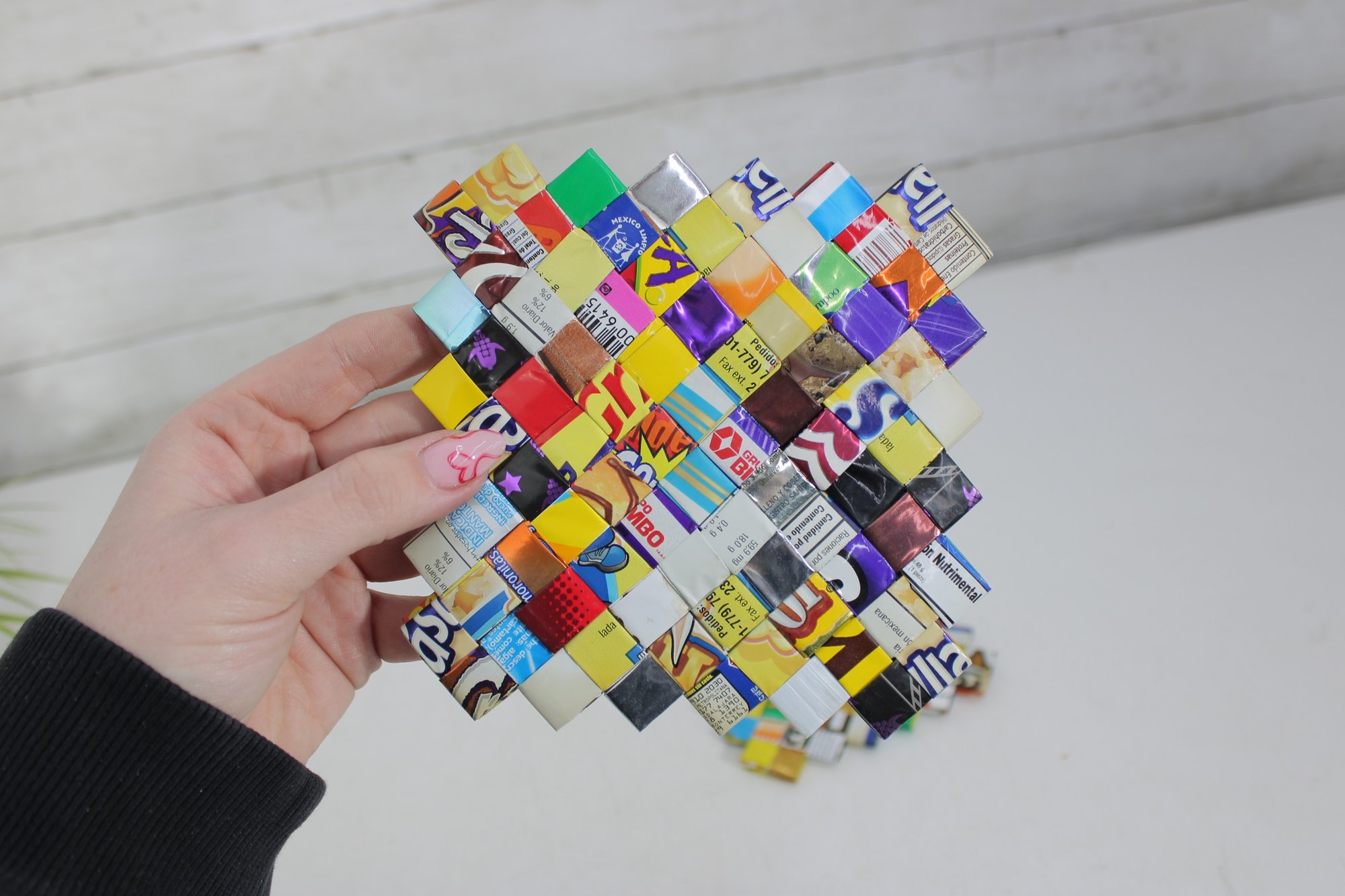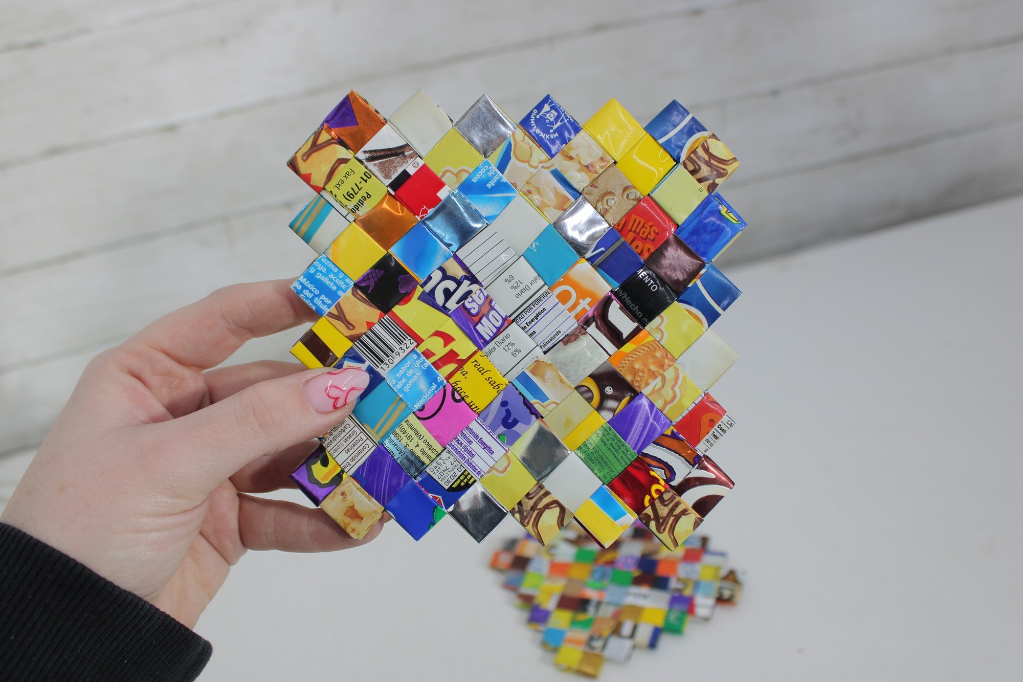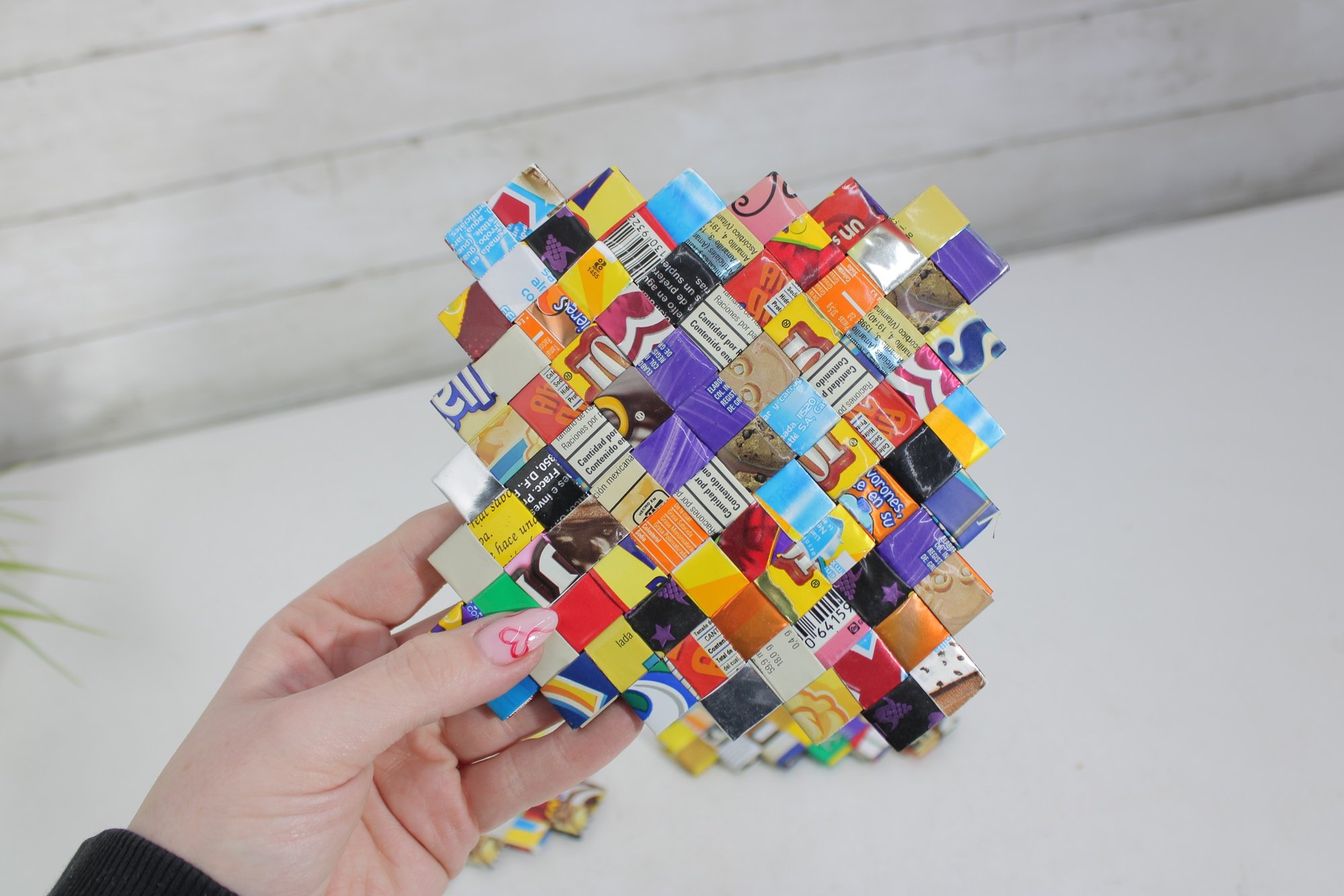 set of 4 handmade mosaic coasters crafted from colorful recycled magazine pages. Each piece features a tightly woven patchwork of tiny paper squares, creating a vibrant, abstract design full of texture and visual interest.