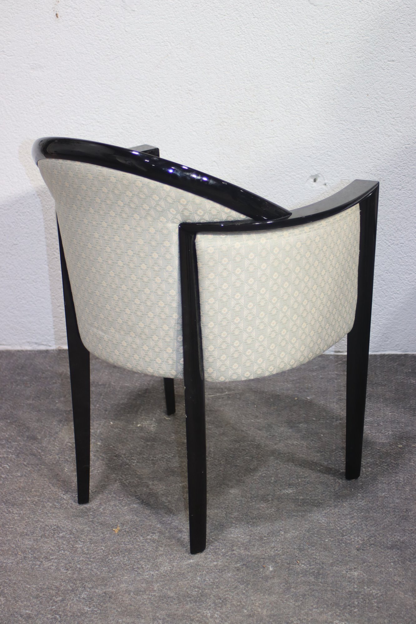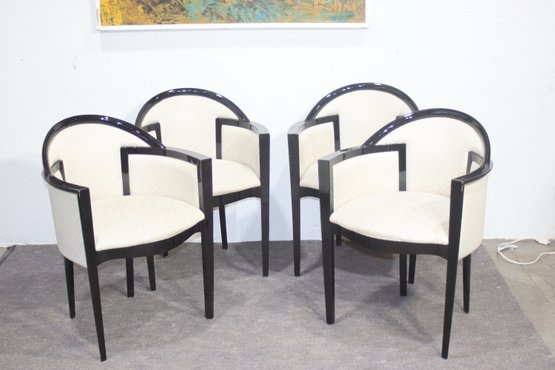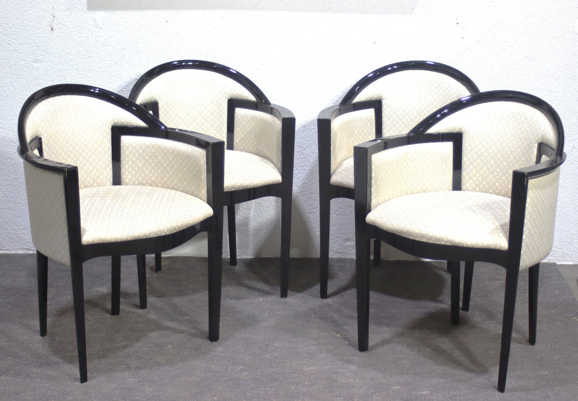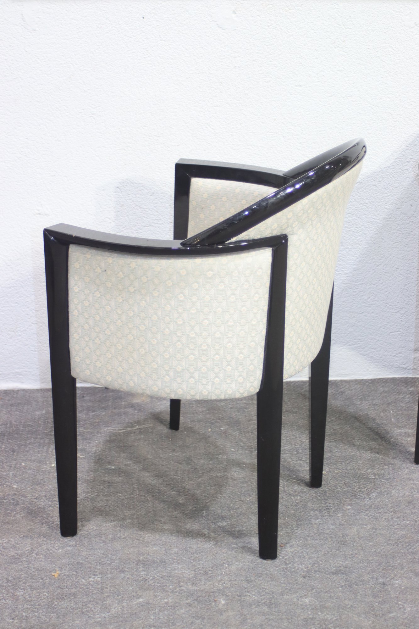 This stunning set of four Roche Bobois armchairs features a bold Art Deco-inspired design with elegant black lacquered frames and geometric-patterned upholstery. Known for their luxury craftsmanship, these chairs blend modern sophistication with classic aesthetics, making them a striking addition to any dining or living space.