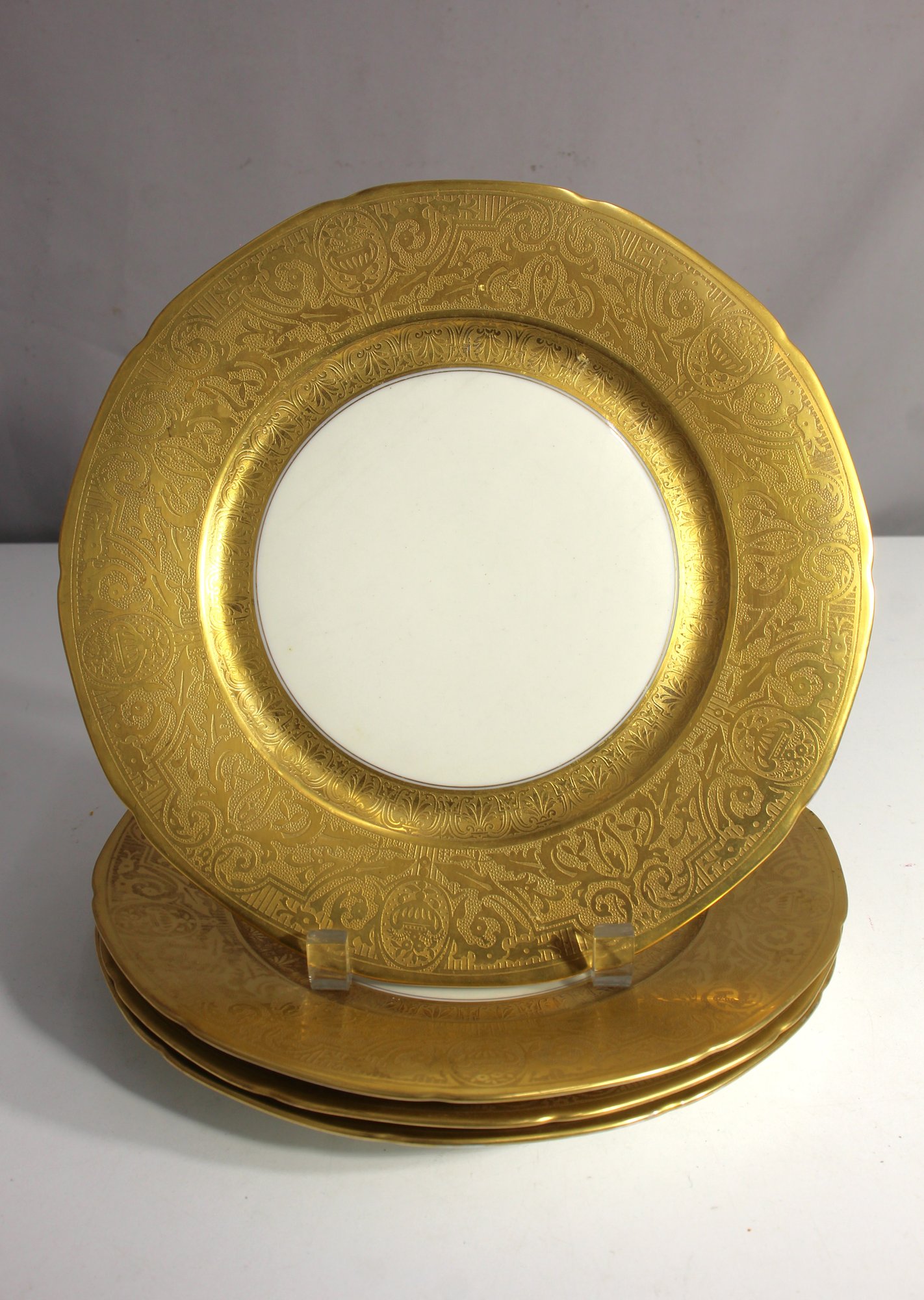 each measuring 11 inches in diameter, is adorned with a rich 22K gold embossed rim. The intricate floral and scrollwork patterns around the edges add a regal touch, making these plates perfect for formal dining or as luxurious display pieces.