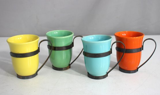 mid-century charm to your collection with this vintage El Patio mug in a lovely green glaze, complete with its original copper holder. Measuring approximately 3.5 inches in height, this collectible piece showcases the classic El Patio design, known for its vibrant colors and stylish metal accents. The sturdy ceramic mug sits snugly in the removable copper frame, featuring a gracefully curved handle for easy holding.