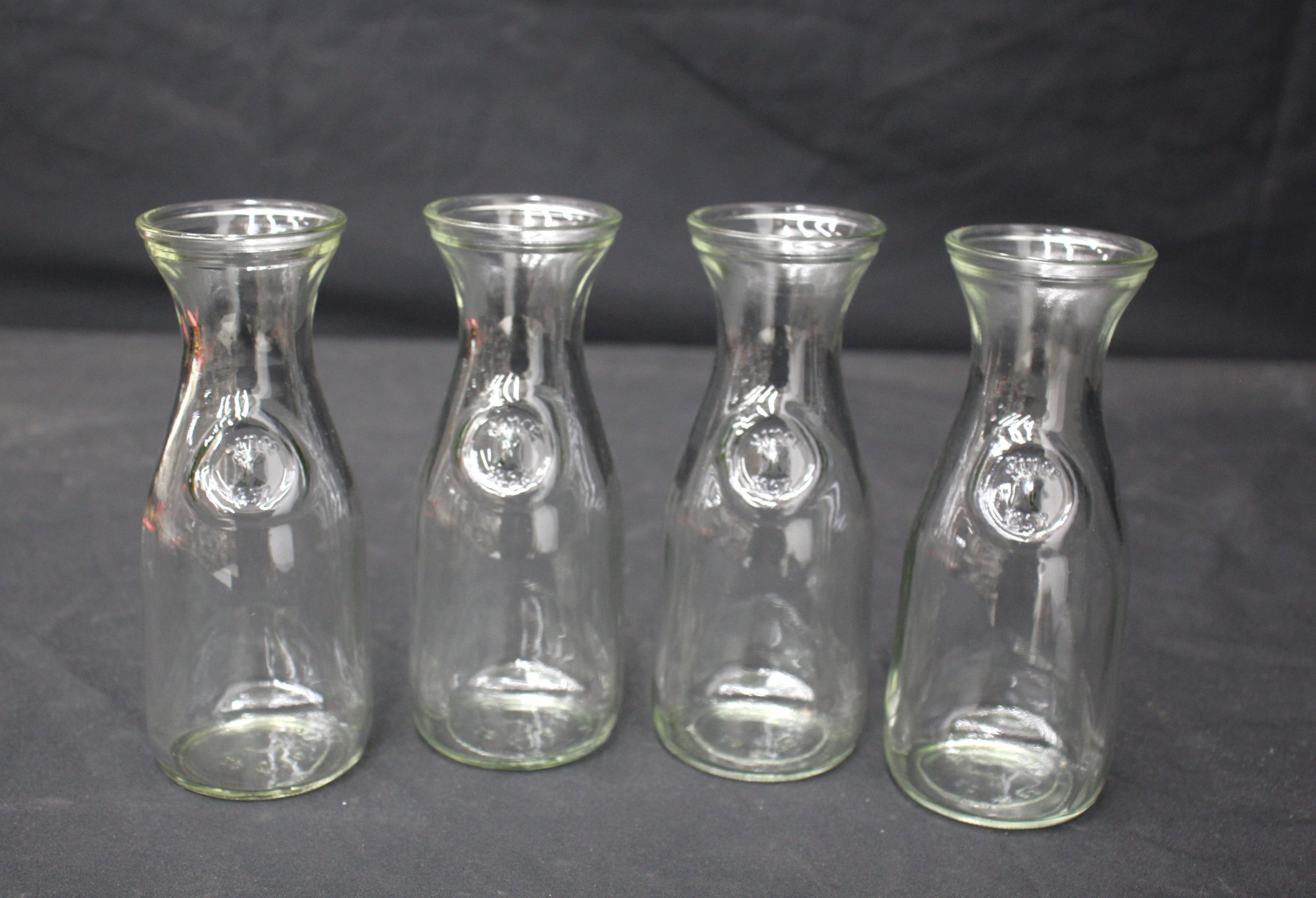 This set of four charming vintage glass carafes stands 7 inches tall and features an embossed seal for added character. Each carafe has a classic shape with a flared neck, perfect for serving water, wine, or juice in a stylish and understated manner. These carafes make a wonderful addition to any vintage glassware collection or an elegant touch to your dining table. Ideal for collectors or as unique serving pieces for gatherings and special occasions.