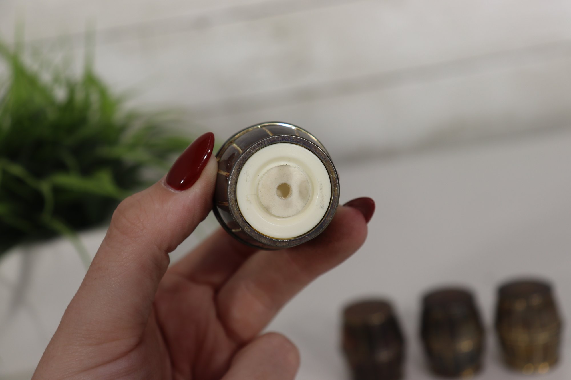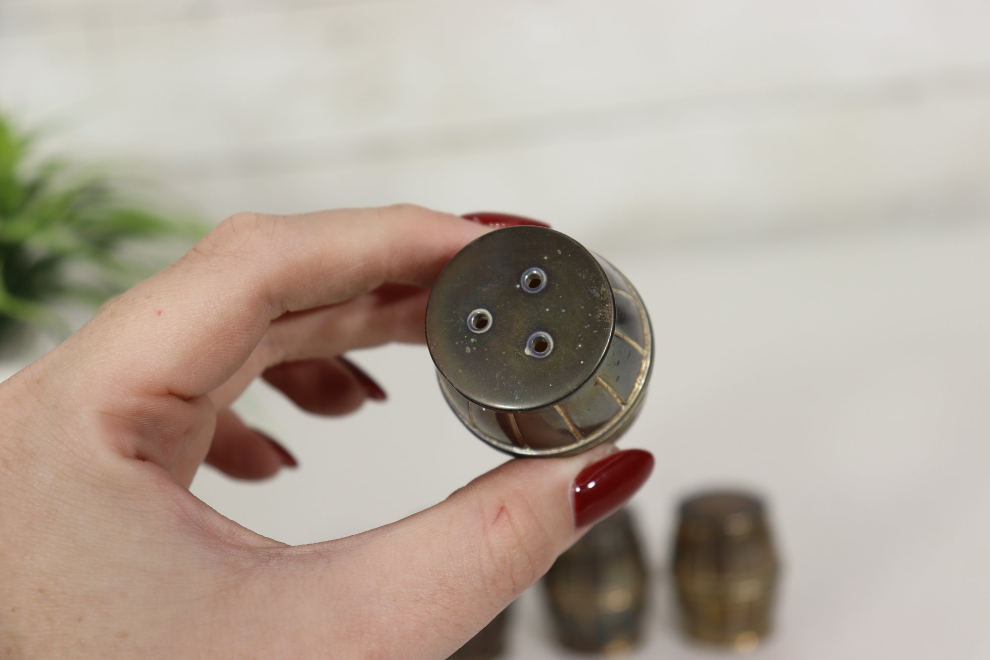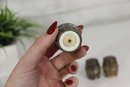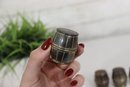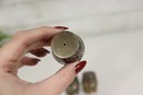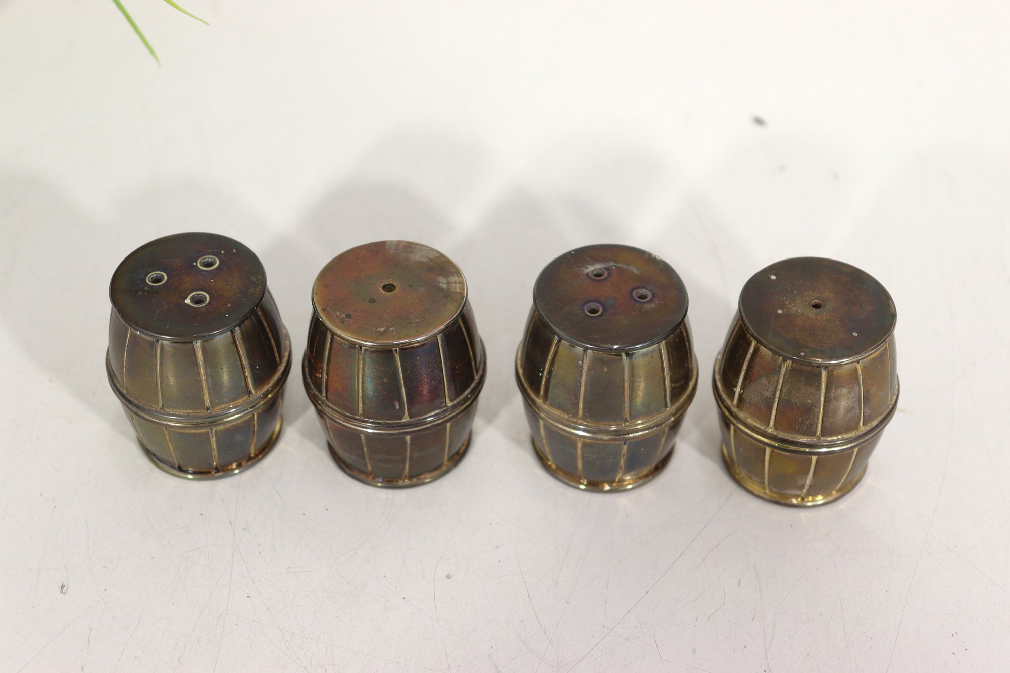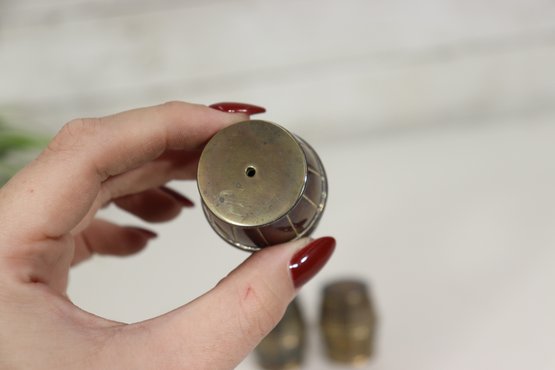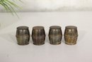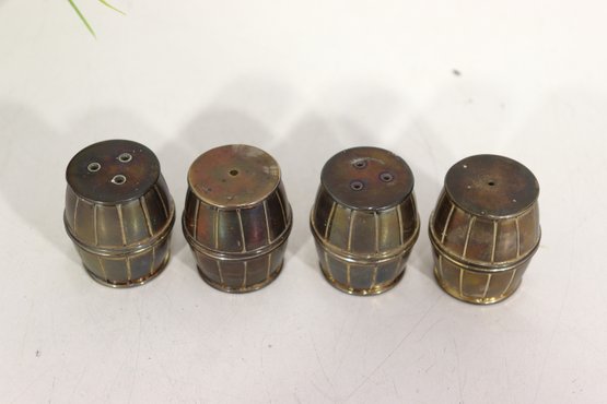 Charming and collectible, this set of 4 miniature barrel-shaped metal salt and pepper shakers stands just 1.5 inches tall, each crafted with fine barrel detailing and a warm aged patina.