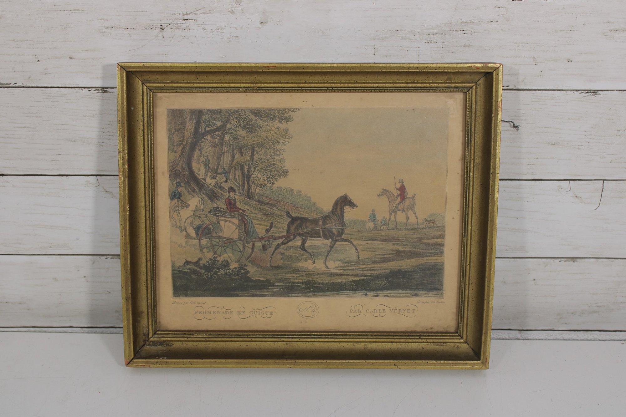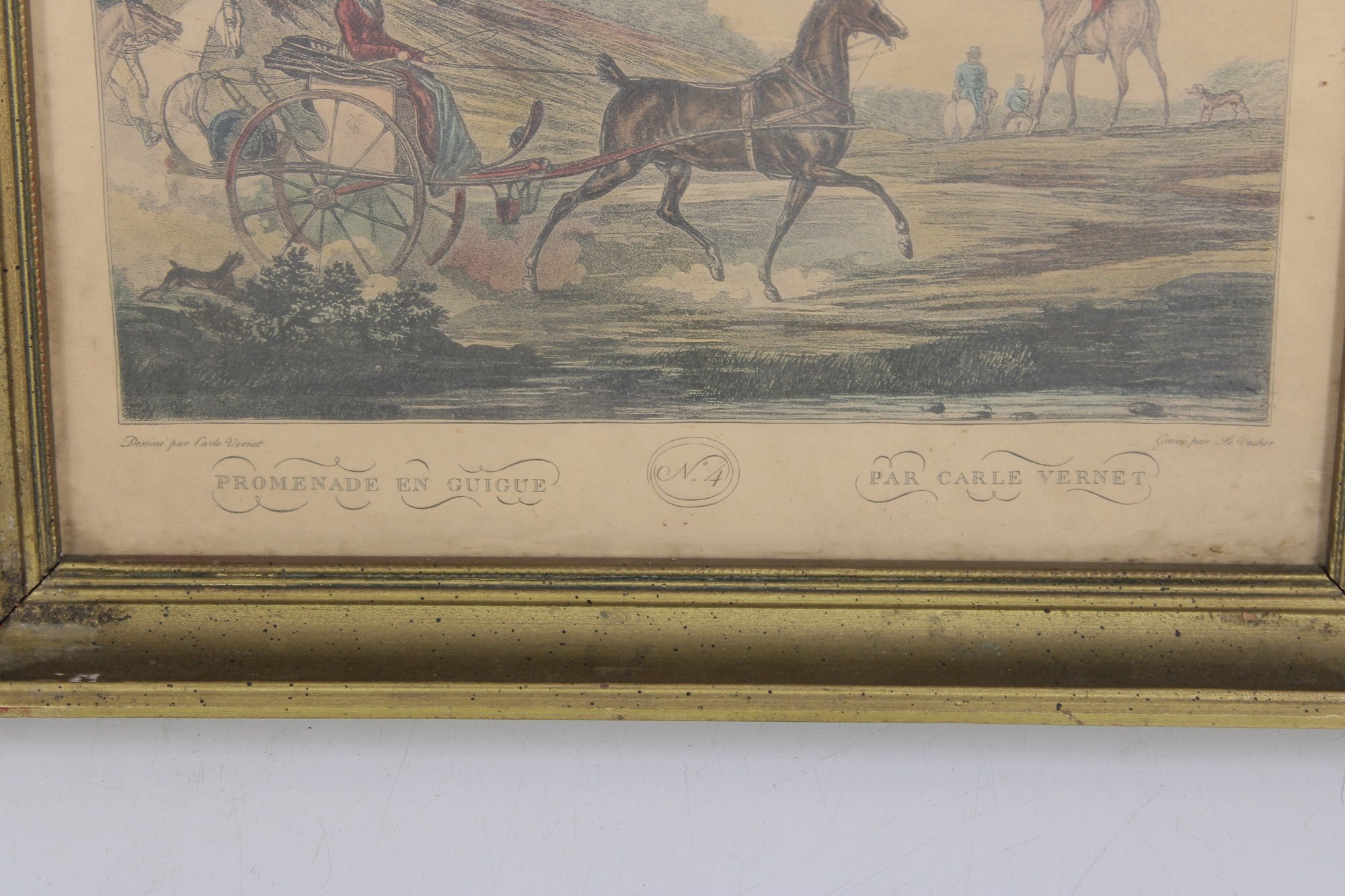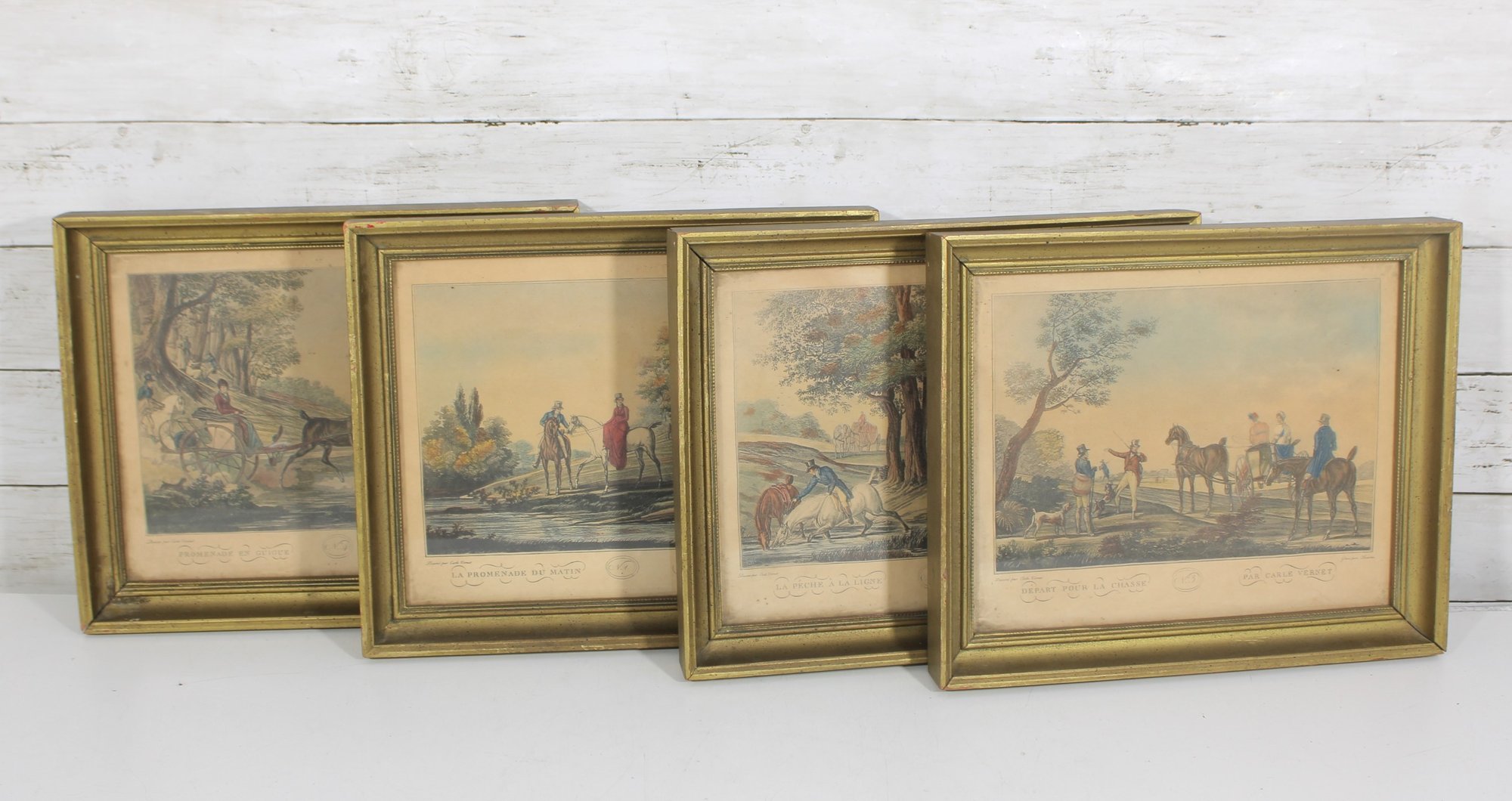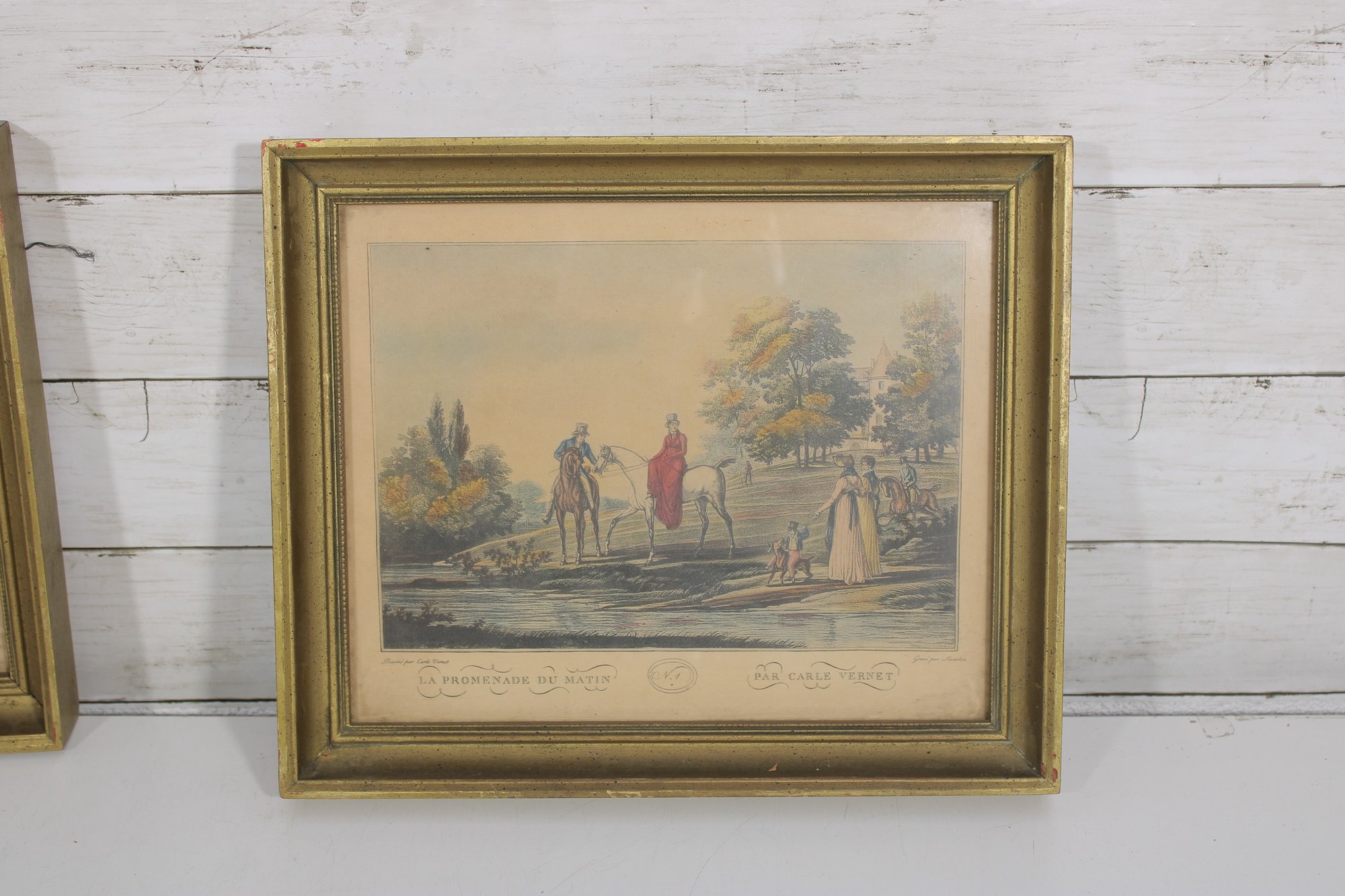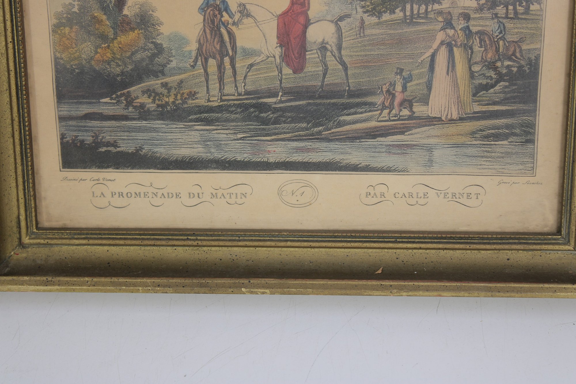 The prints appear to be French titled scenes, including titles such as La Promenade du Matin and other leisurely riding or carriage moments typical of 18th–19th century European sporting and leisure illustrations. The artwork captures the refined atmosphere of aristocratic country life with detailed costumes, horses, and scenic backgrounds.