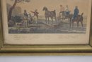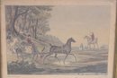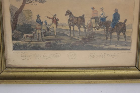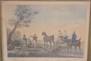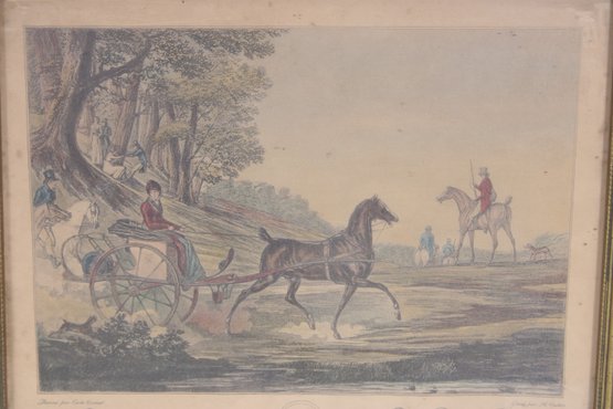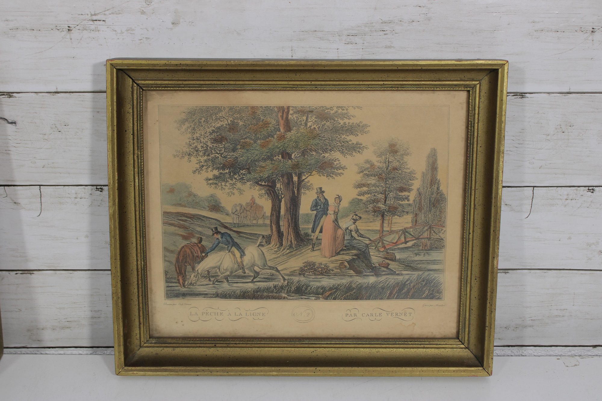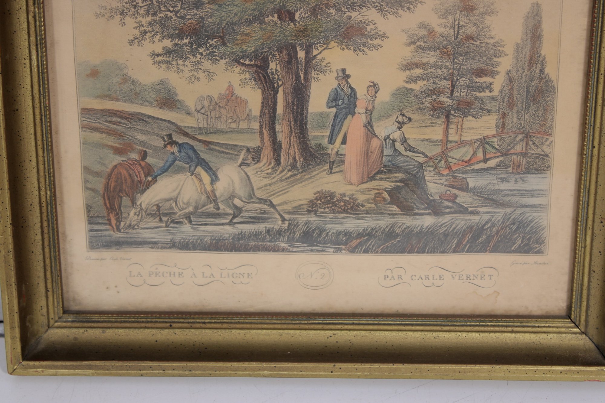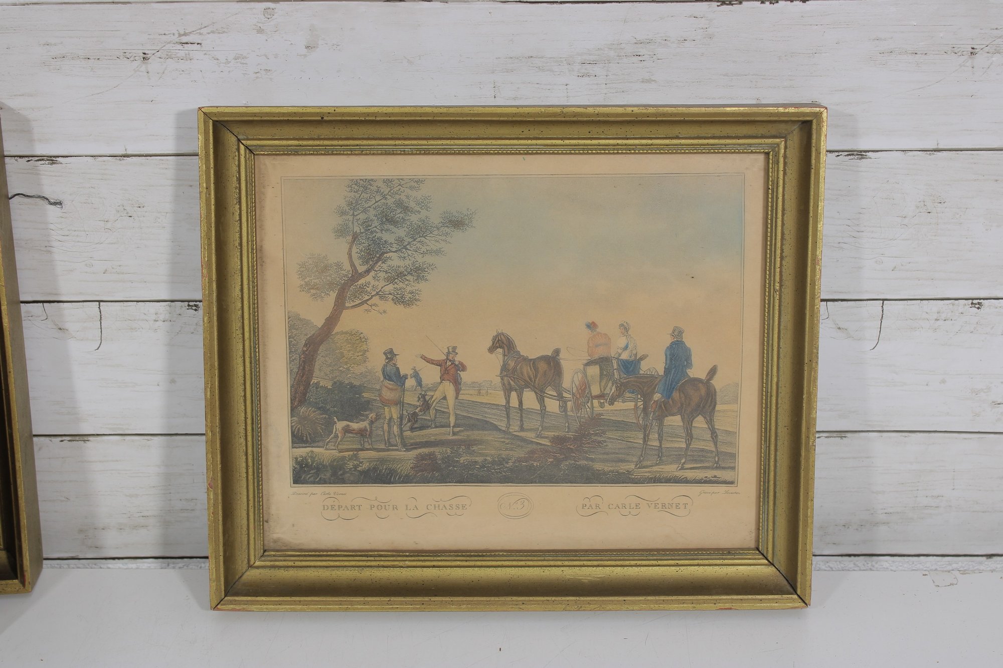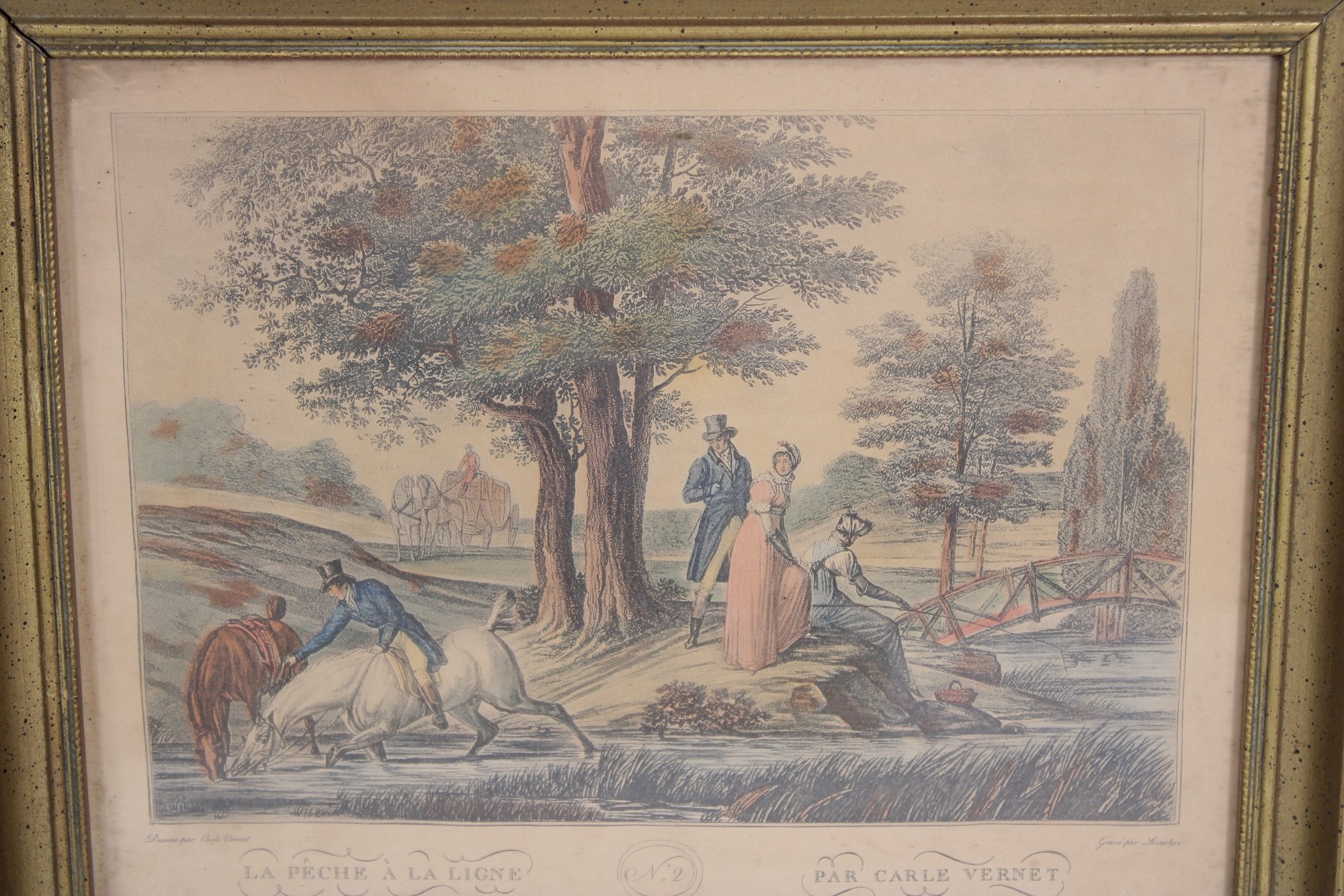 The prints appear to be French titled scenes, including titles such as La Promenade du Matin and other leisurely riding or carriage moments typical of 18th–19th century European sporting and leisure illustrations. The artwork captures the refined atmosphere of aristocratic country life with detailed costumes, horses, and scenic backgrounds.