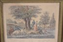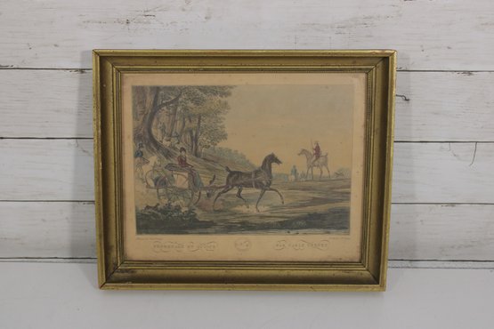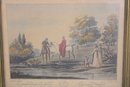 set of four vintage equestrian-themed prints depicting elegant horseback riding scenes in pastoral landscapes. Each print features finely dressed riders, horses, and figures enjoying the countryside, rendered in a delicate engraved style with soft hand-colored tones.