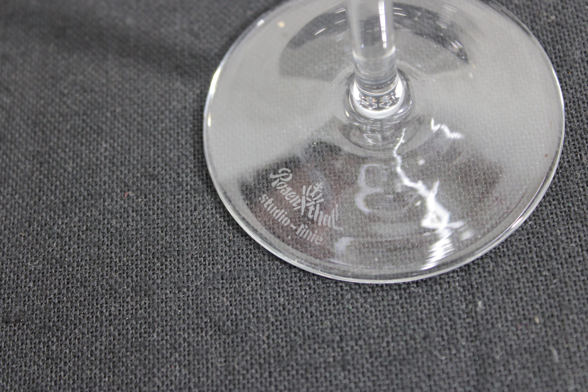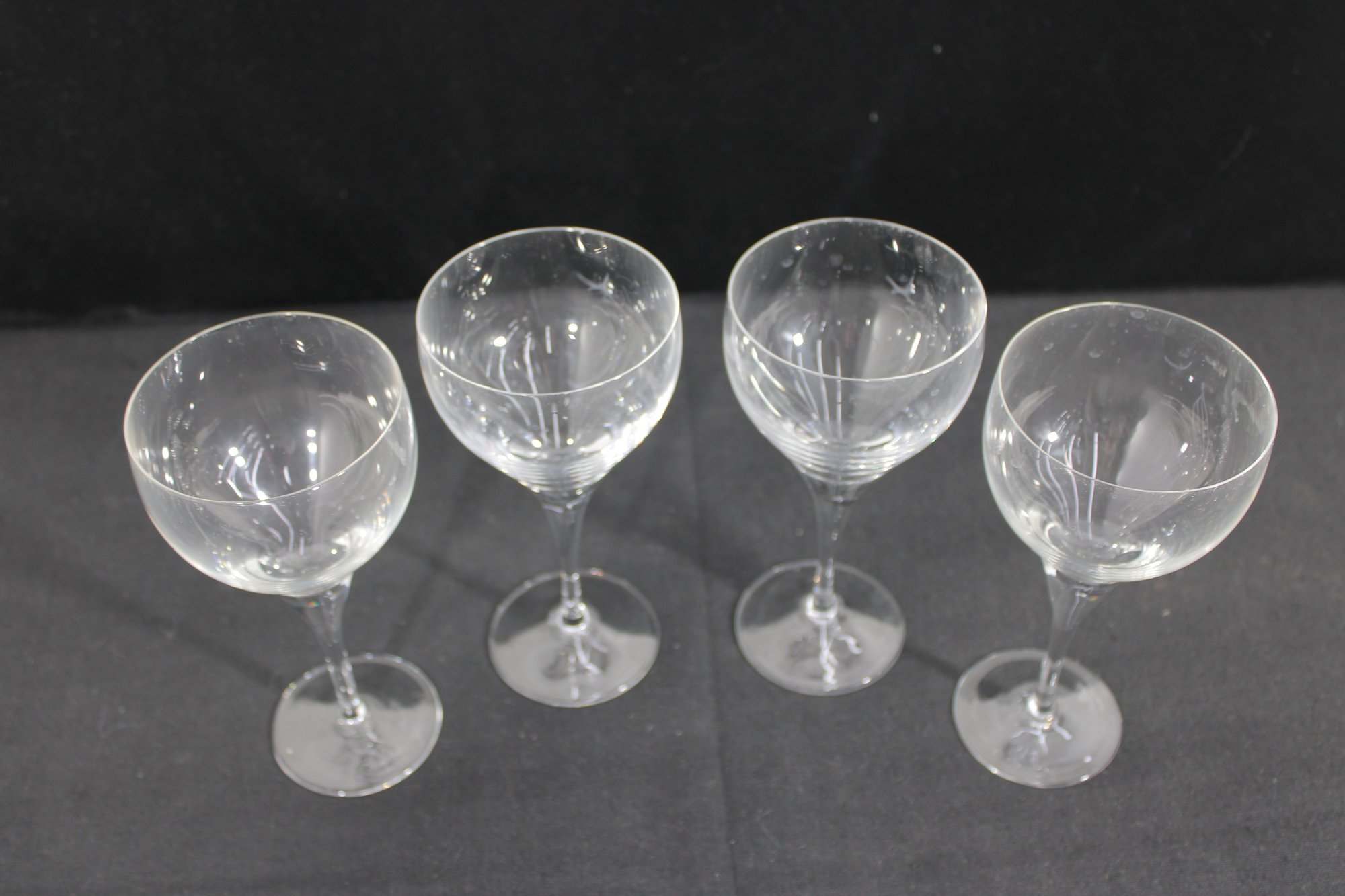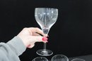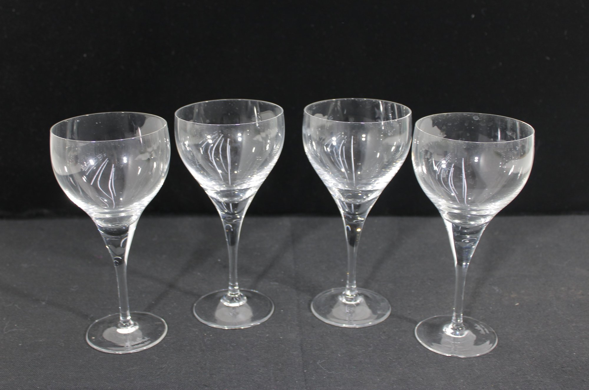 set of four vintage Rosenthal wine glasses in the desirable “Lotus Blossom” pattern. Each glass features a gracefully shaped bowl with delicate etched floral motifs, complemented by a slender stem and classic foot.