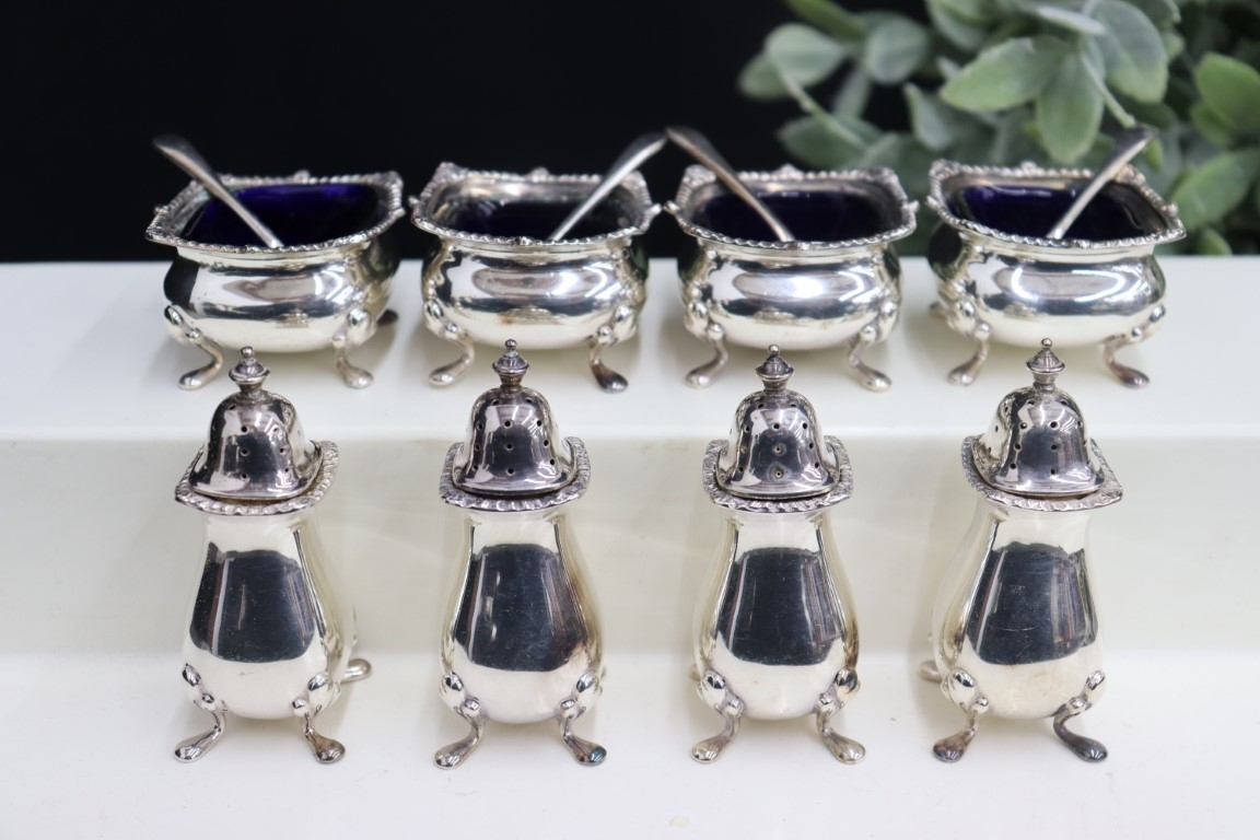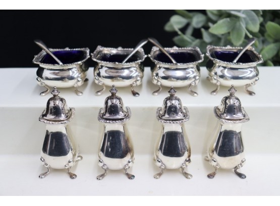 Set Of 4 Williams-Adams Polished Pepper Shakers & Salt Cellars With Cobalt Liner Insert