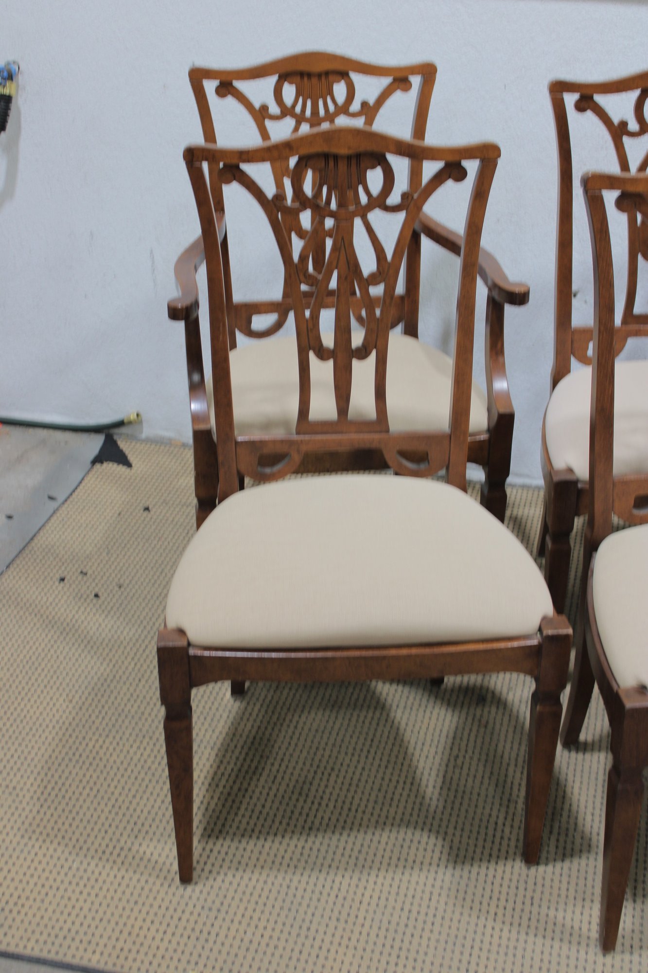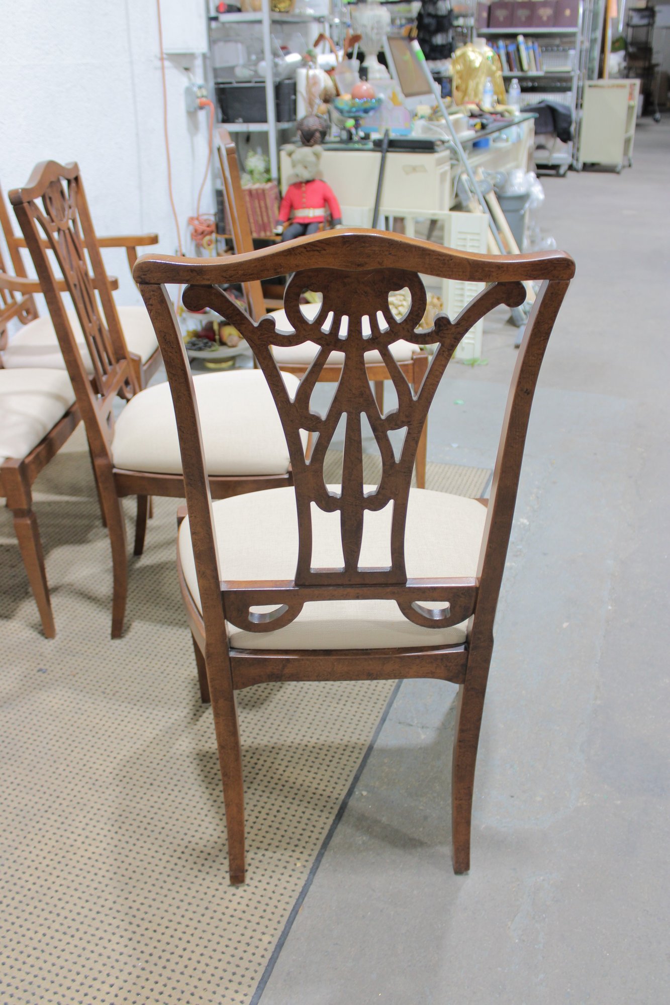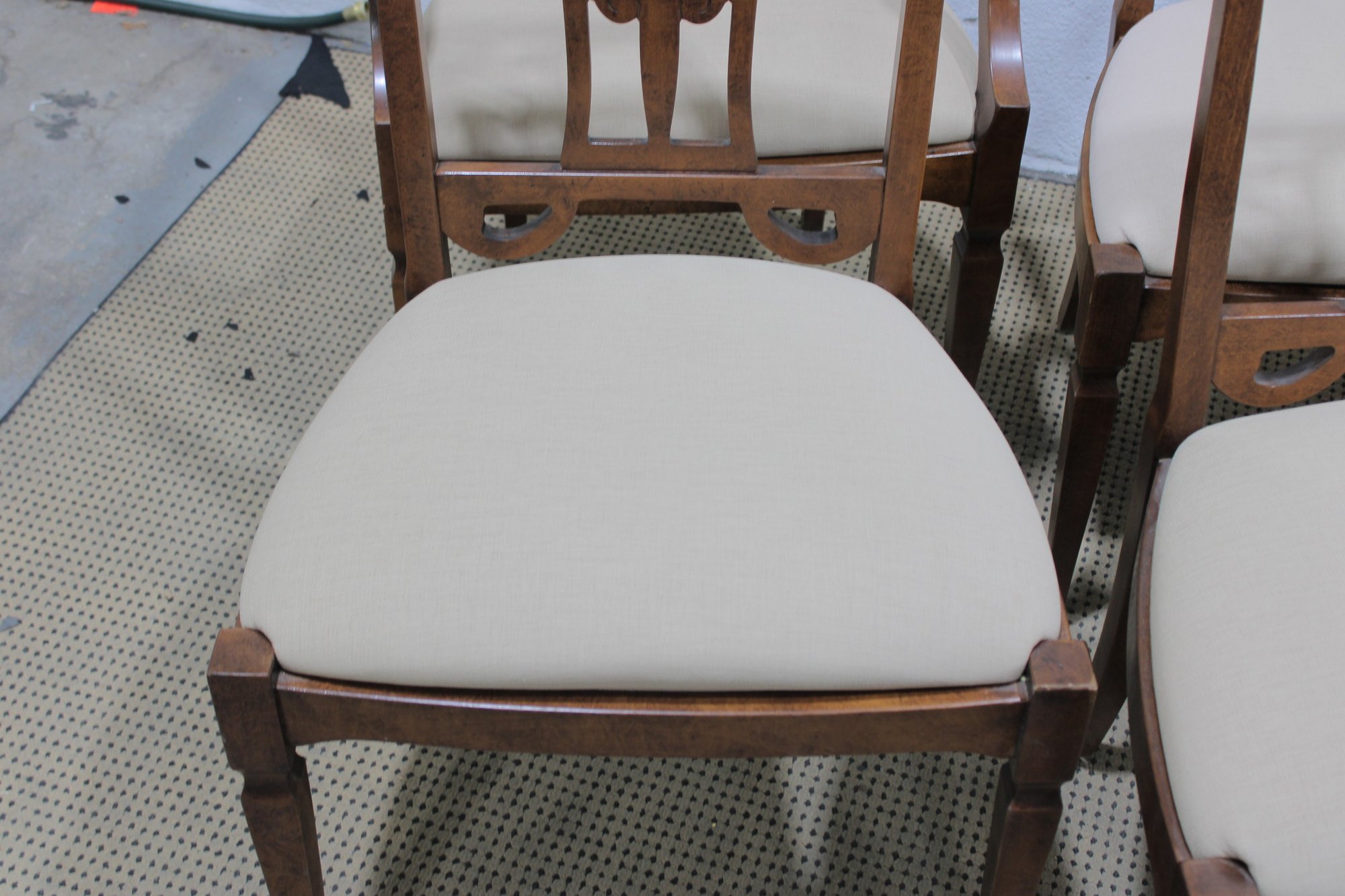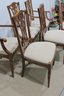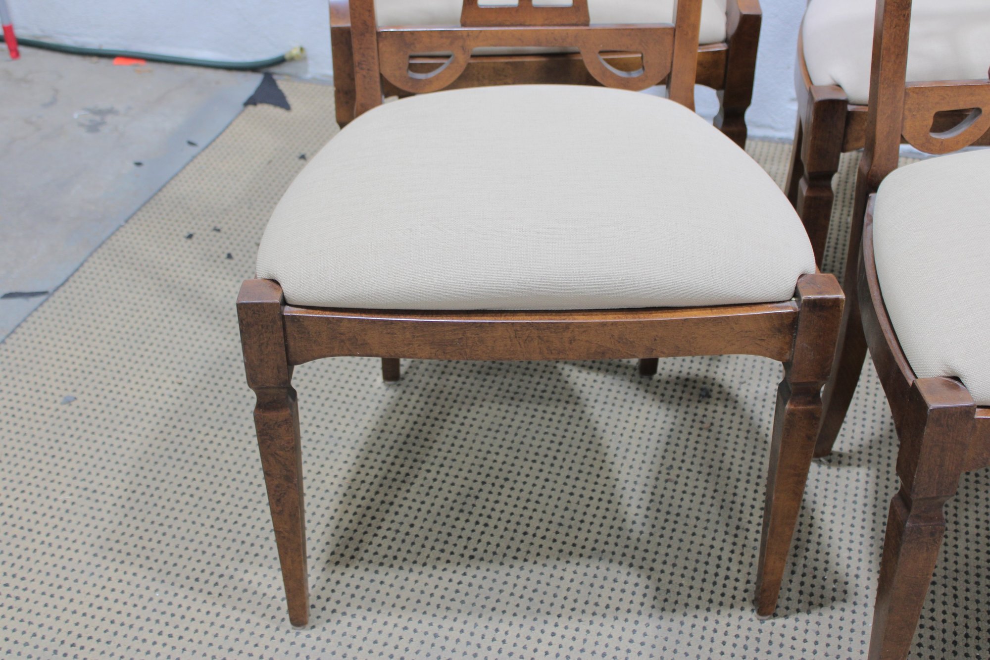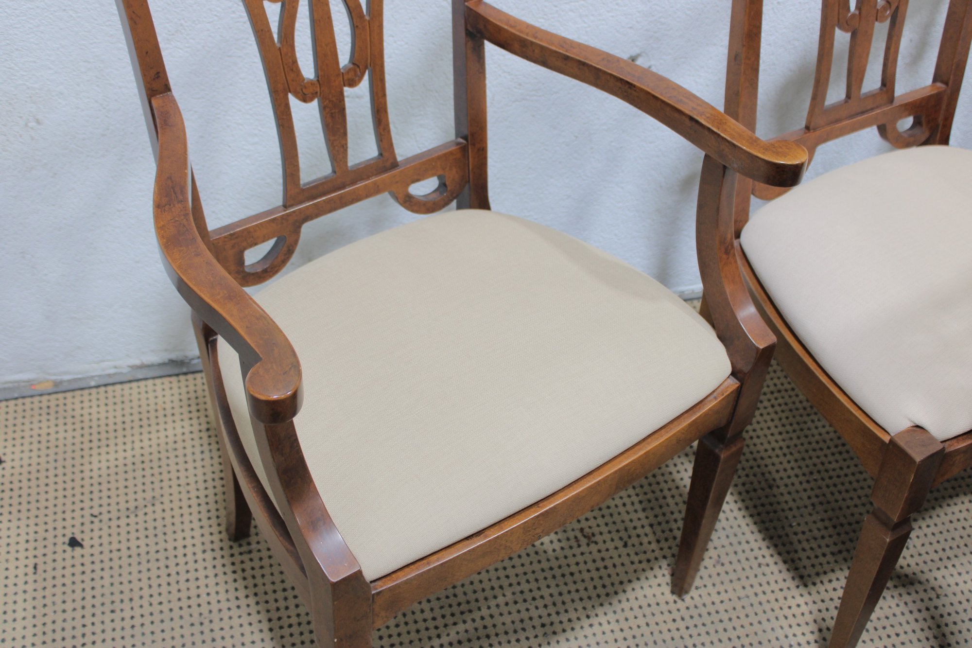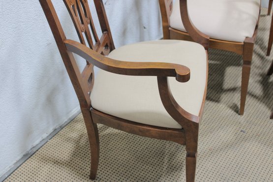Each chair is fitted with a light neutral upholstered seat, offering comfortable seating while keeping the look bright and versatile. The tapered legs and clean lines balance the decorative backs, making the set appropriate for traditional, transitional, or classic interiors.