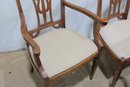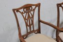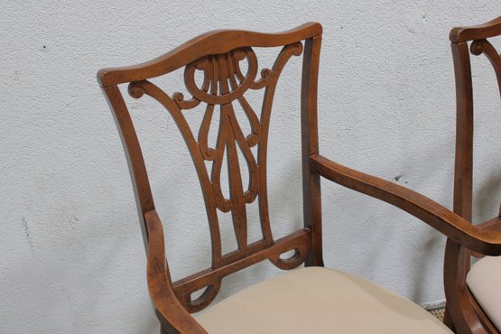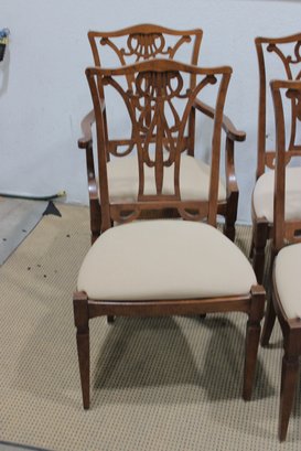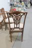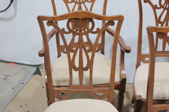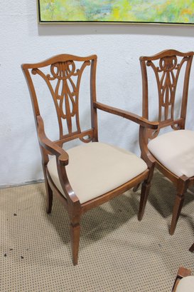 Beautiful set of 5 traditional Hepplewhite-style dining chairs featuring intricately carved open back splats and warm-toned wood frames. The elegant shield-inspired back design with geometric and curved detailing gives these chairs a refined, timeless look suited for formal dining spaces.