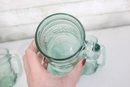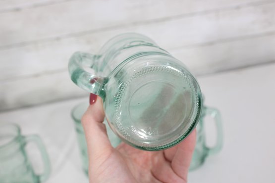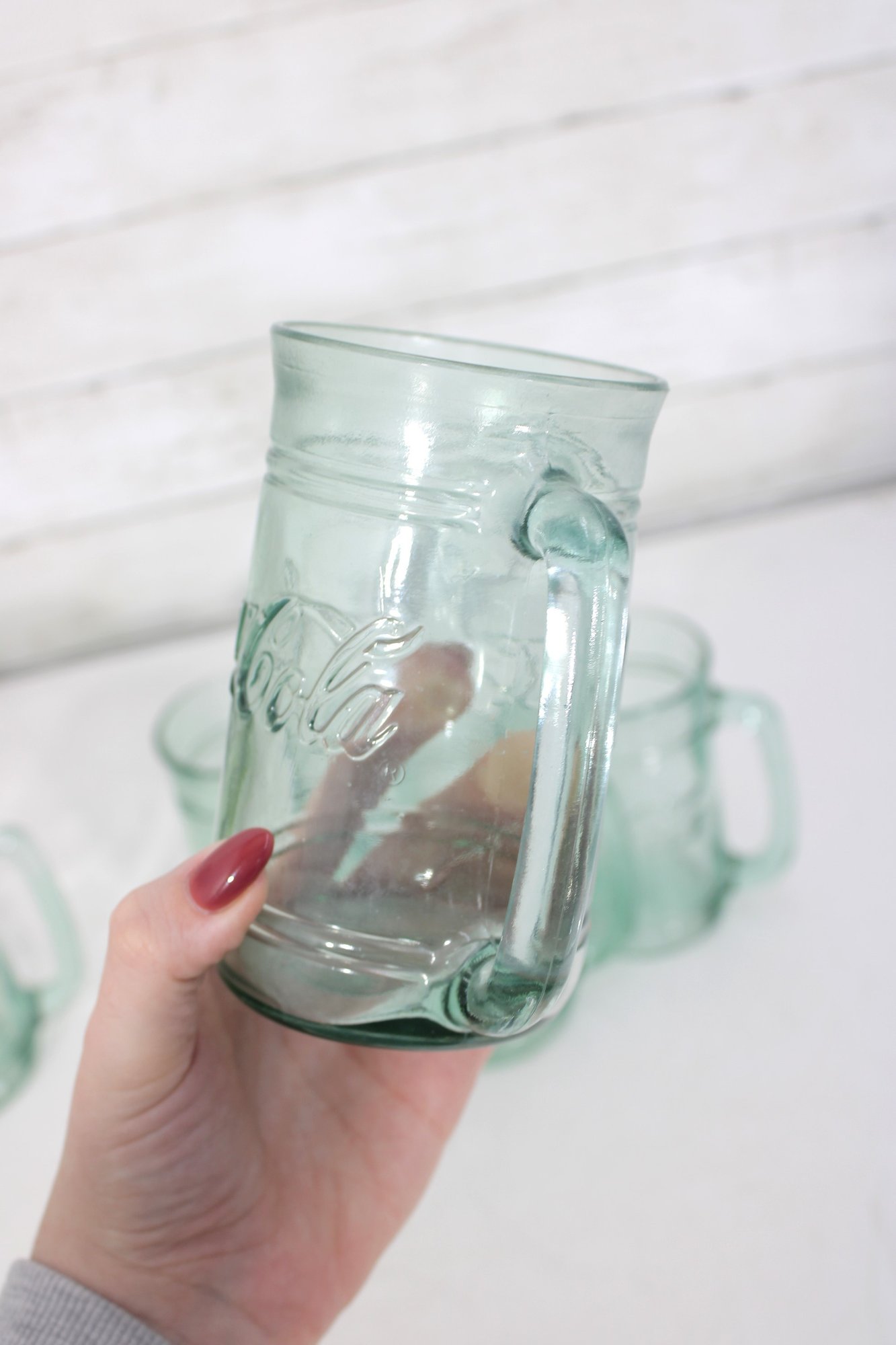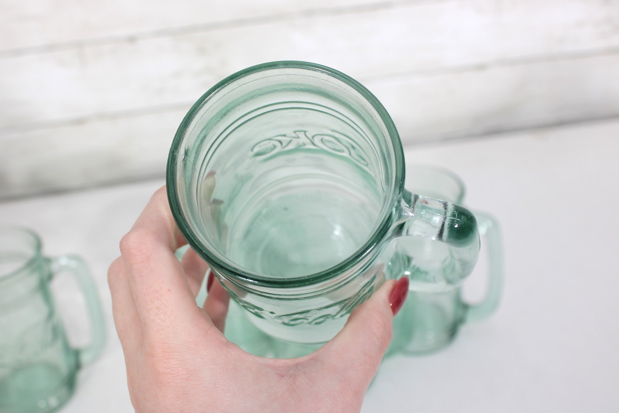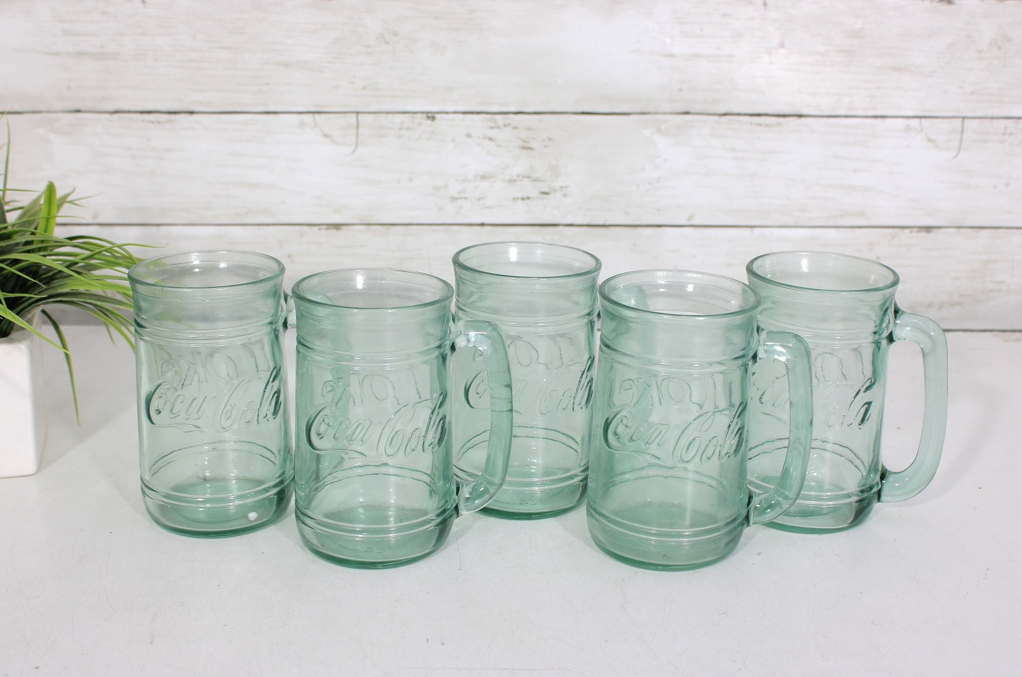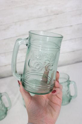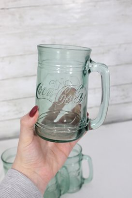 Set of five vintage Coca-Cola green glass mug steins featuring the classic raised Coca-Cola script logo on both sides. These solid glass mugs have a substantial feel with sturdy handles and a light aqua/green tint typical of retro Coca-Cola glassware.