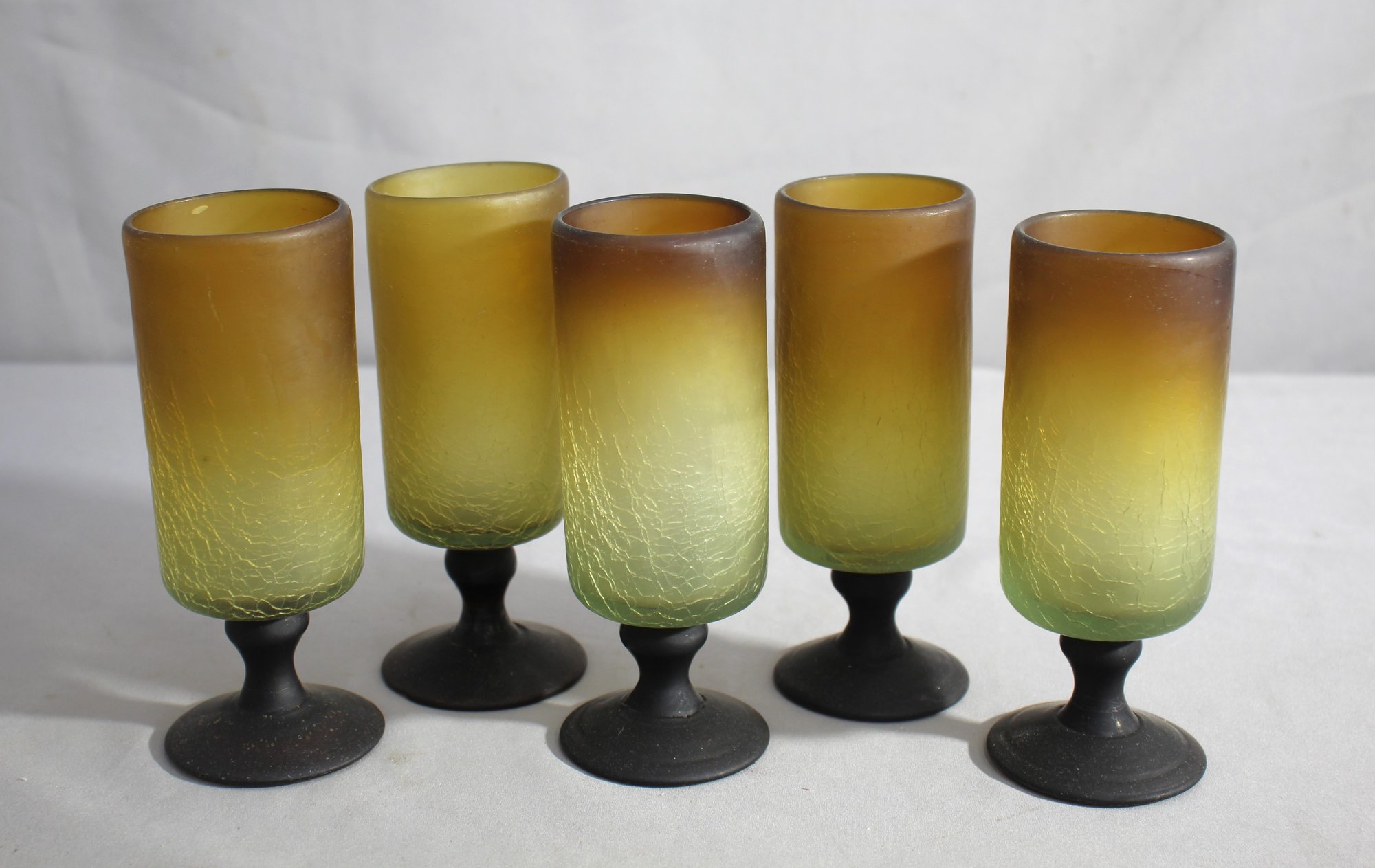 Add a touch of vintage charm to your glassware collection with this stunning set of 5 frosted glass goblets. Each goblet features a beautiful gradient from amber to green, with a delicate crackle pattern and a matte black stem and base, making them a unique and elegant addition to any table setting.