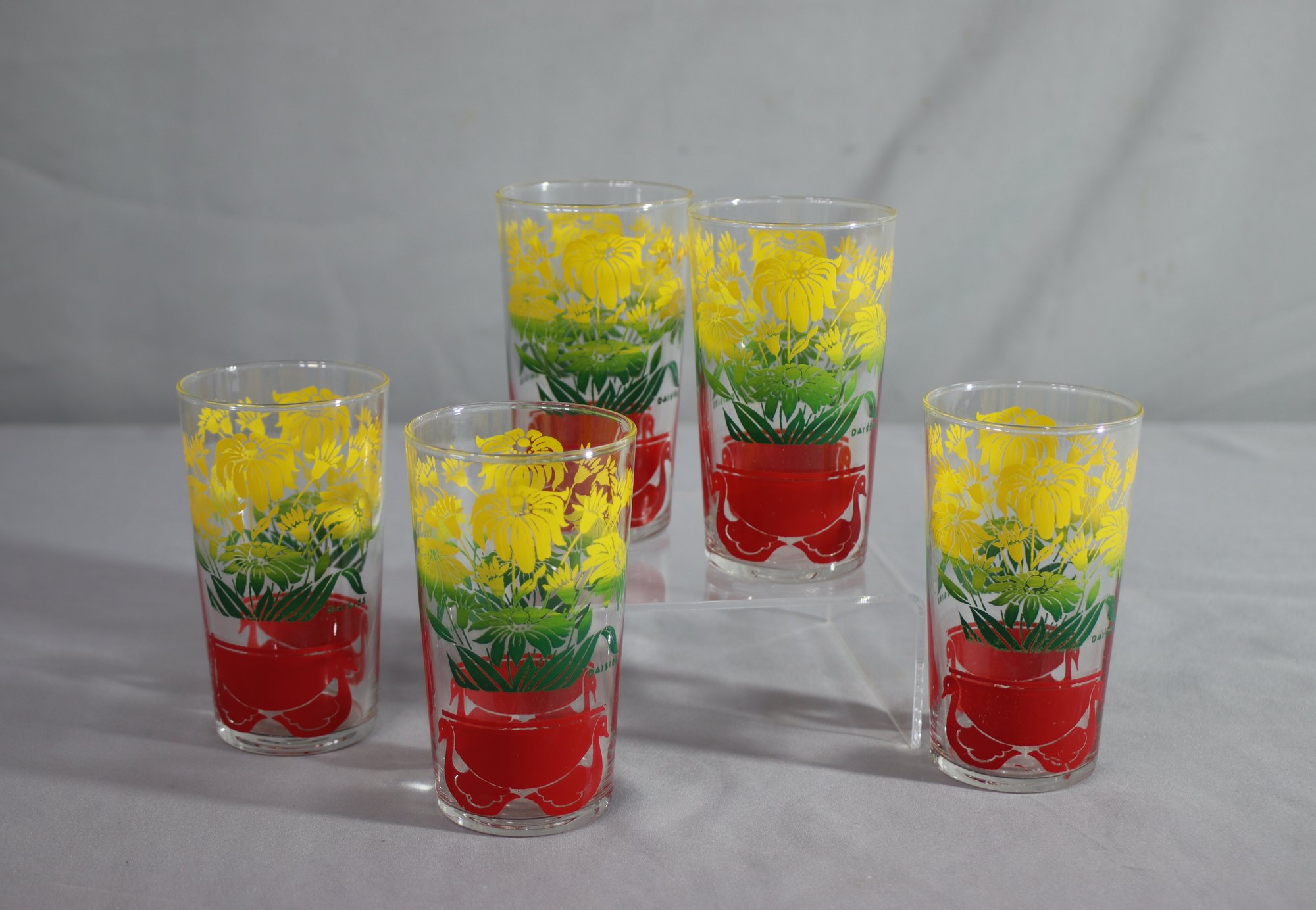 Set Of 5 Vintage Yellow Floral Drinking Glass